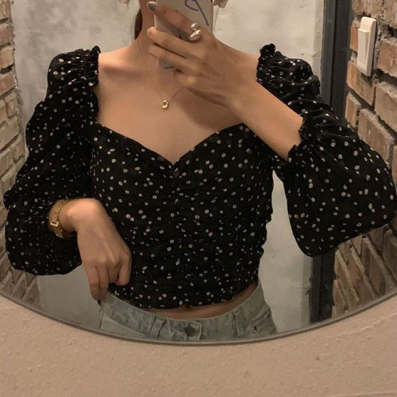 여성을위한 스퀘어 넥 짧은 꽃 무늬 쉬폰 셔츠 봄 여름 새로운 스타일 복고풍 슬림 피트 핫 소녀 퍼프 슬리브 긴팔 탑