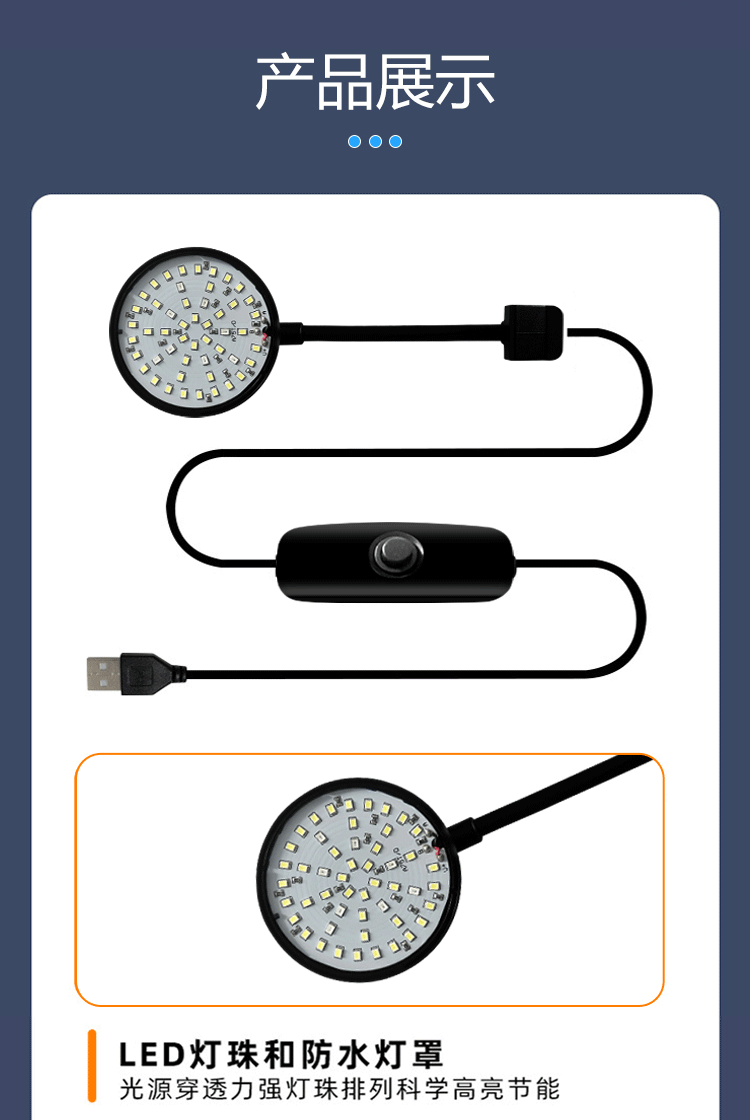 USB/开关款 5W /白蓝光 产品重量:86.4g 装箱数:100PCS 外箱尺寸:43.5*31*44.5CM 箱重:9.05kg