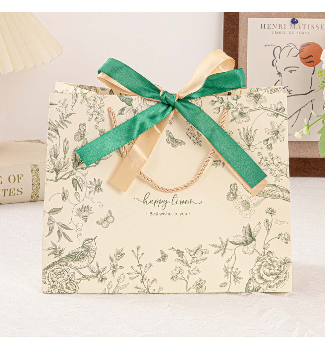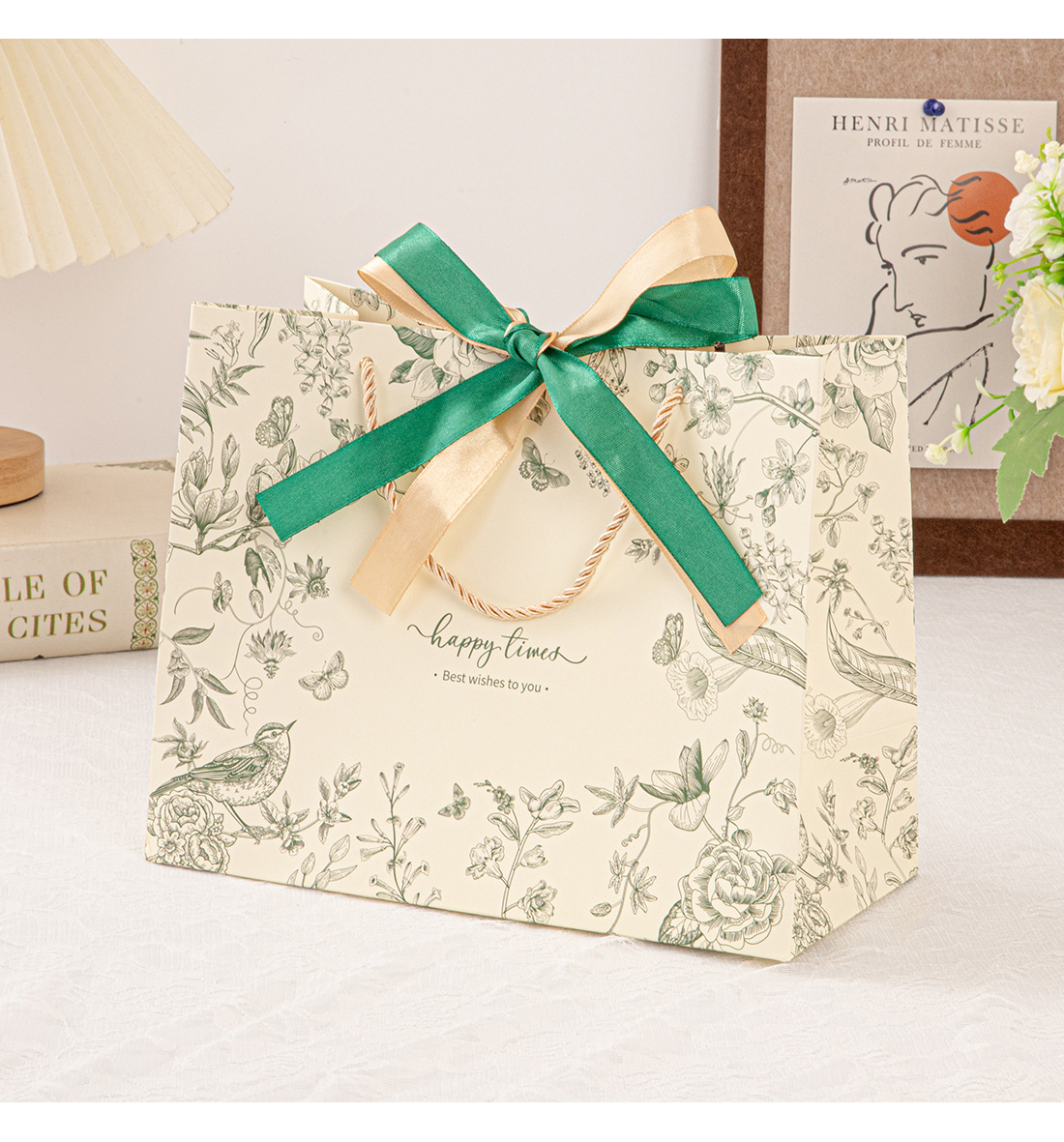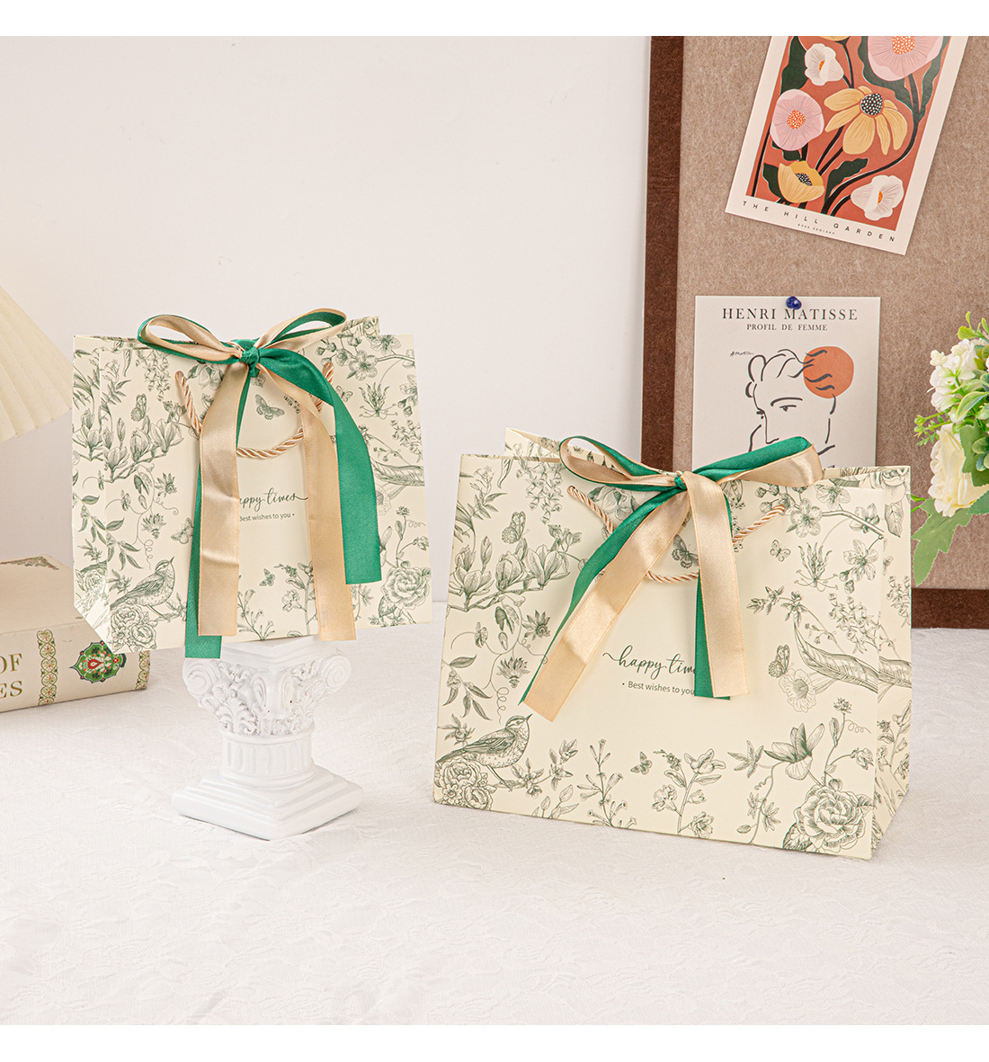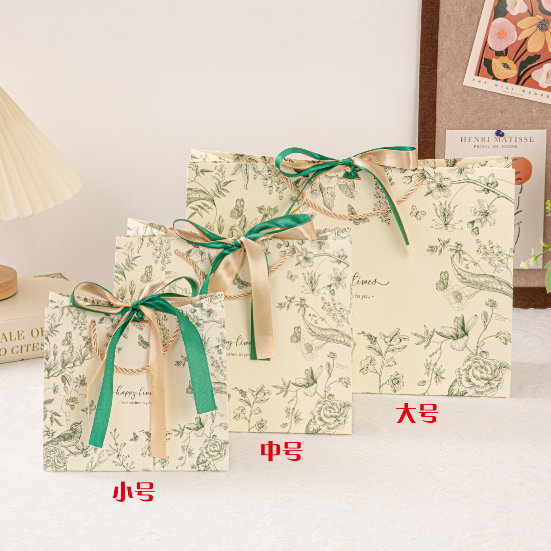 • 진한 녹색(꽃 그림자와 나비춤) 2색 리본, 흰색 판지, 중간 크기 25*20*12cm