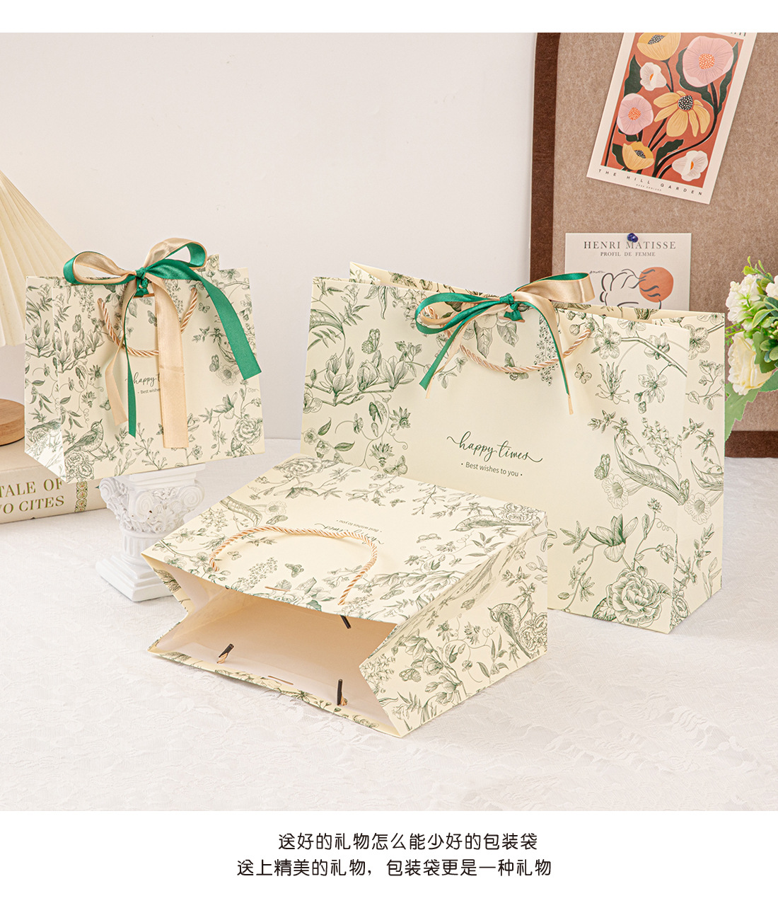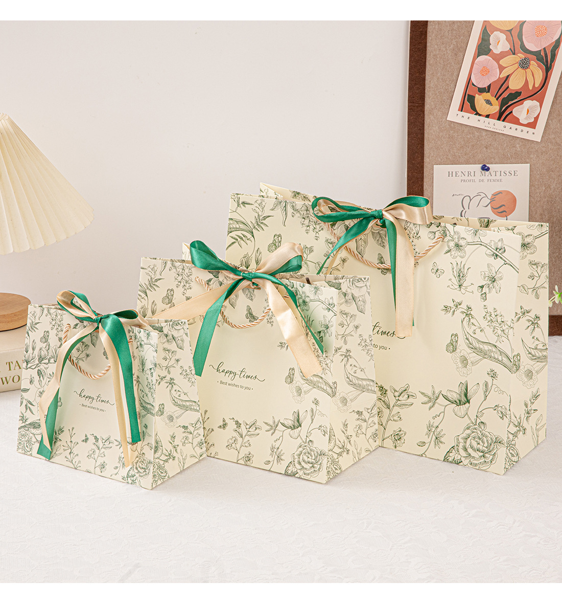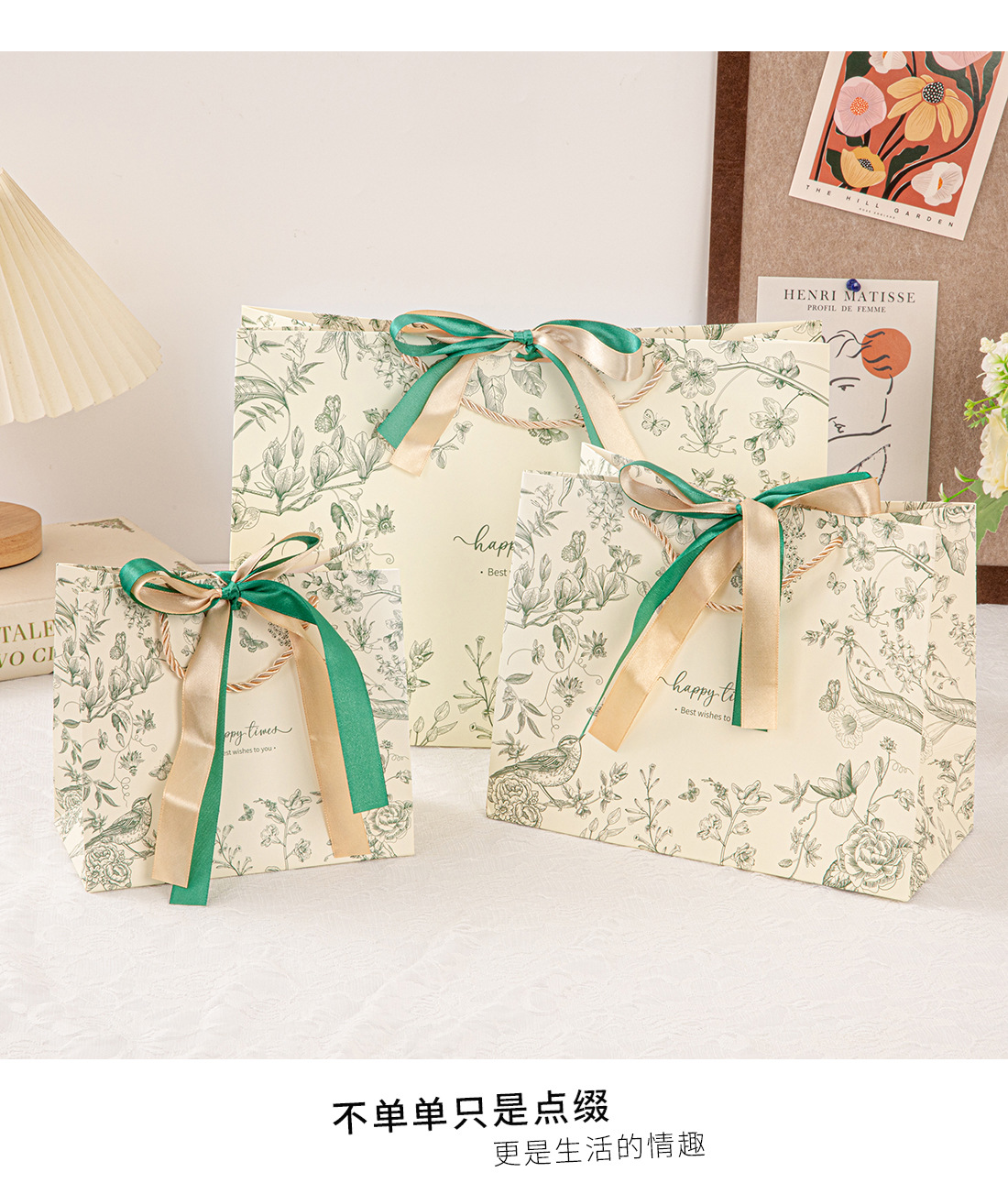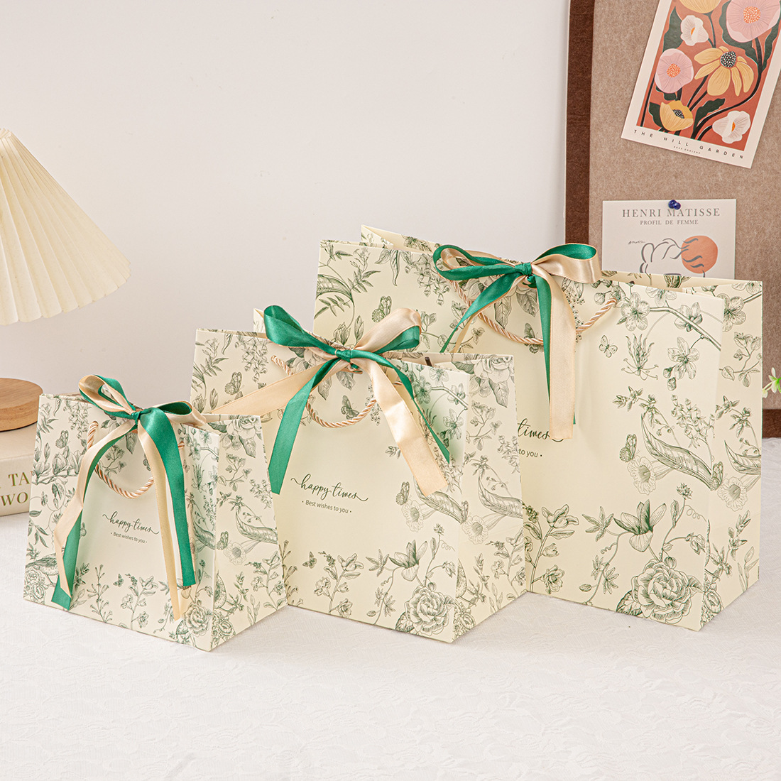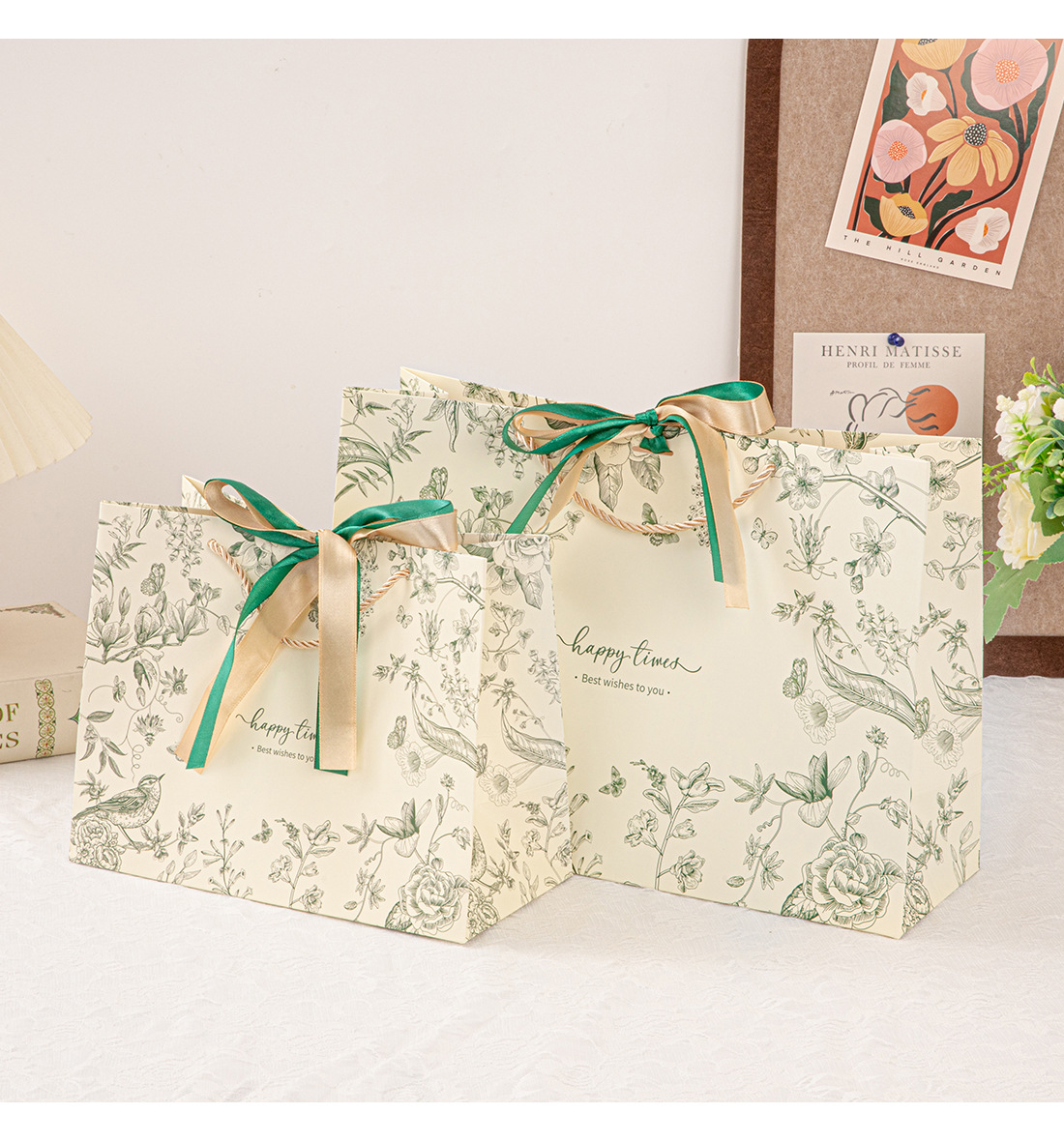 • 진한 녹색(꽃 그림자와 나비춤) 2색 리본, 흰색 판지, 중간 크기 25*20*12cm