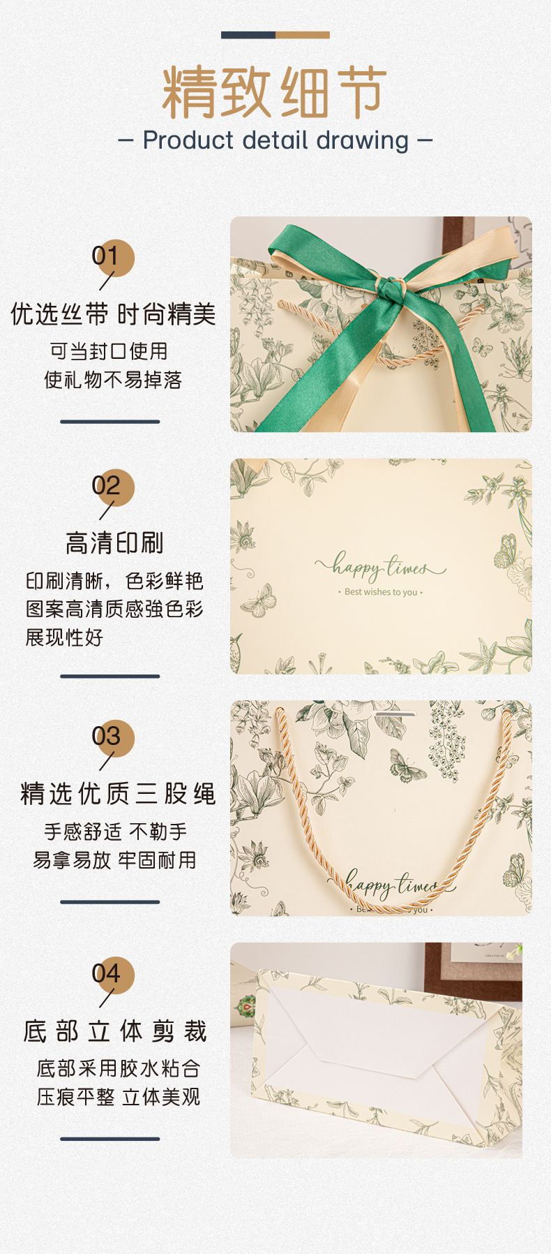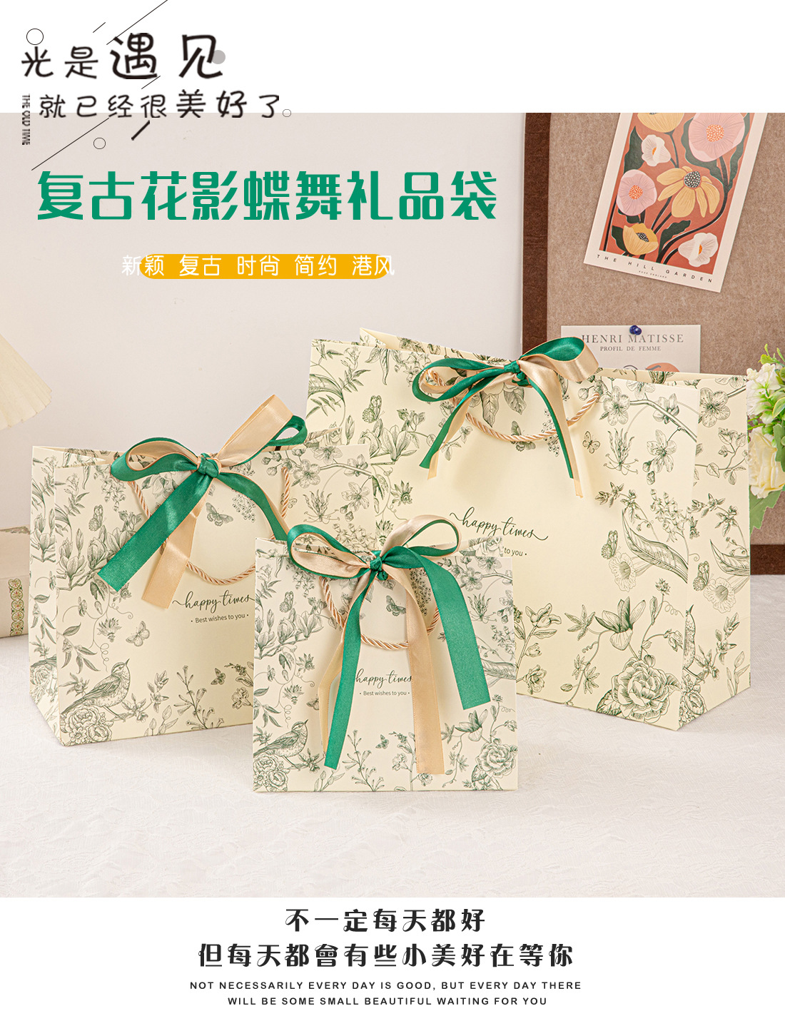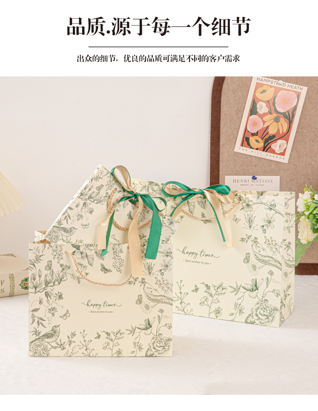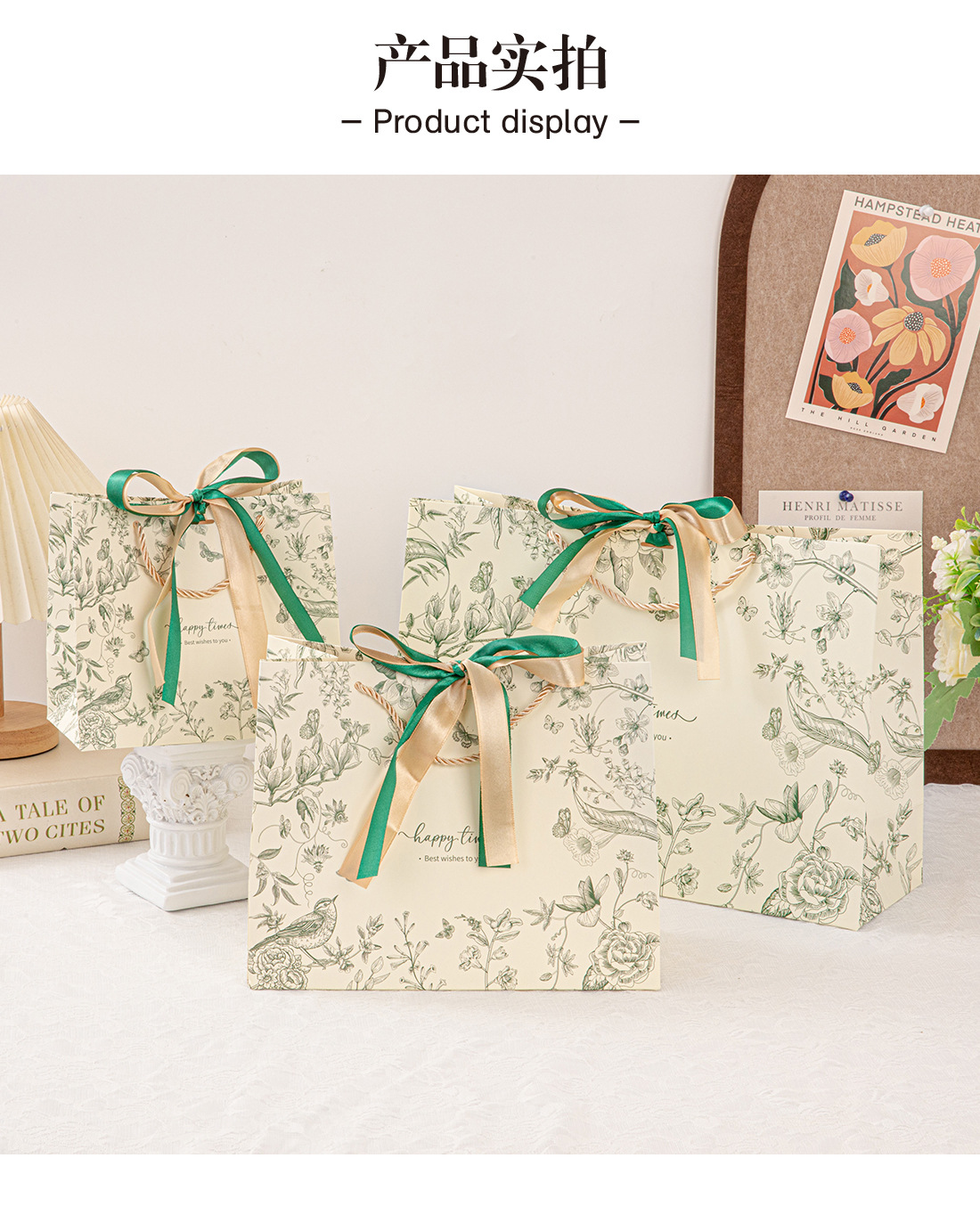 • 진한 녹색(꽃 그림자와 나비춤) 2색 리본, 흰색 판지, 중간 크기 25*20*12cm