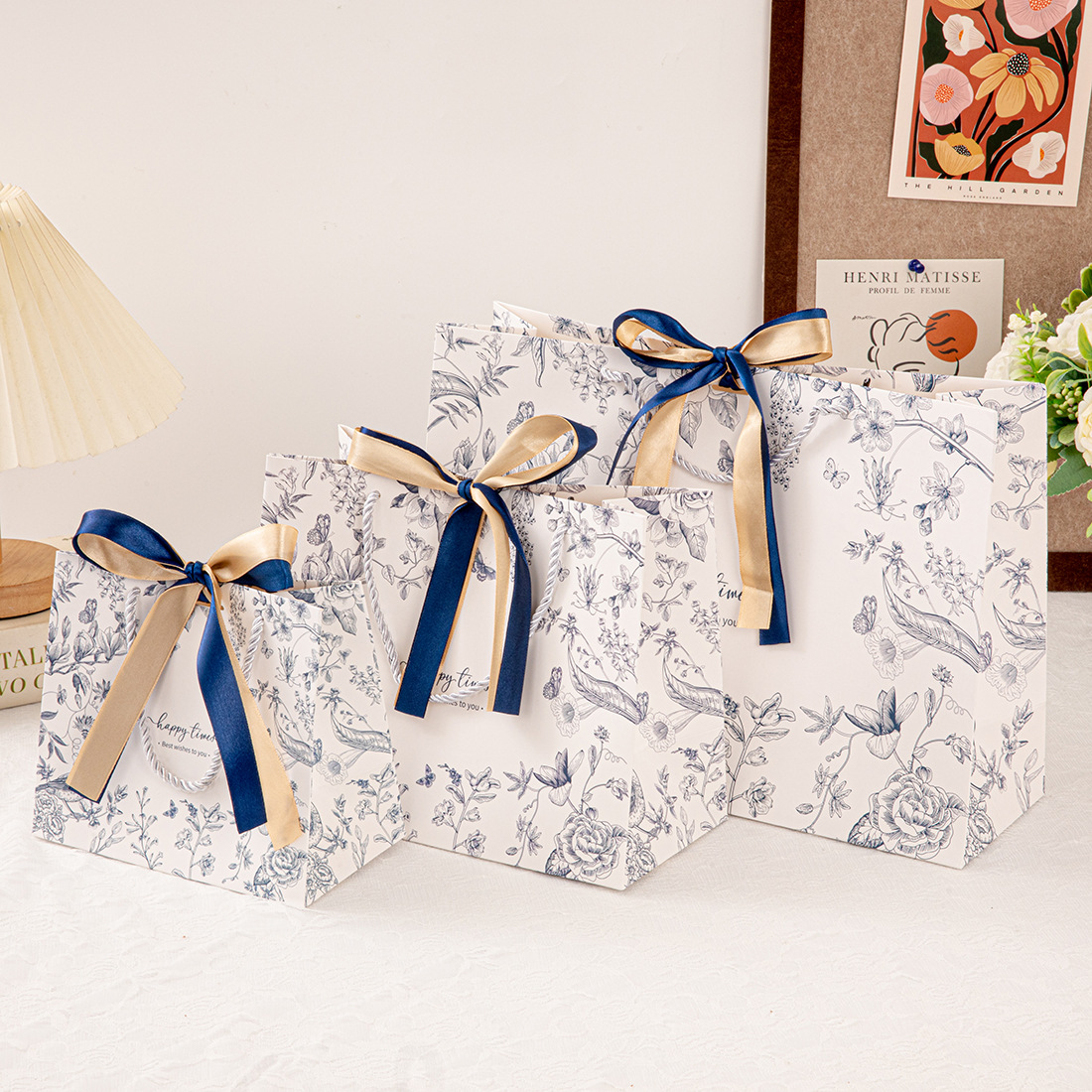 • 파란색(꽃그림자와 나비춤) 2색 리본, 흰색 판지, 중형 25*20*12cm