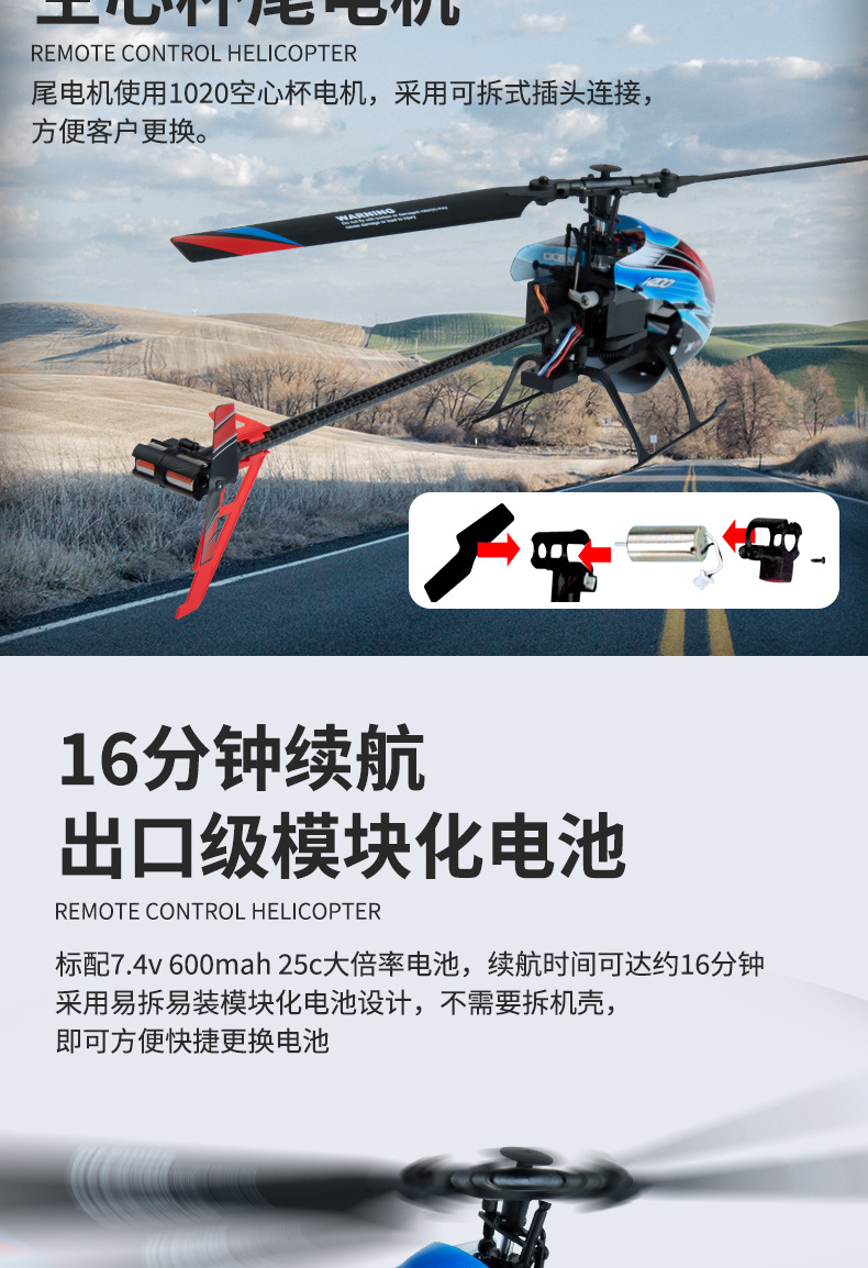 2、使用050碳刷马达加上散热片保护,使马达寿命更长久。标配7.4v 600mah 25c大倍率电池 带USB充电插头.续航时间可达约16分钟。