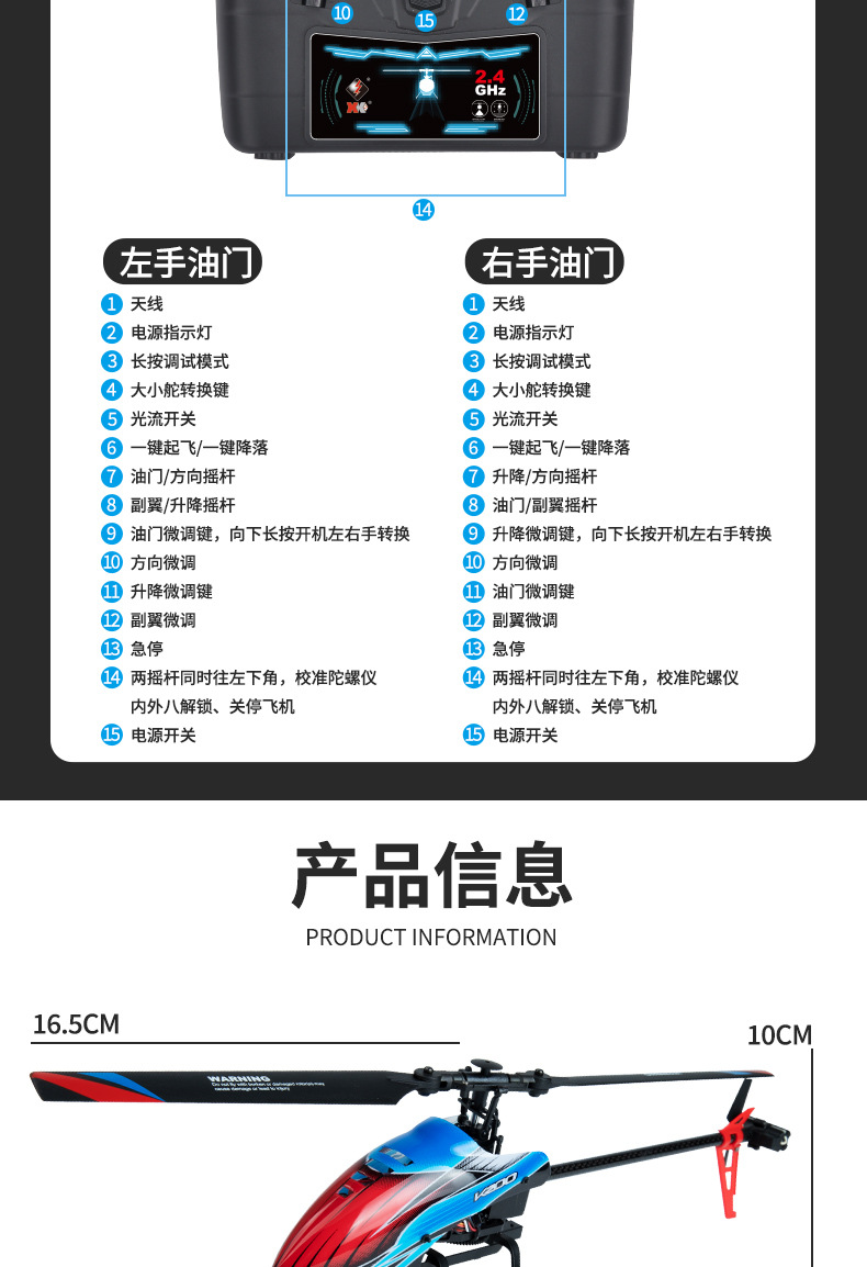 产品尺寸:旋翼直径33CM,机身长度30CM,高度10CM