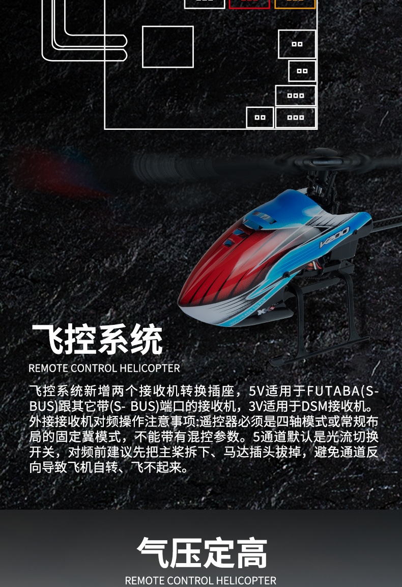 7、飞控系统新增两个接收机转换插座,5V适用于FUTABA(S-BUS)跟其它带(S-BUS)端口的接收机,3V适用于DSM接收机。