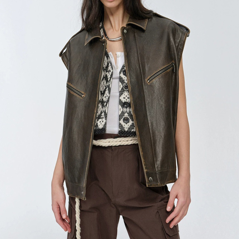 천연 가죽 자켓, 식물성 소가죽 소매, 탈부착 가능한 와이드 버전, 여성용 레트로 디스트레스드 오토바이 라펠 재킷