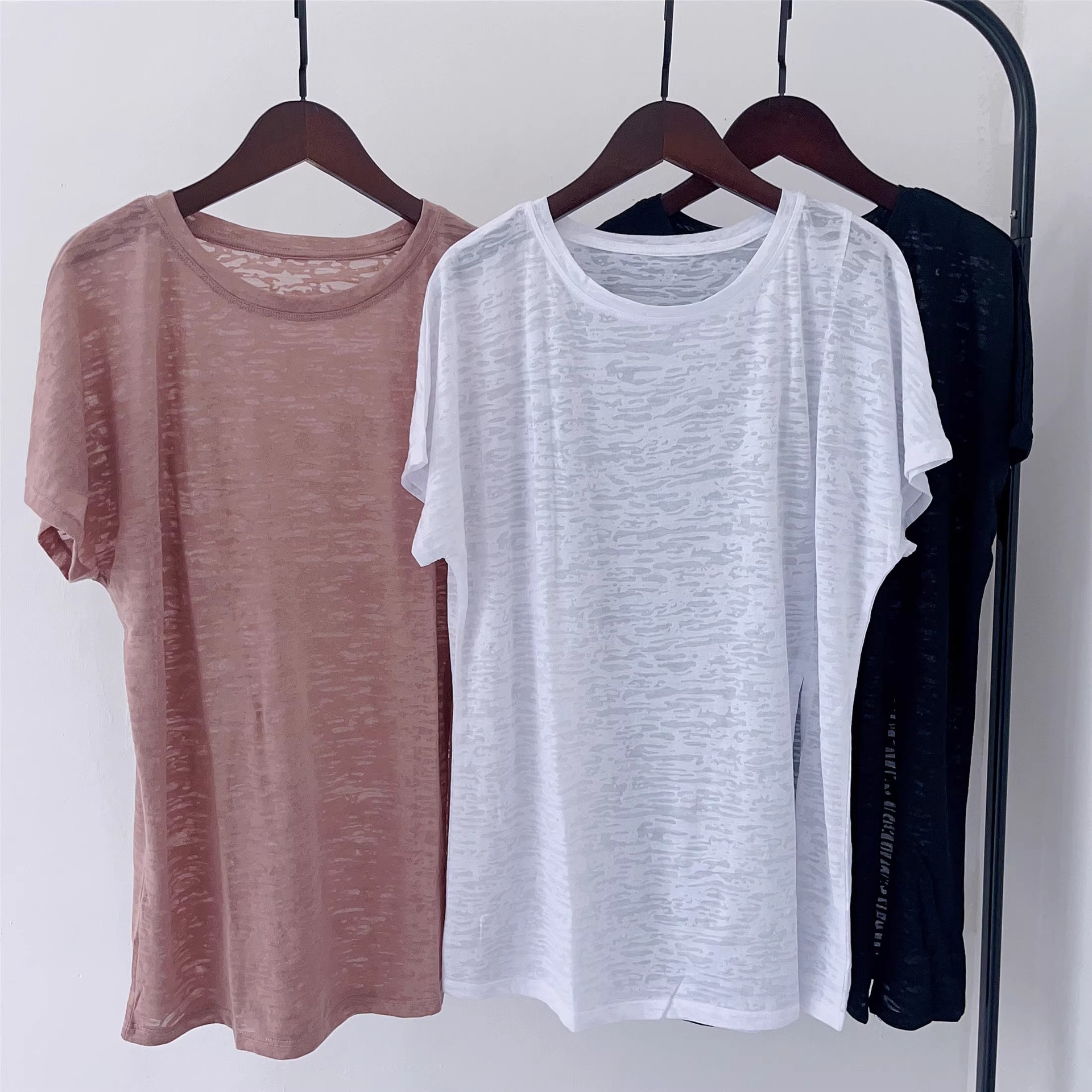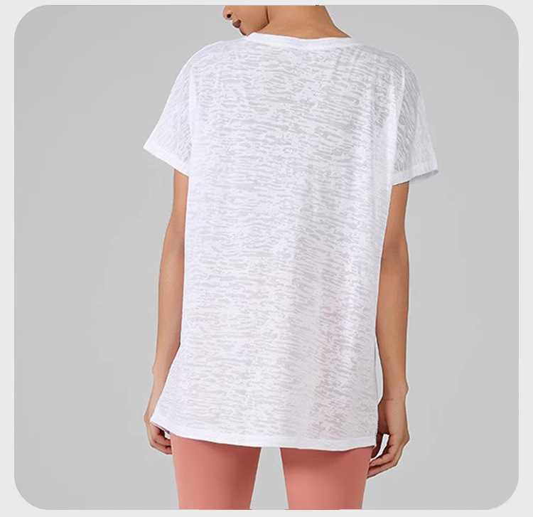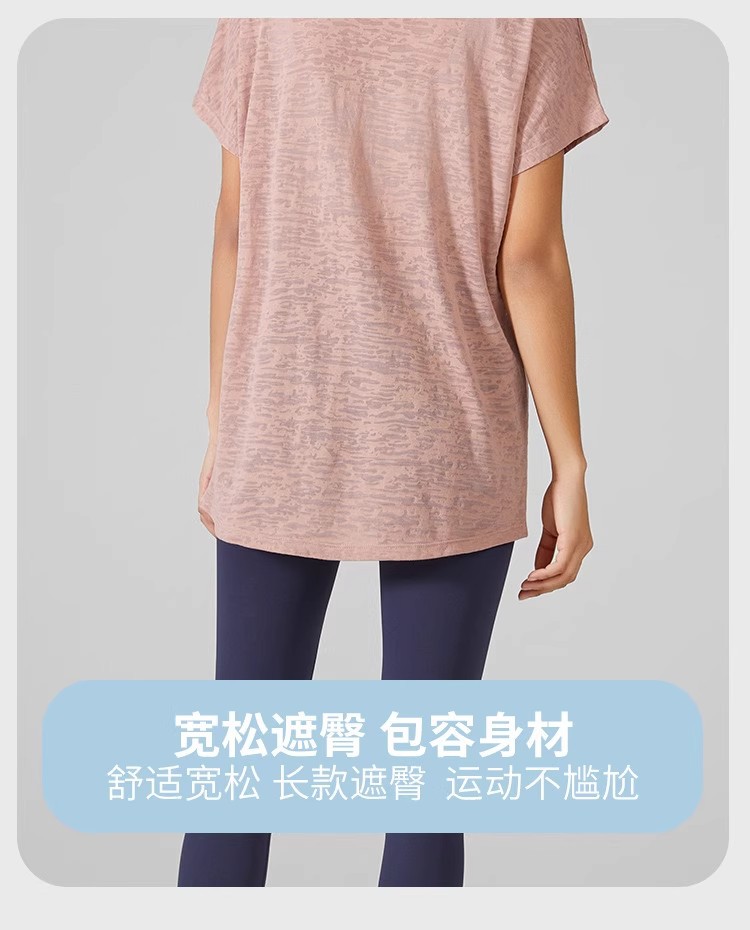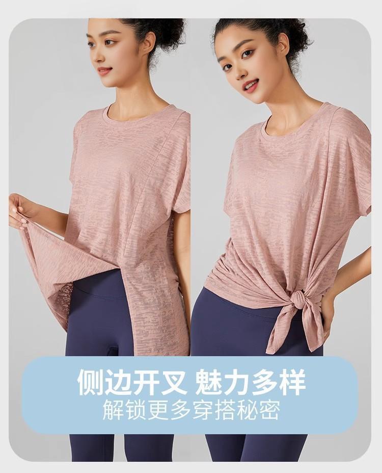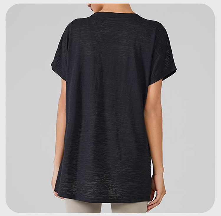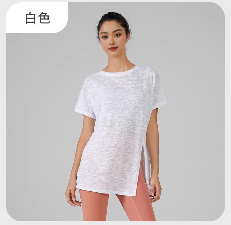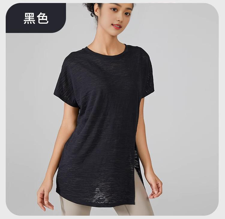 엉덩이를 덮는 중간 길이의 가볍고 통기성이 뛰어난 여성용 요가 커버업, 슬릿 반팔, 루즈한 런닝 피트니스 스포츠 탑