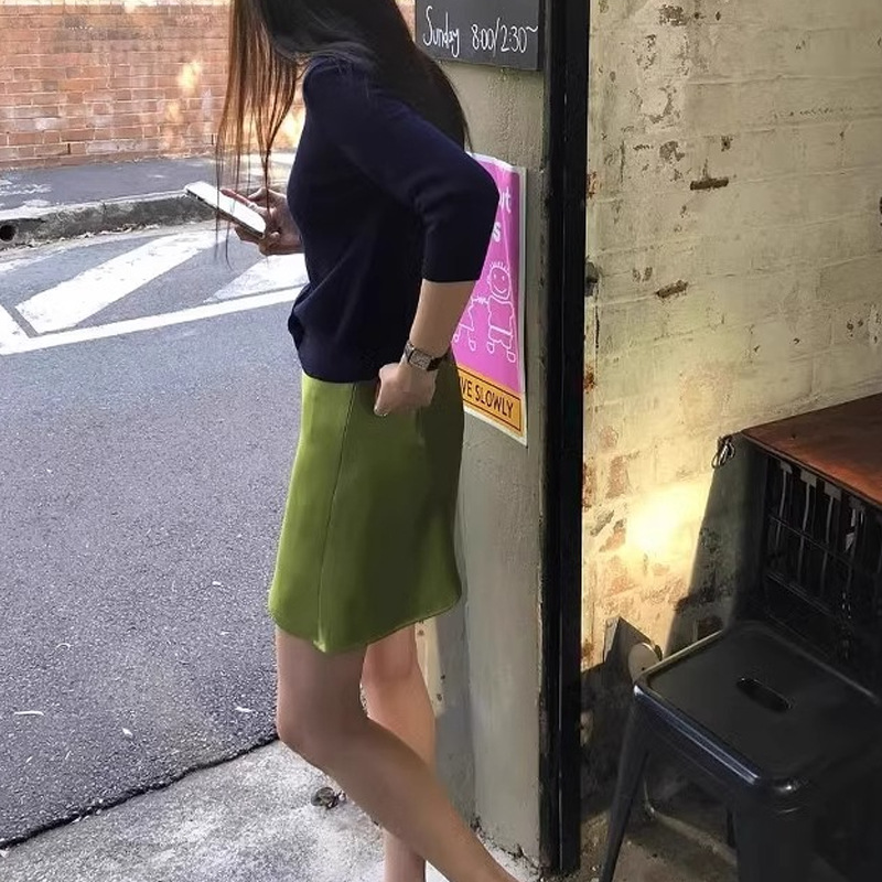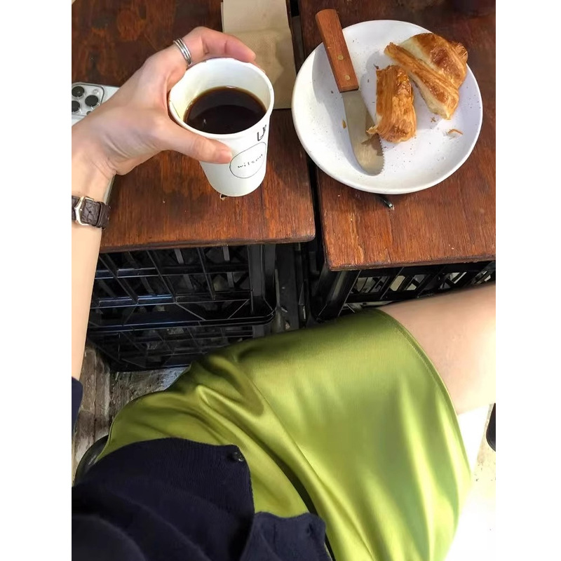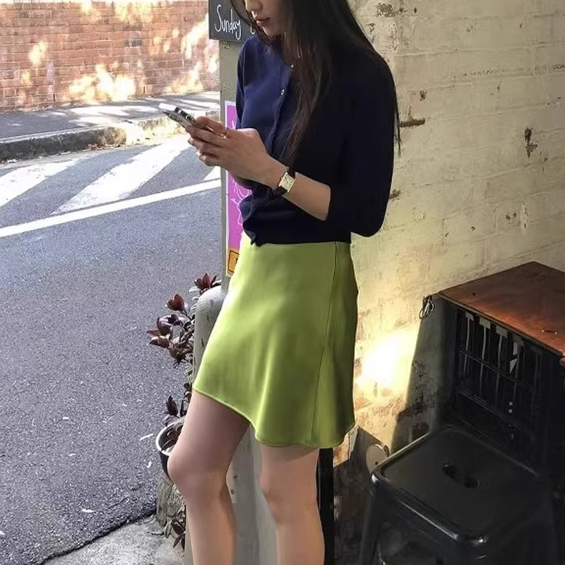 여성을위한 과일 녹색 새틴 광택 아세테이트 짧은 치마 여름 새로운 하이 웨이스트 바이어스 컷 a 라인 스커트 미니 피쉬 테일 스커트스토어 가기