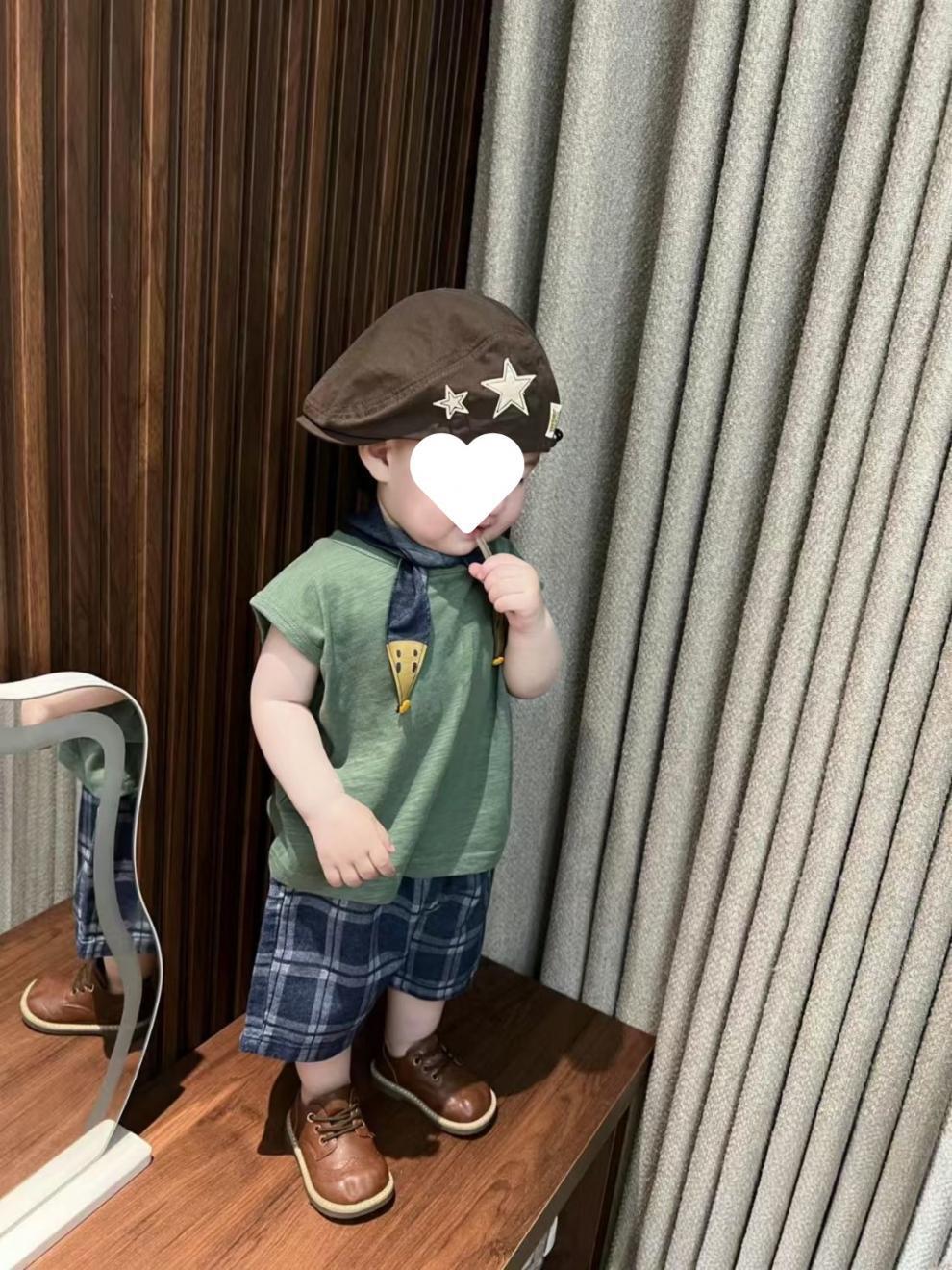 • 녹색 조끼 + 체크무늬 반바지 [투피스 세트] 스카프 없음