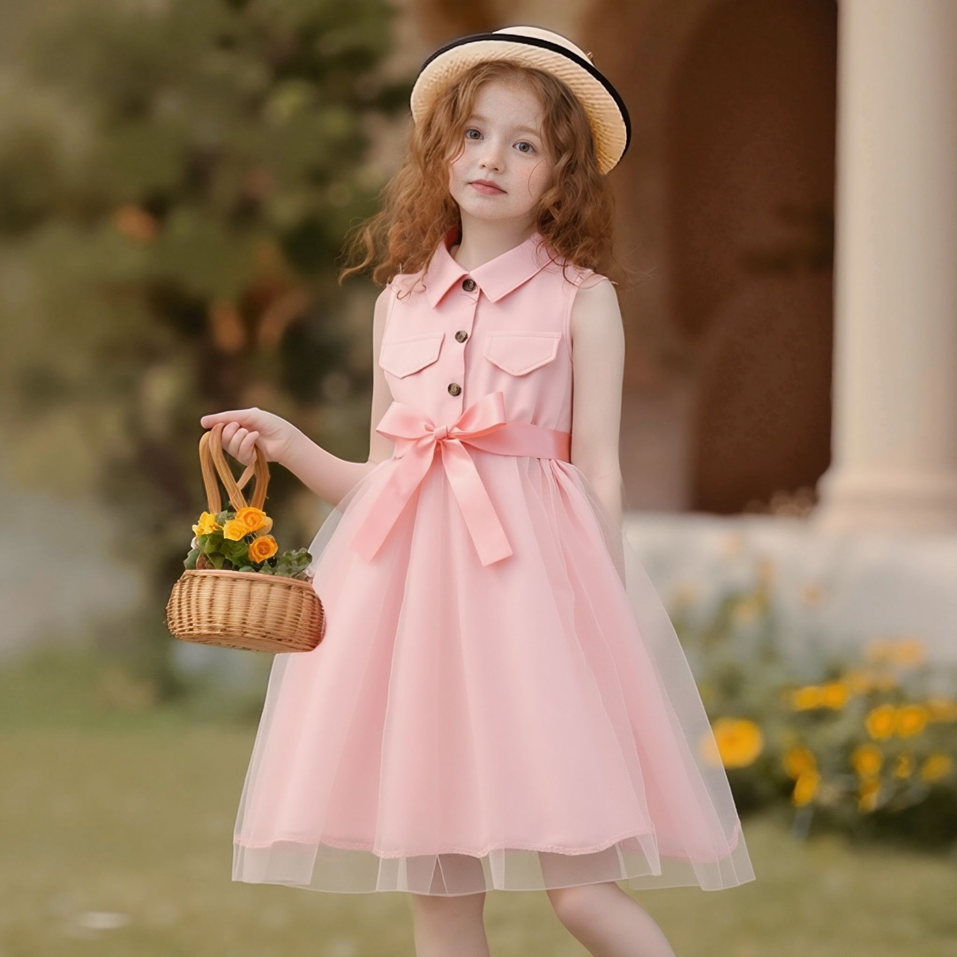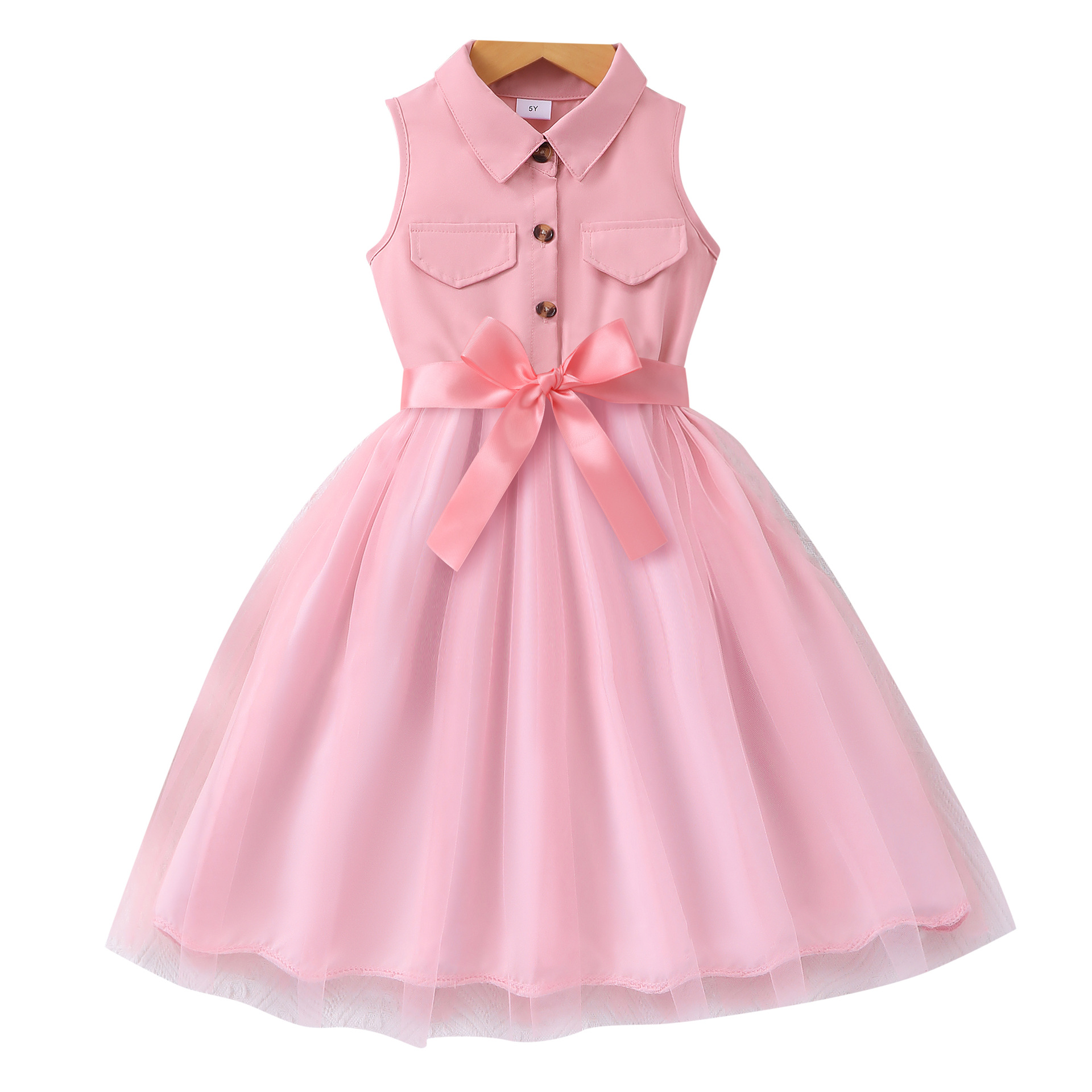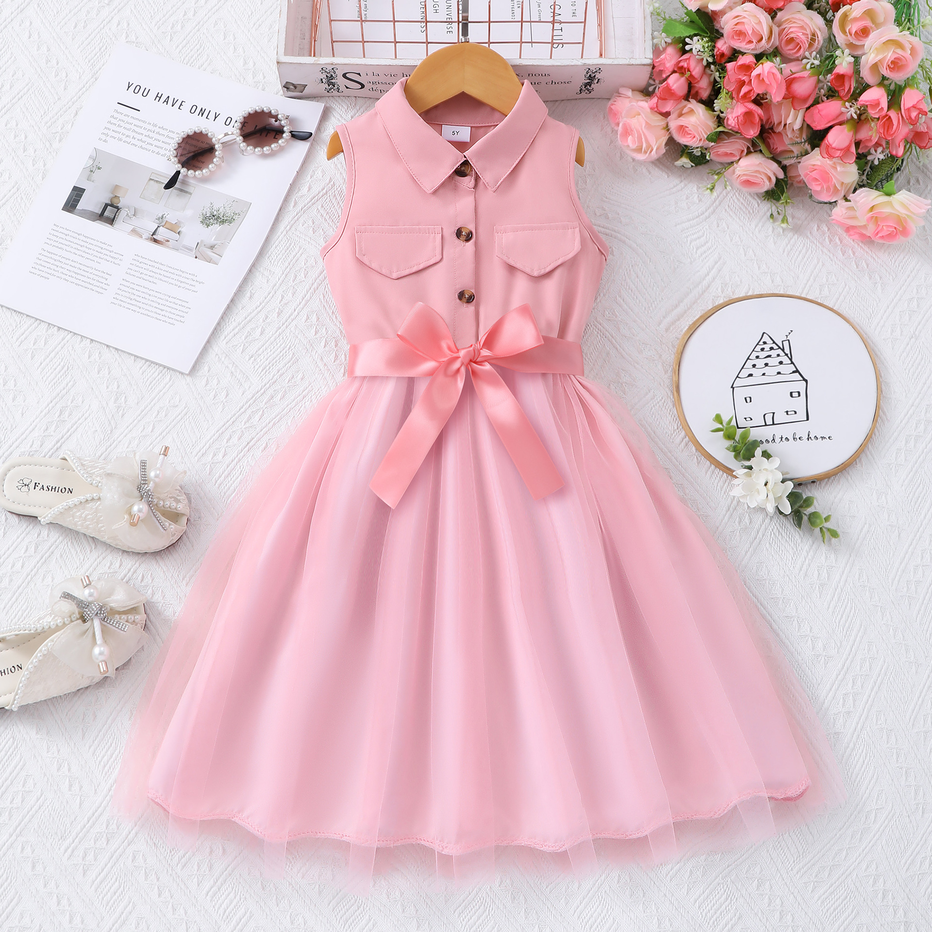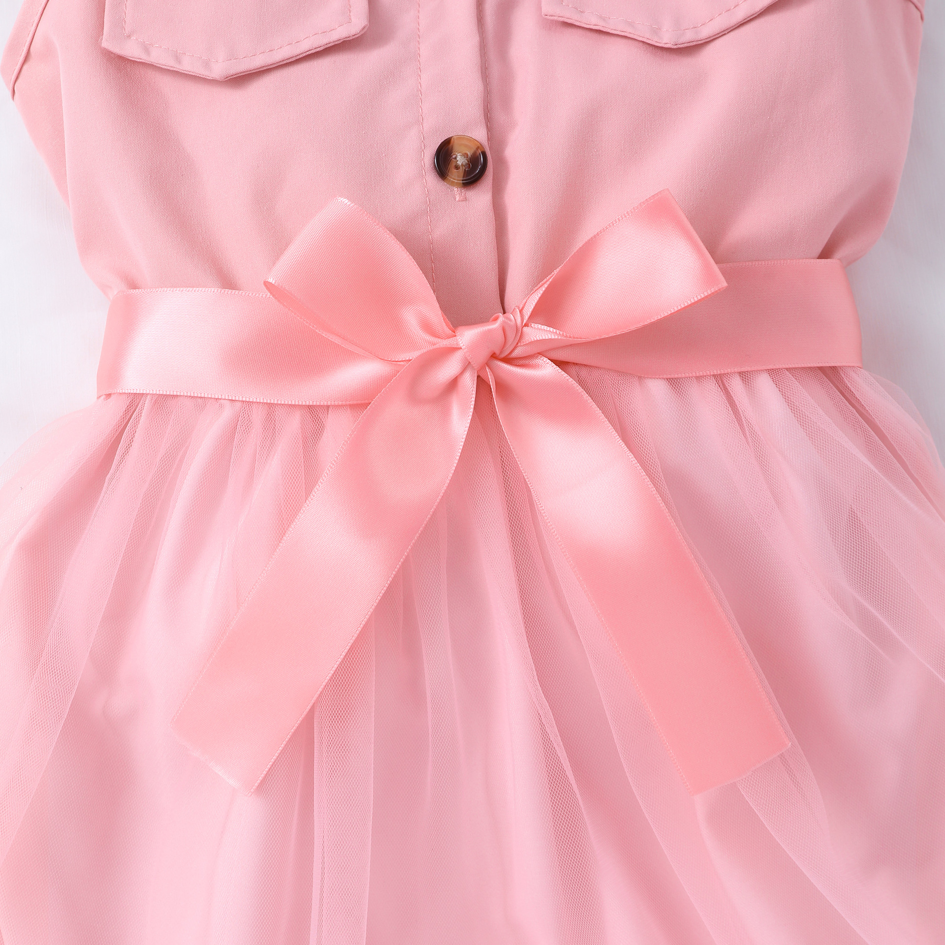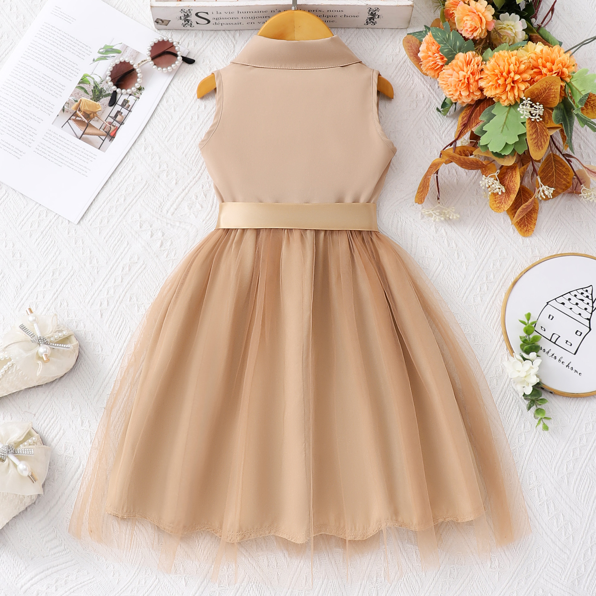여아(사이즈) 드레스, 솔리드 컬러 민소매 라펠 메쉬 드레스, 직조 벨트 포함