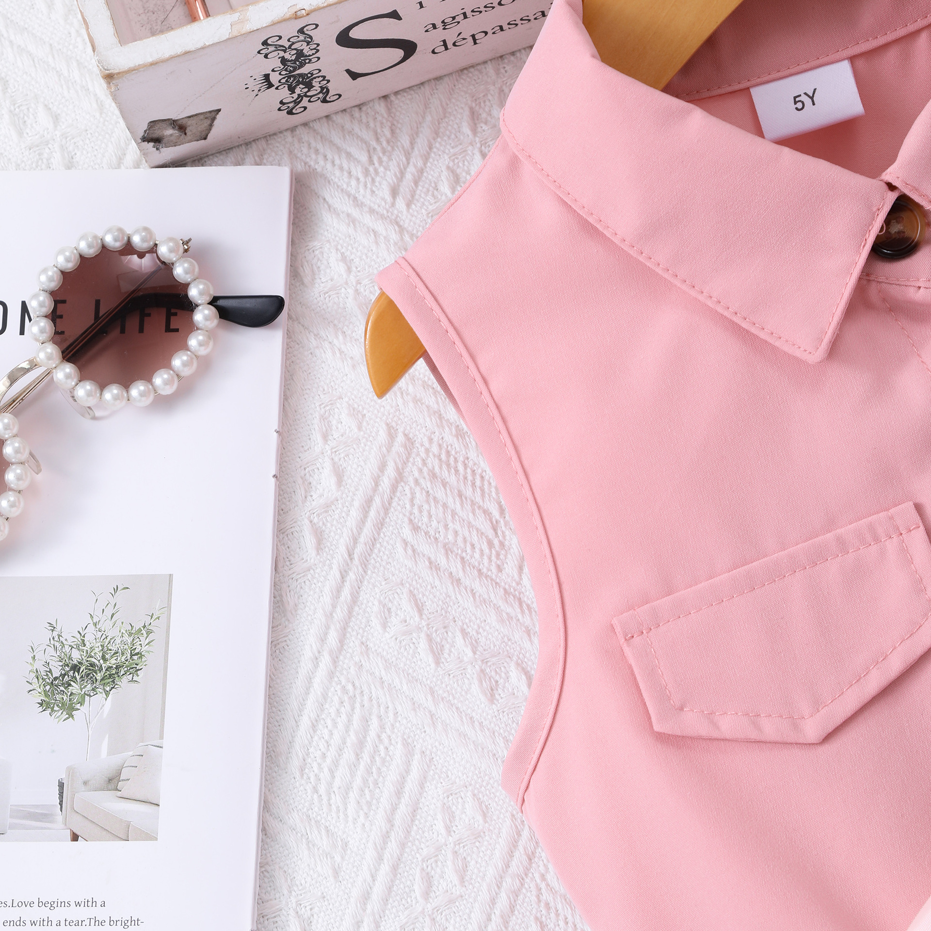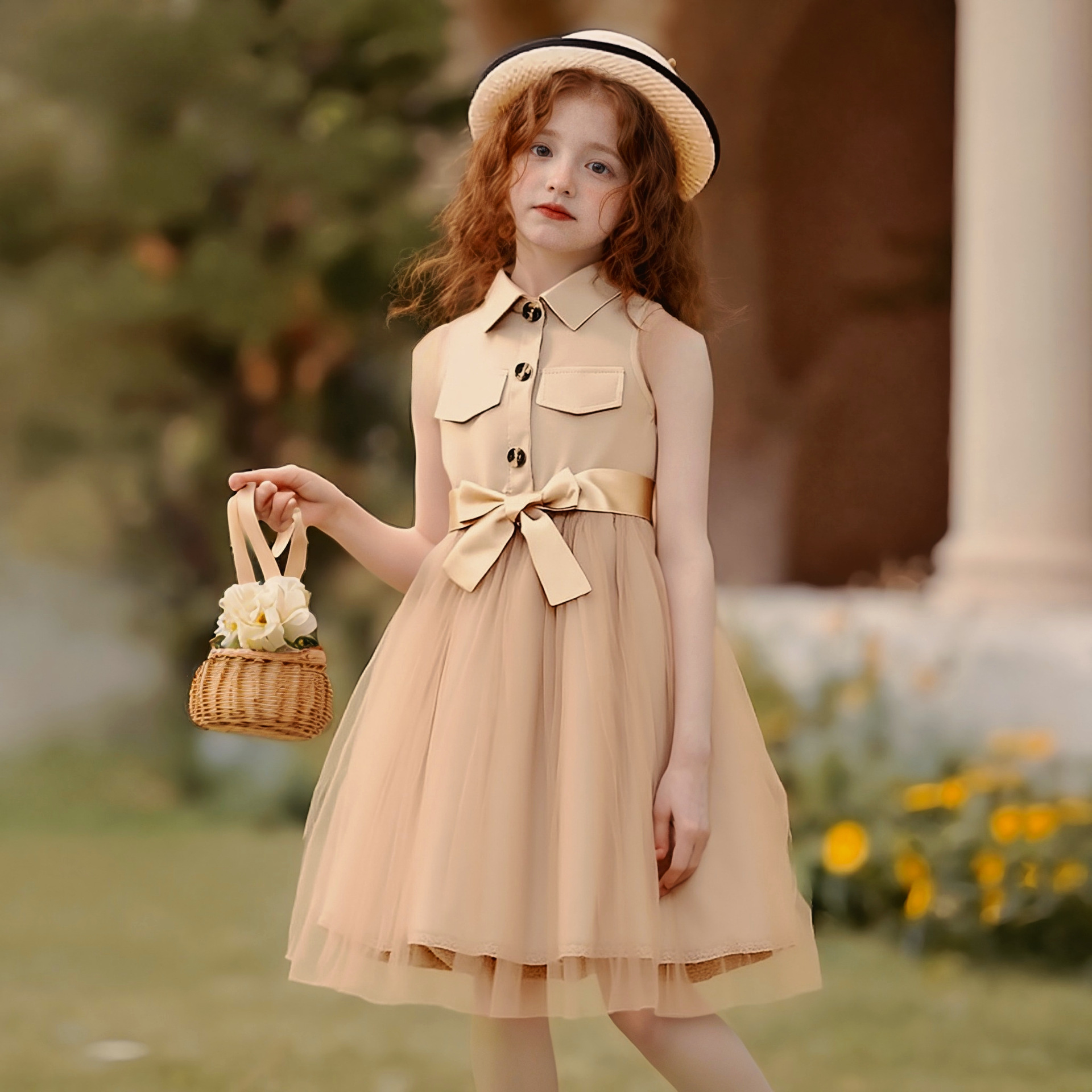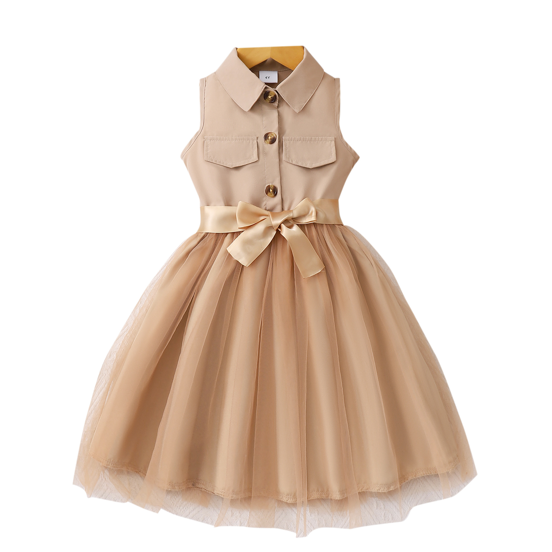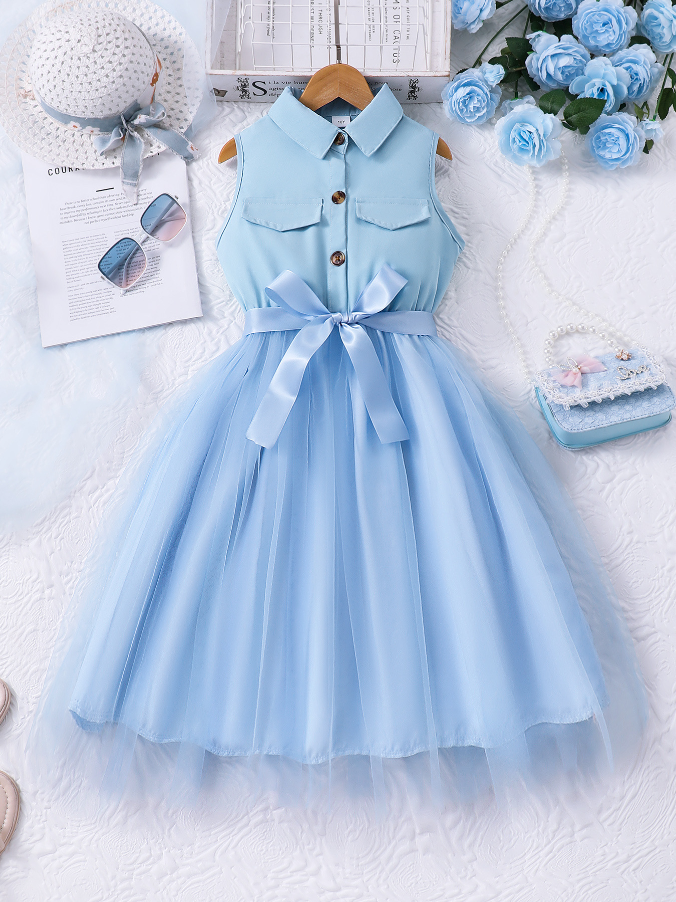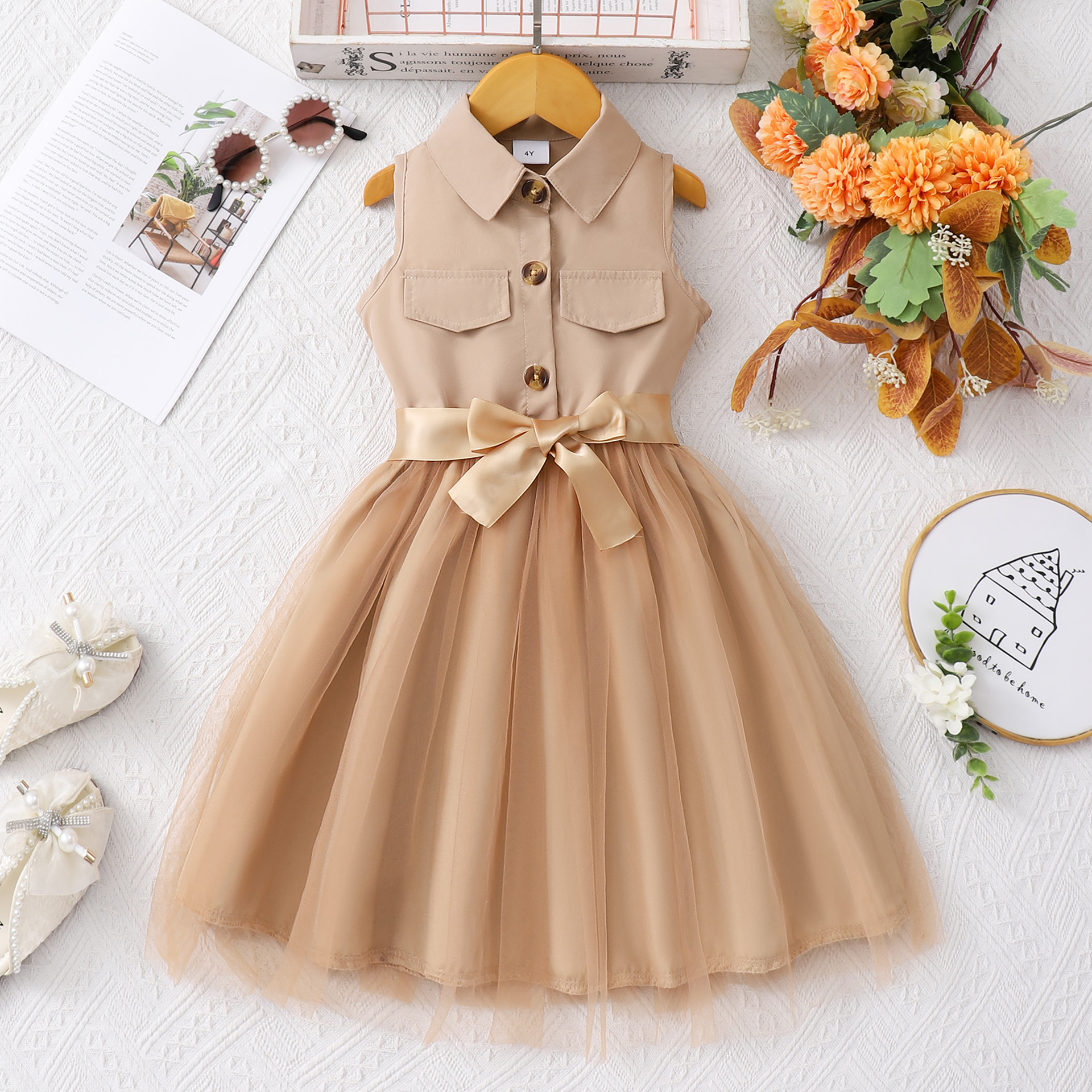 여아(사이즈) 드레스, 솔리드 컬러 민소매 라펠 메쉬 드레스, 직조 벨트 포함