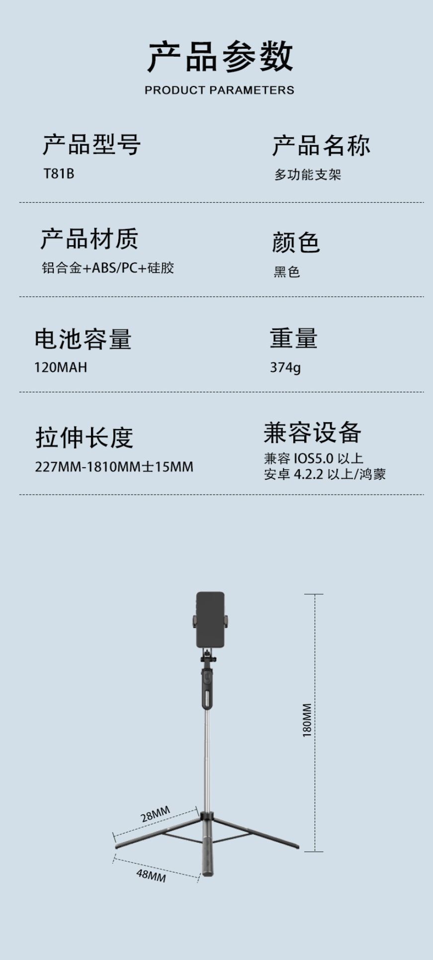 2025 새로운 T81B 블루투스 휴대 전화 셀카 스틱 Douyin 라이브 방송 원 클릭 팝업 다기능 바닥 스탠딩 4 다리 스탠드