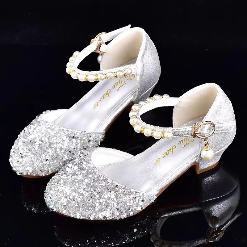 여아 공주 신발, 어린이 실버 하이힐, 크리스탈 신발, 모델 대회, 어린이 중대형 신발, 반짝이는 신발스토어 가기