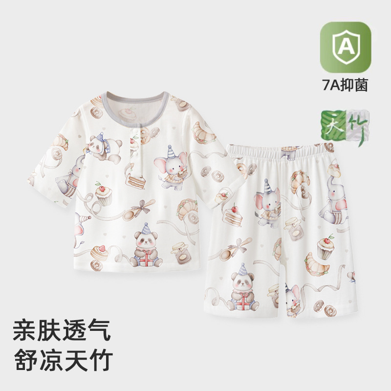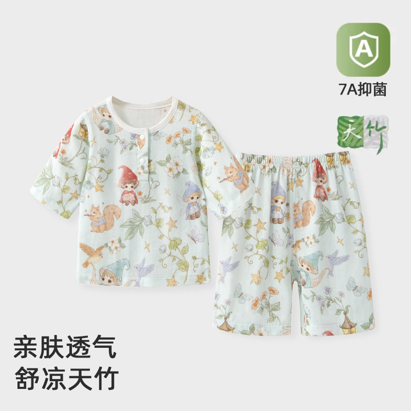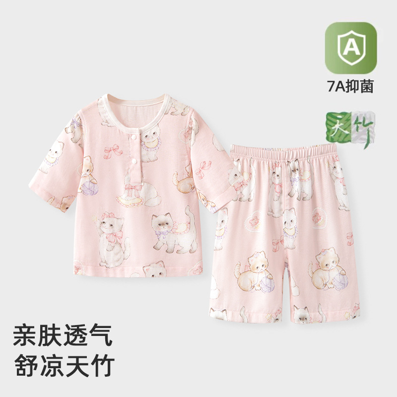 2025 새로운 여름 Tianzhu 면화 어린이 가정 의류 세트 소년과 소녀를위한 얇은 통기성 땀 흡수 귀여운 여름 잠옷