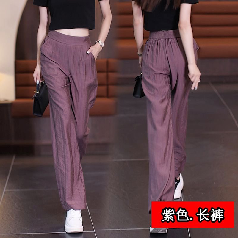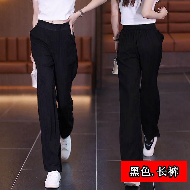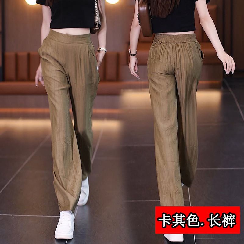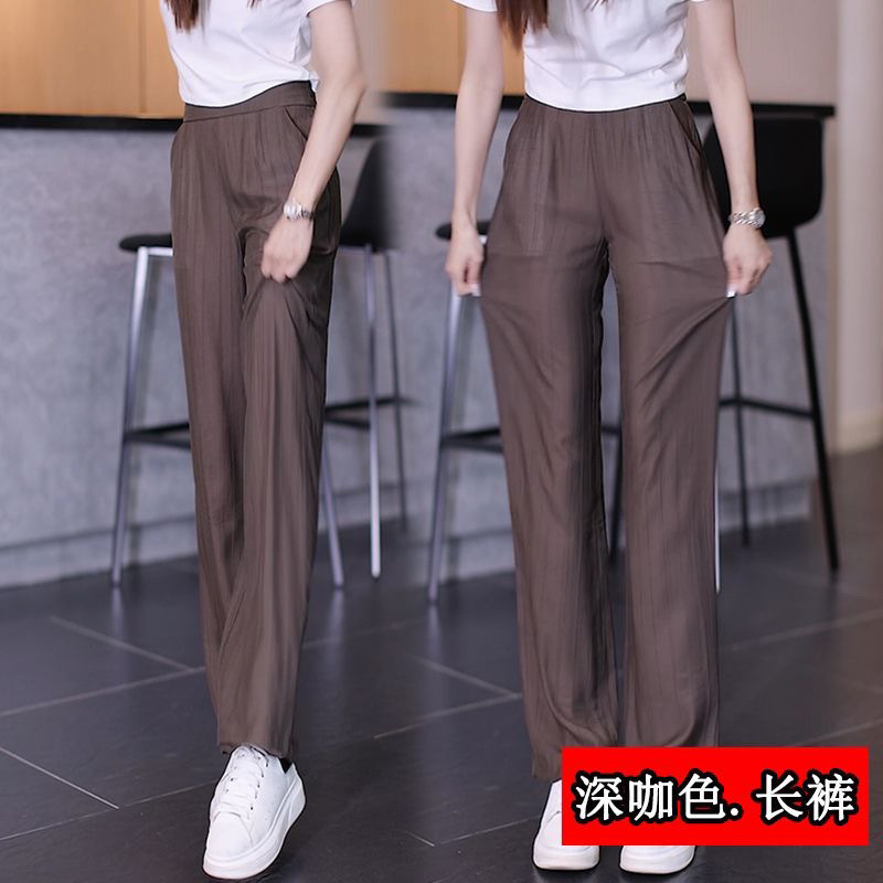 여성용 아이스 실크 와이드 팬츠 여름 얇은 2025 슬리밍 하이 웨이스트 쿨 팬츠 쁘띠 스트레이트 바닥 길이 바지스토어 가기