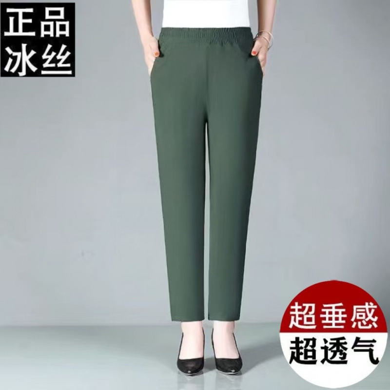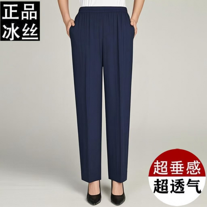 중년 및 노년층 엄마를 위한 아이스 실크 팬츠, 속건성, 여름용 얇은, 신축성 있고 통기성이 좋으며 루즈한 대형 사이즈, 스트레이트 레그, 캐주얼 9부 아우터스토어 가기