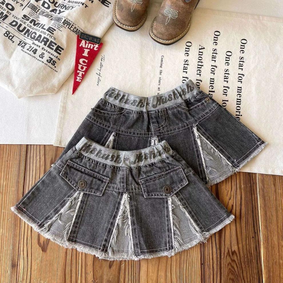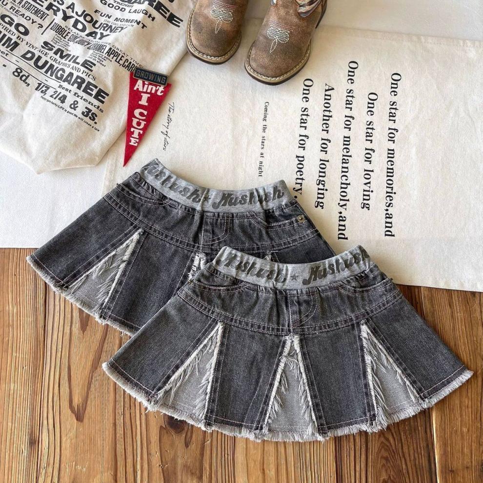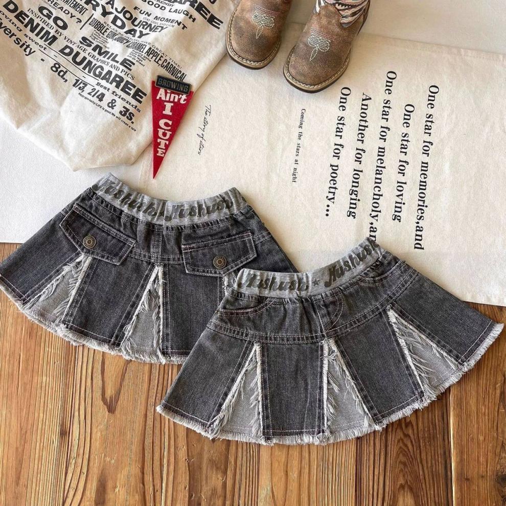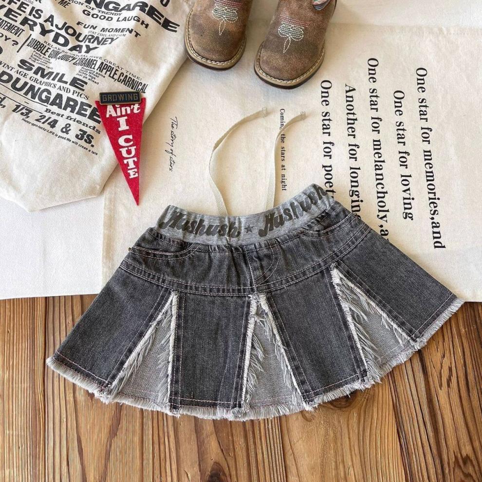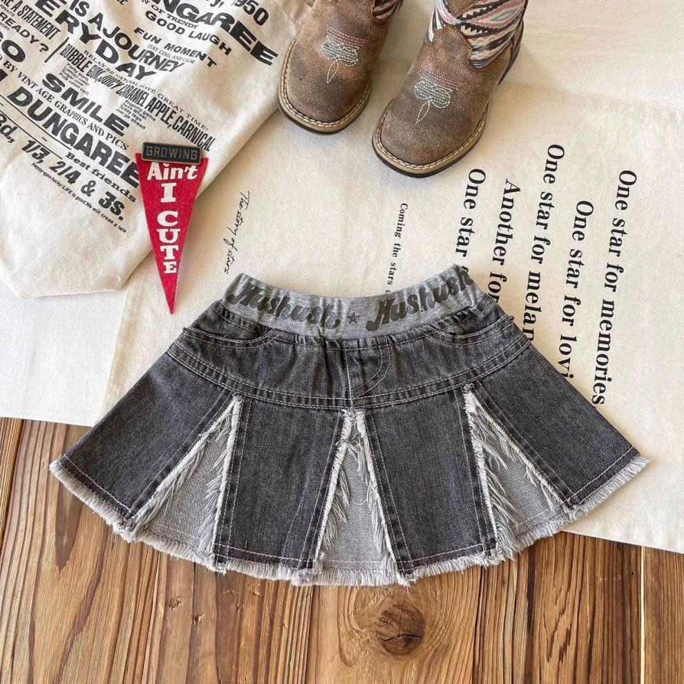 일본 아동복 중고 아동 스플라이스 데님 스커트 영어 프린트 벨트 플리츠 스커트스토어 가기