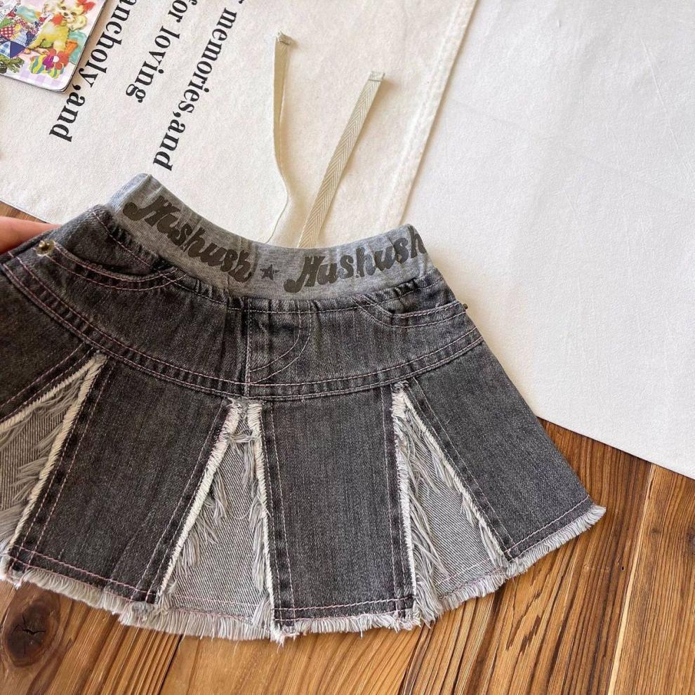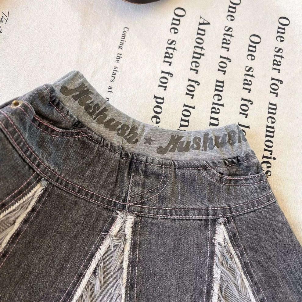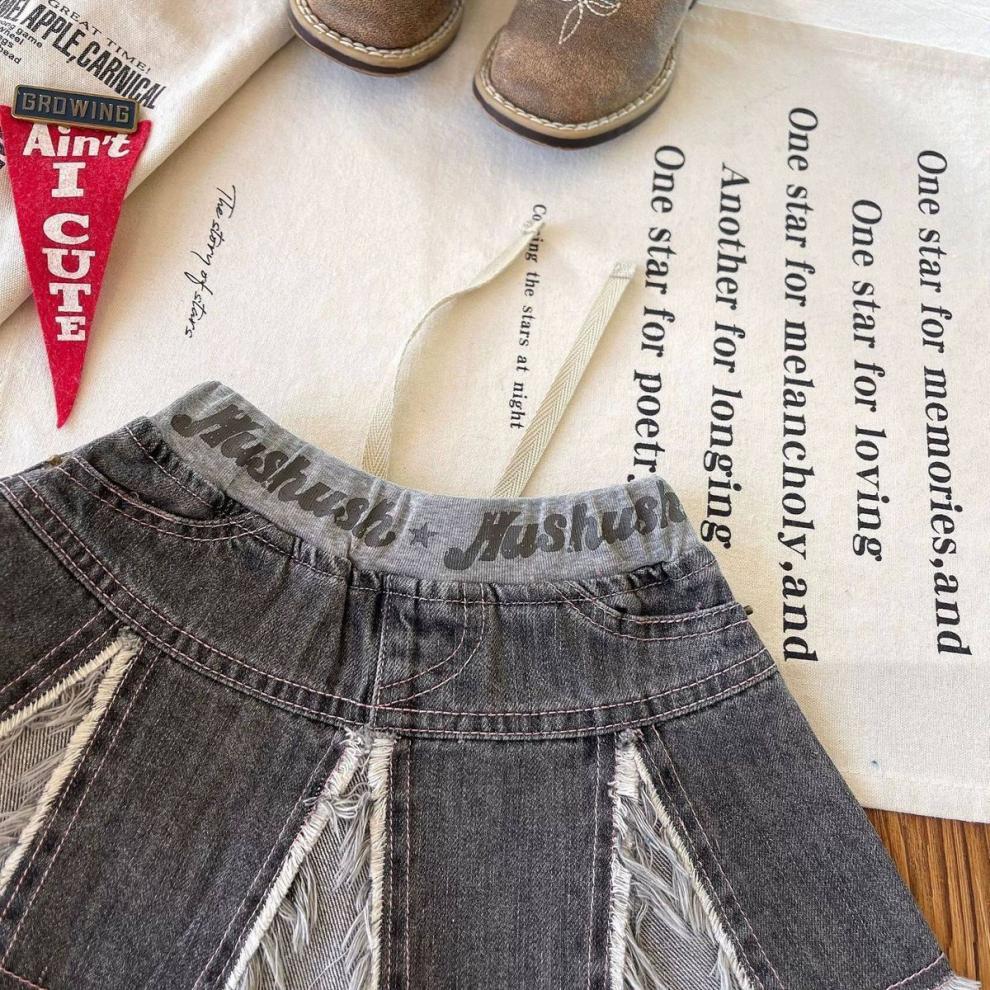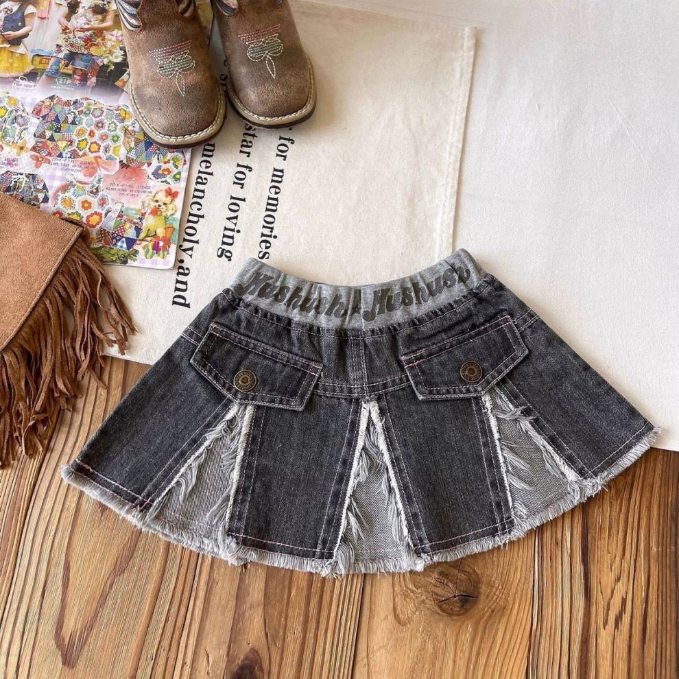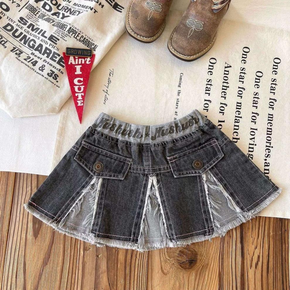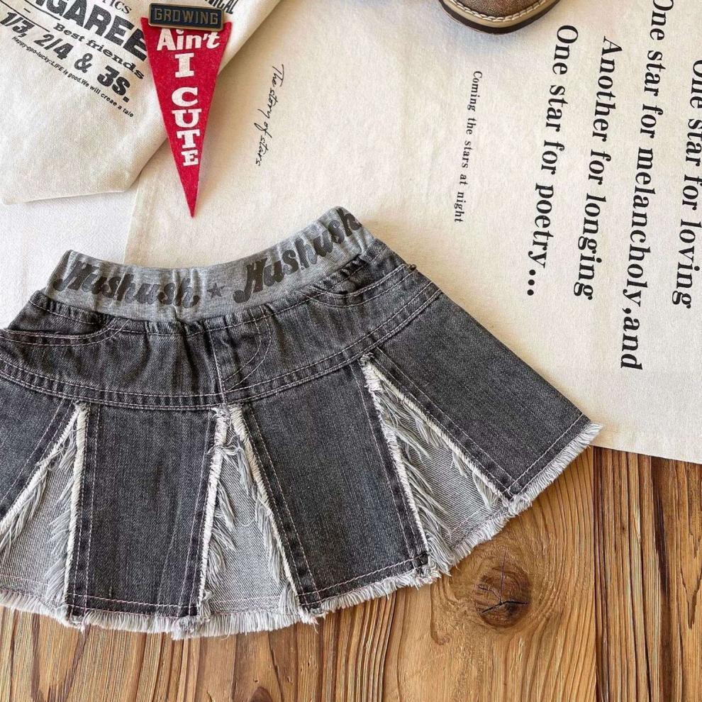일본 아동복 중고 아동 스플라이스 데님 스커트 영어 프린트 벨트 플리츠 스커트스토어 가기