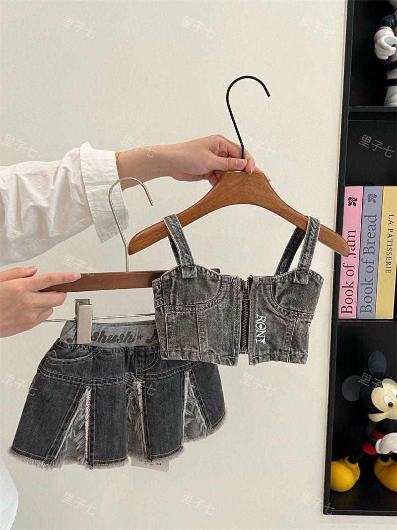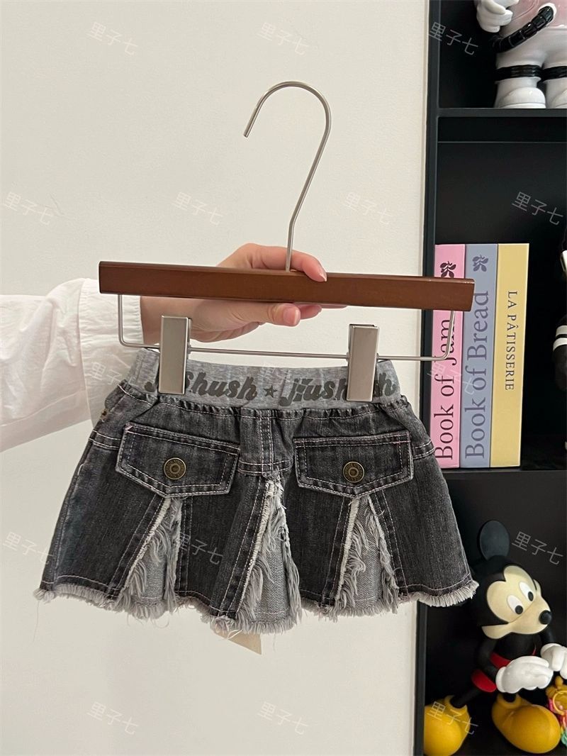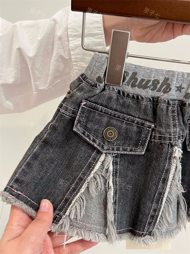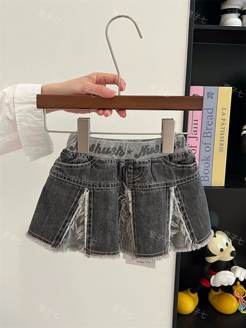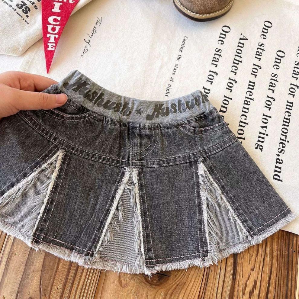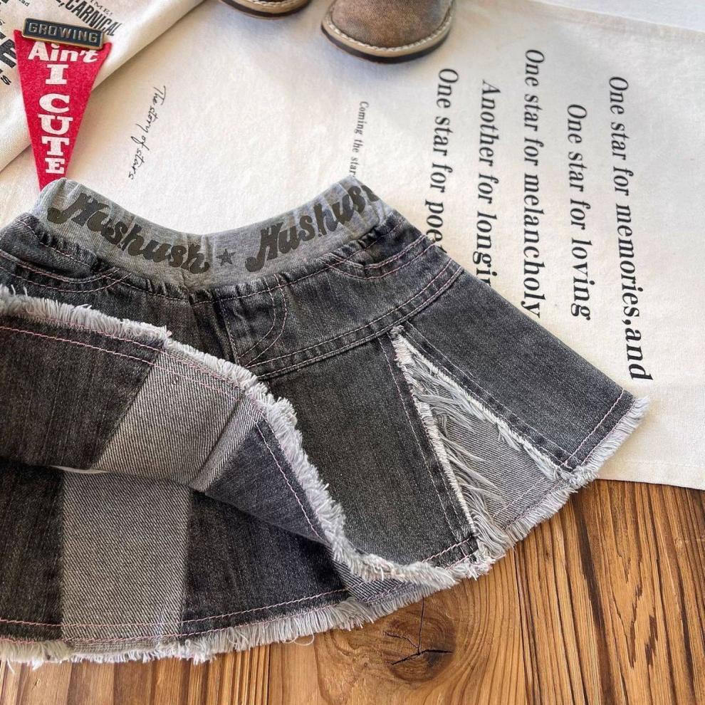 일본 아동복 중고 아동 스플라이스 데님 스커트 영어 프린트 벨트 플리츠 스커트스토어 가기