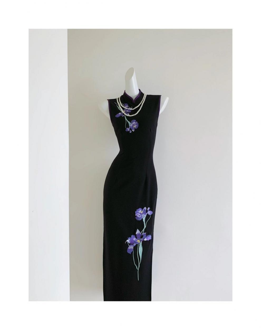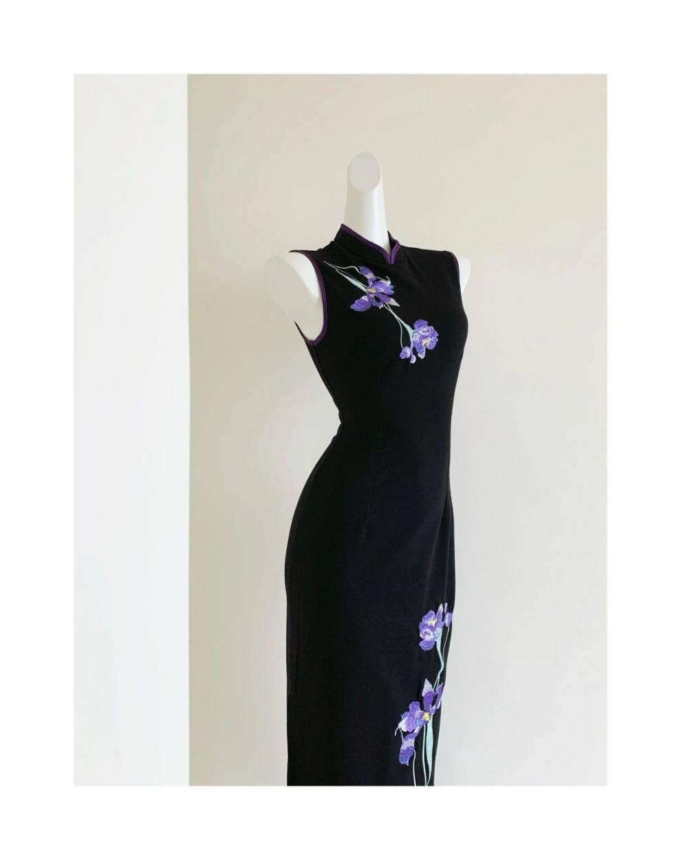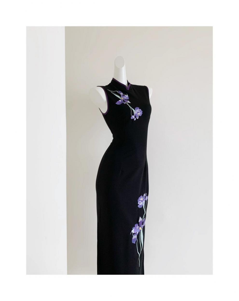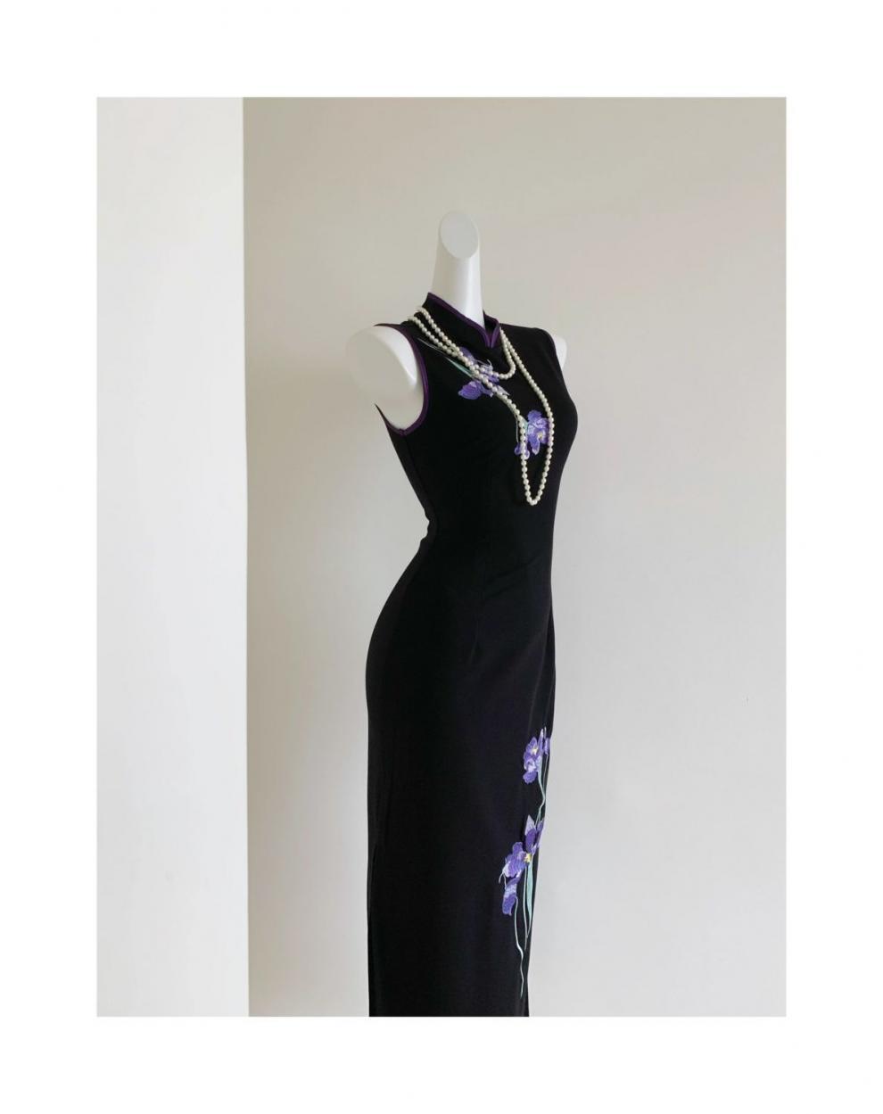 동양의 미학 중국 스타일 보라색 자수 복고풍 검은 색 슬림 피트 홍콩 스타일 치파오 드레스