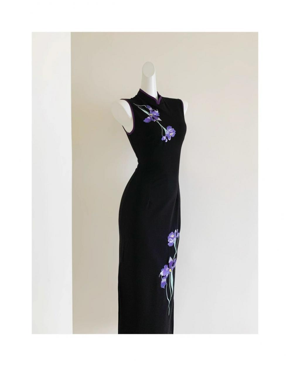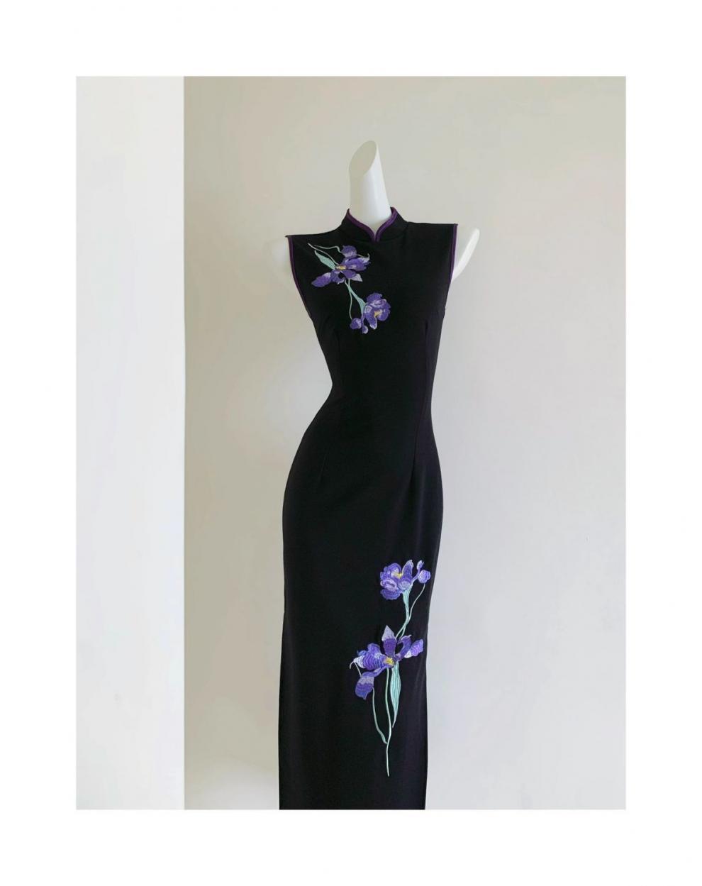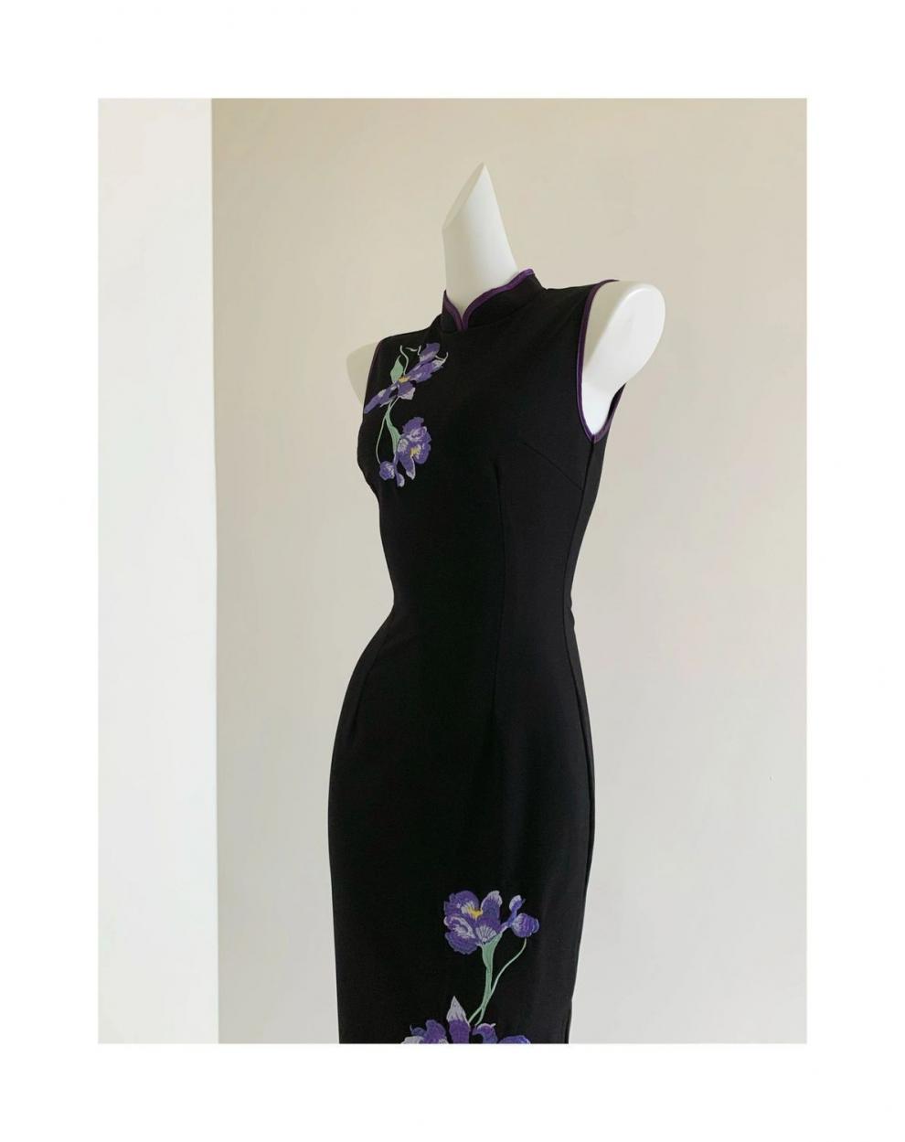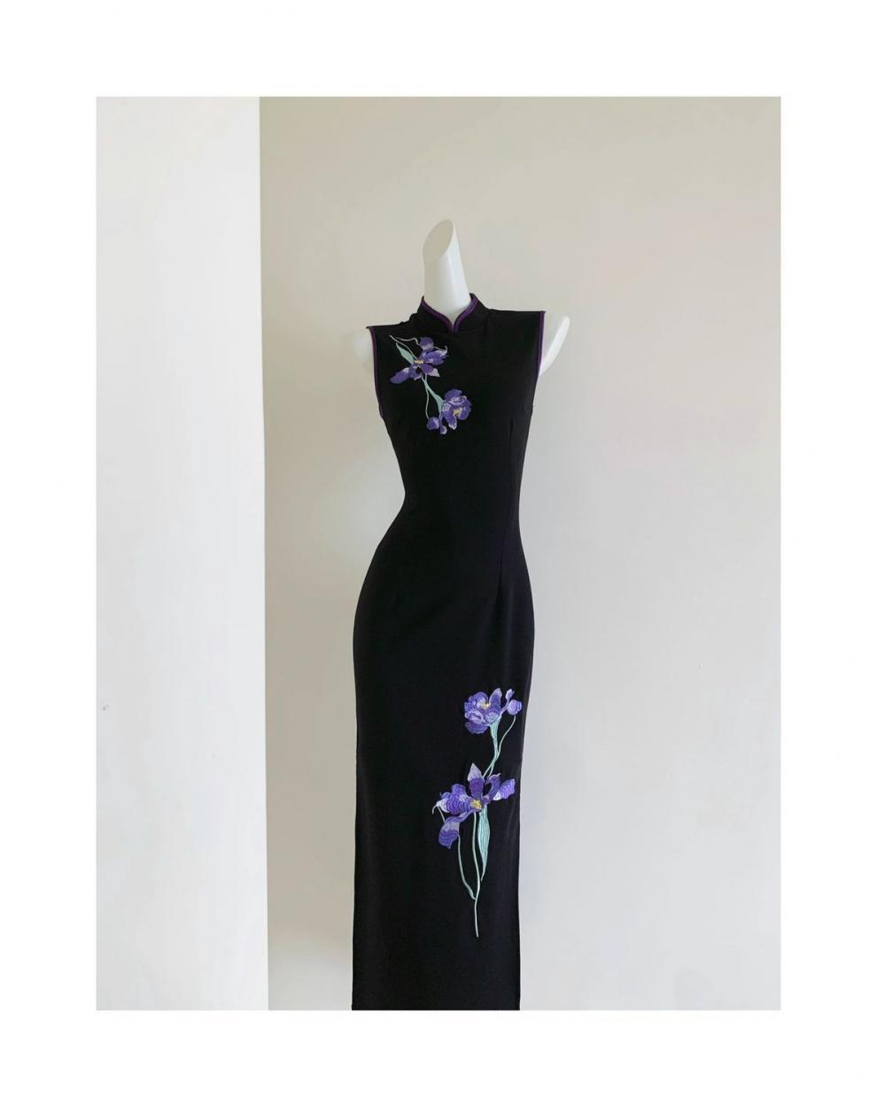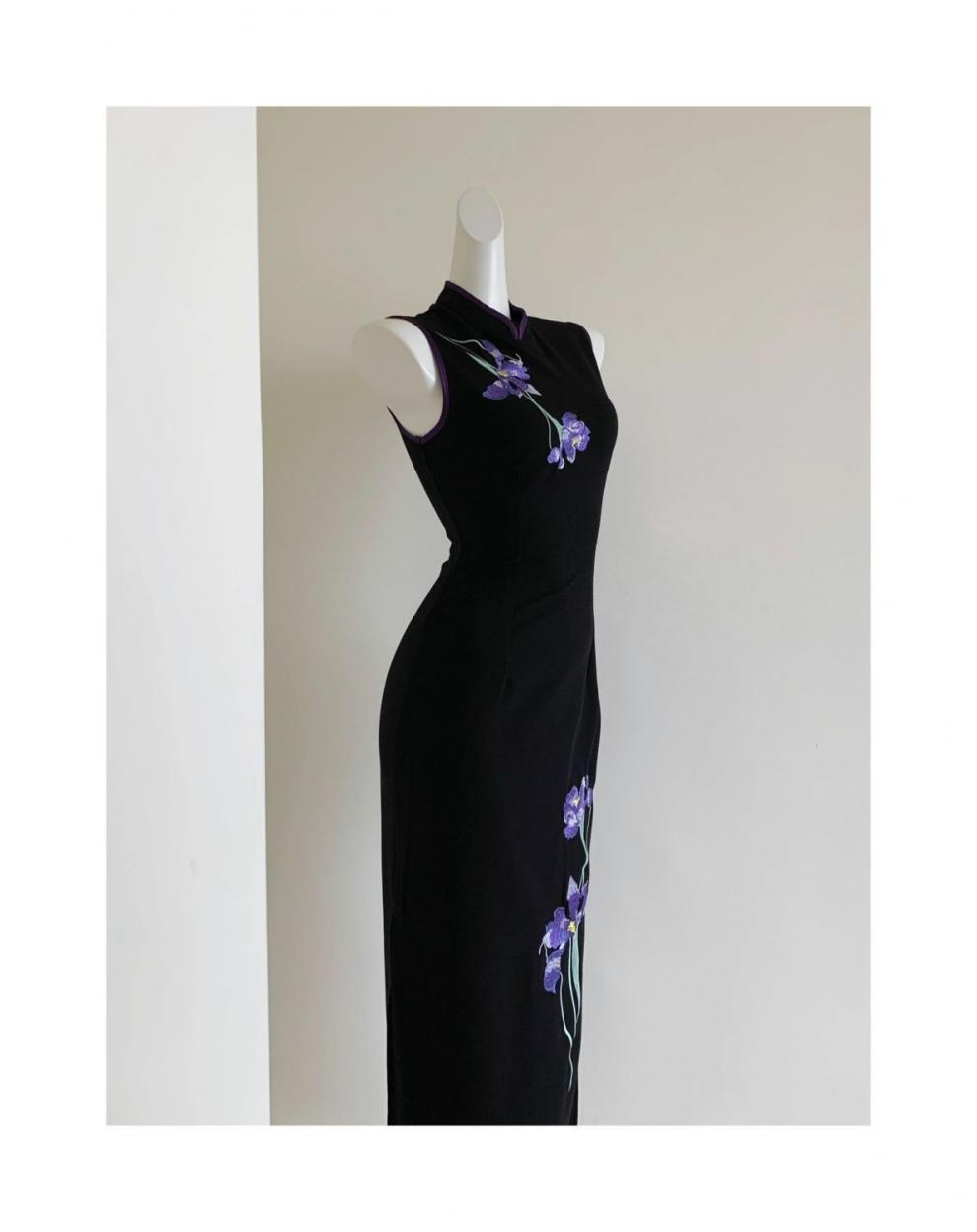 동양의 미학 중국 스타일 보라색 자수 복고풍 검은 색 슬림 피트 홍콩 스타일 치파오 드레스