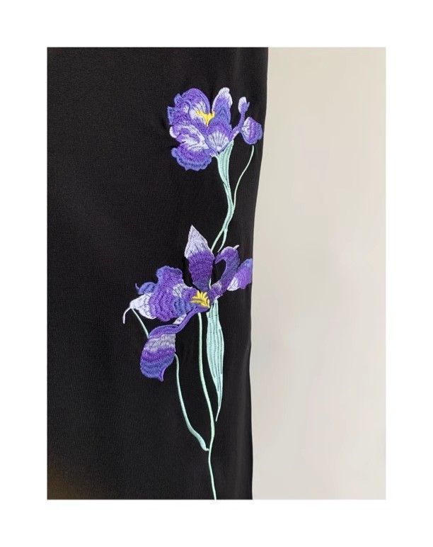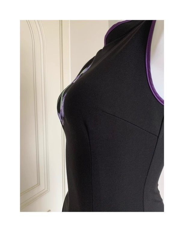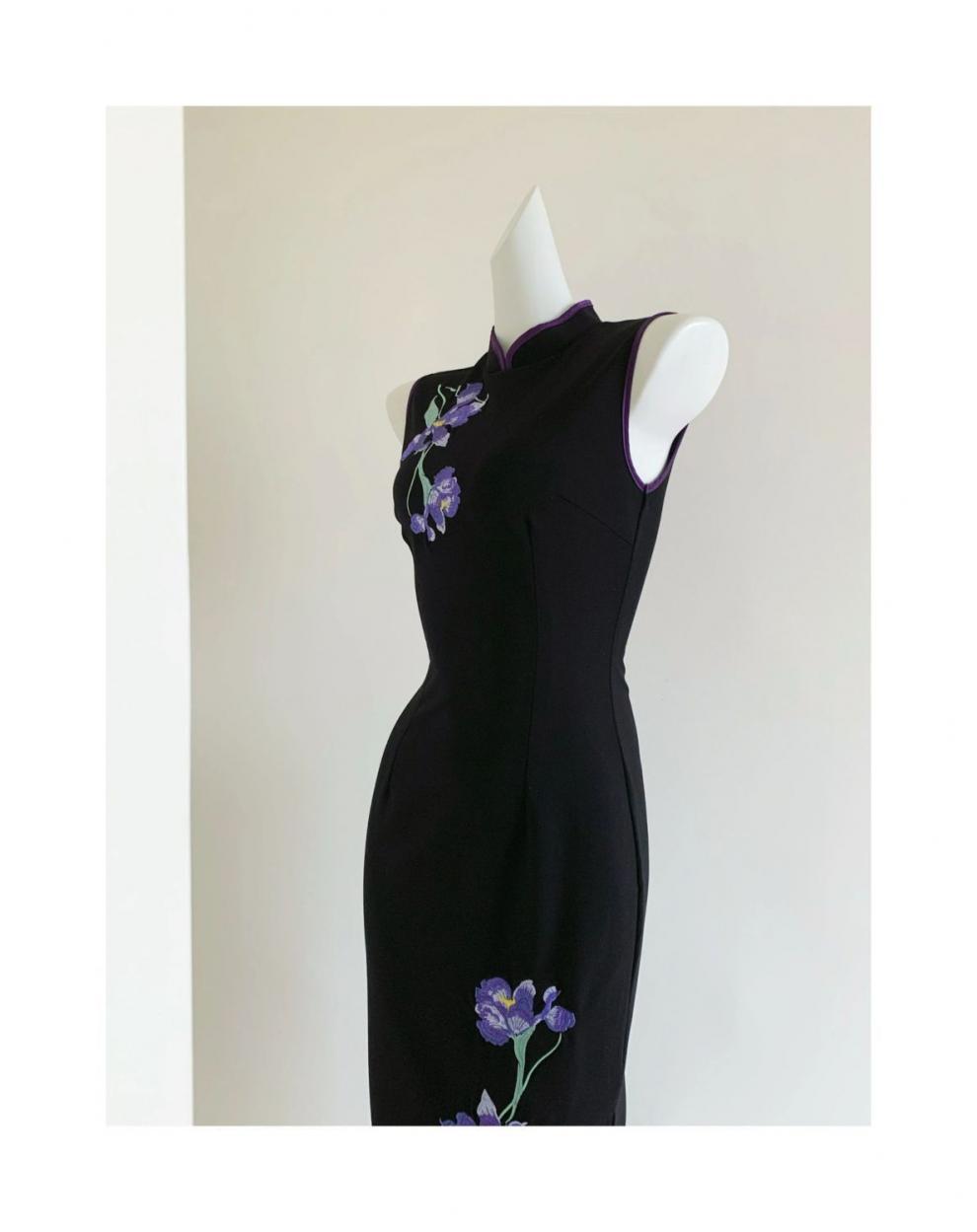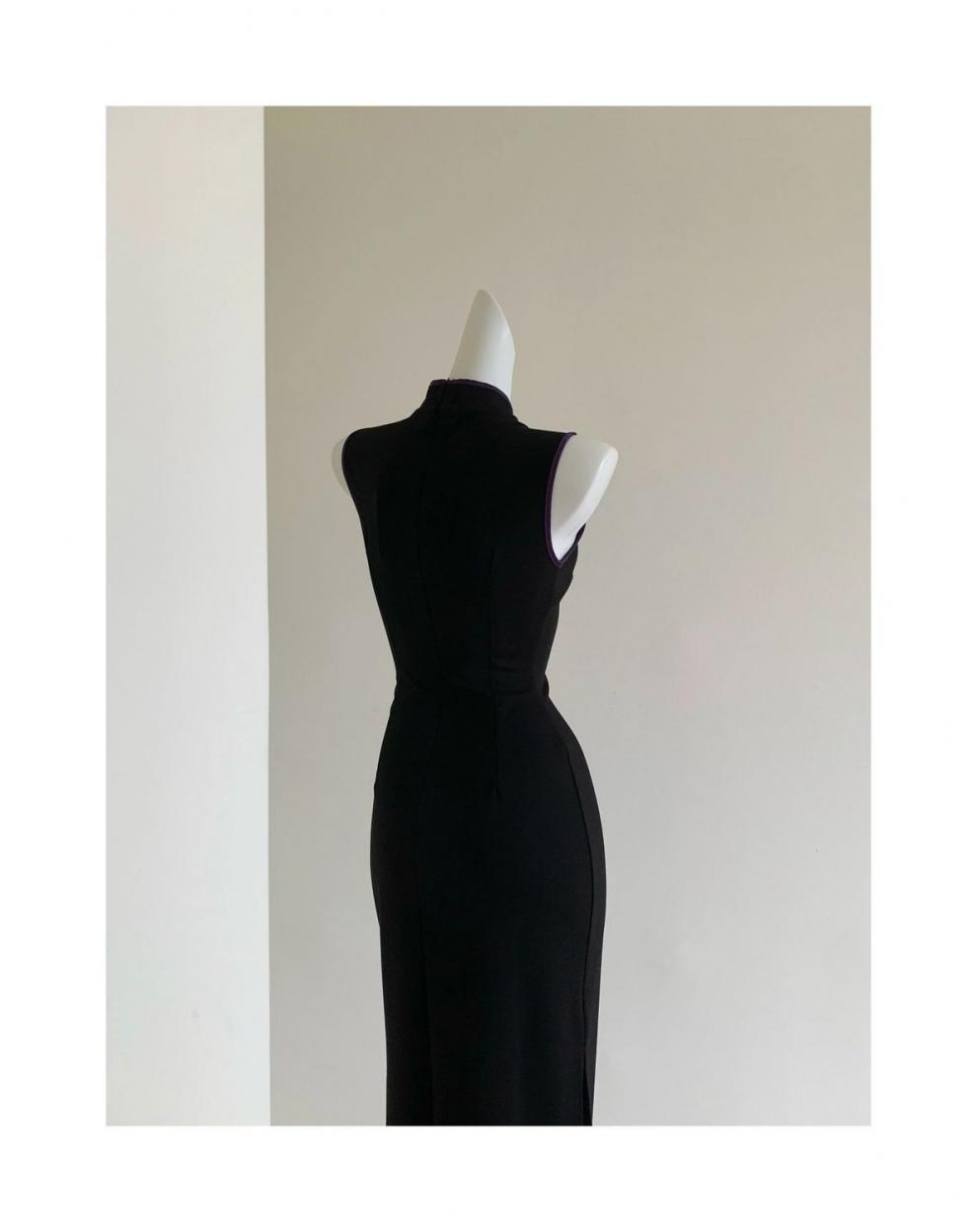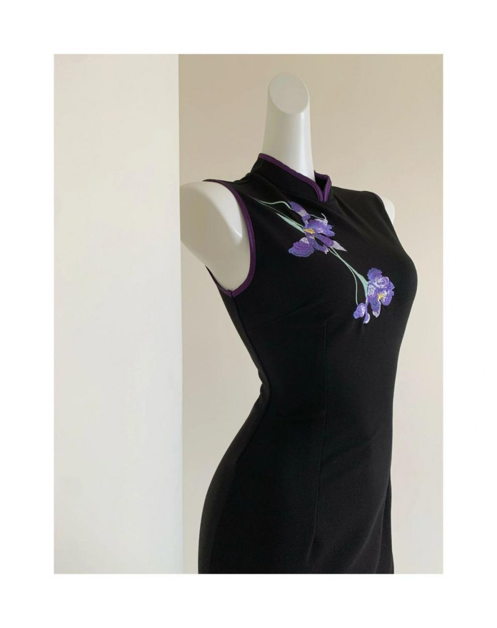 동양의 미학 중국 스타일 보라색 자수 복고풍 검은 색 슬림 피트 홍콩 스타일 치파오 드레스