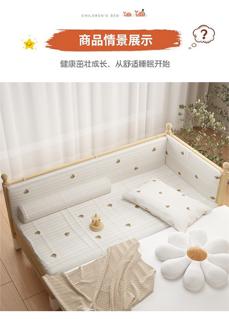 • [침대 다리 16단계 조절 가능] 3면 가드레일 + 매트리스 + 카툰 프린트 침대 옆