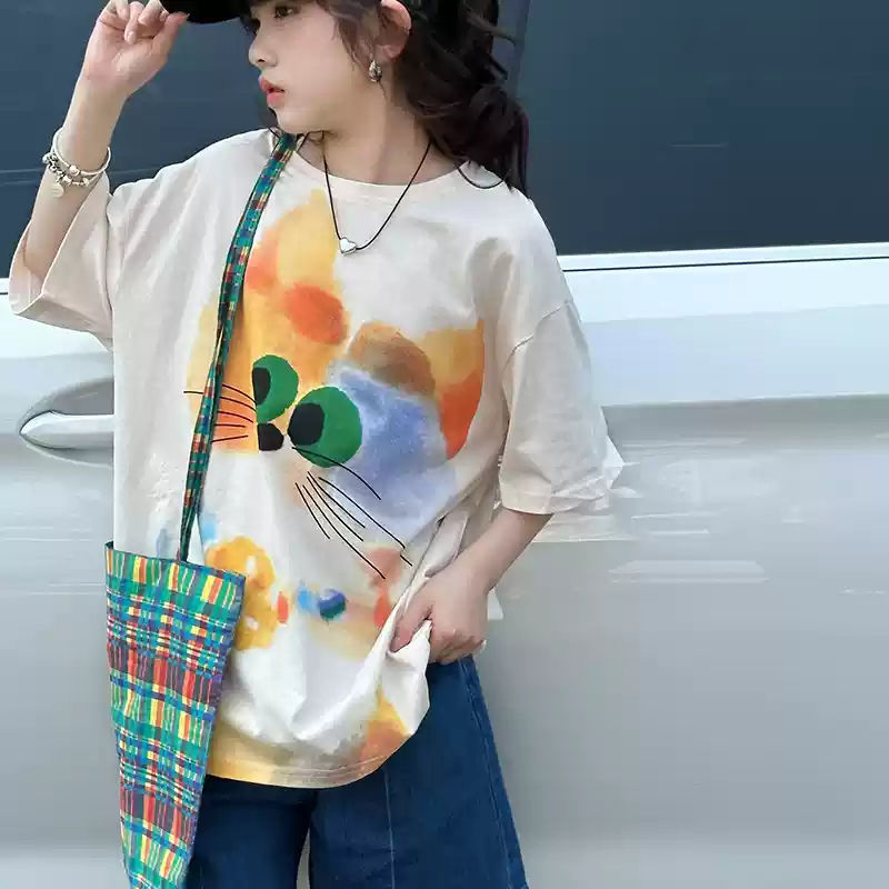 여아 반팔 라운드 넥 티셔츠 순면 여름 새 스타일 외국 스타일 여아 중대형 아동용 반팔 탑 여름 유행 스타일스토어 가기