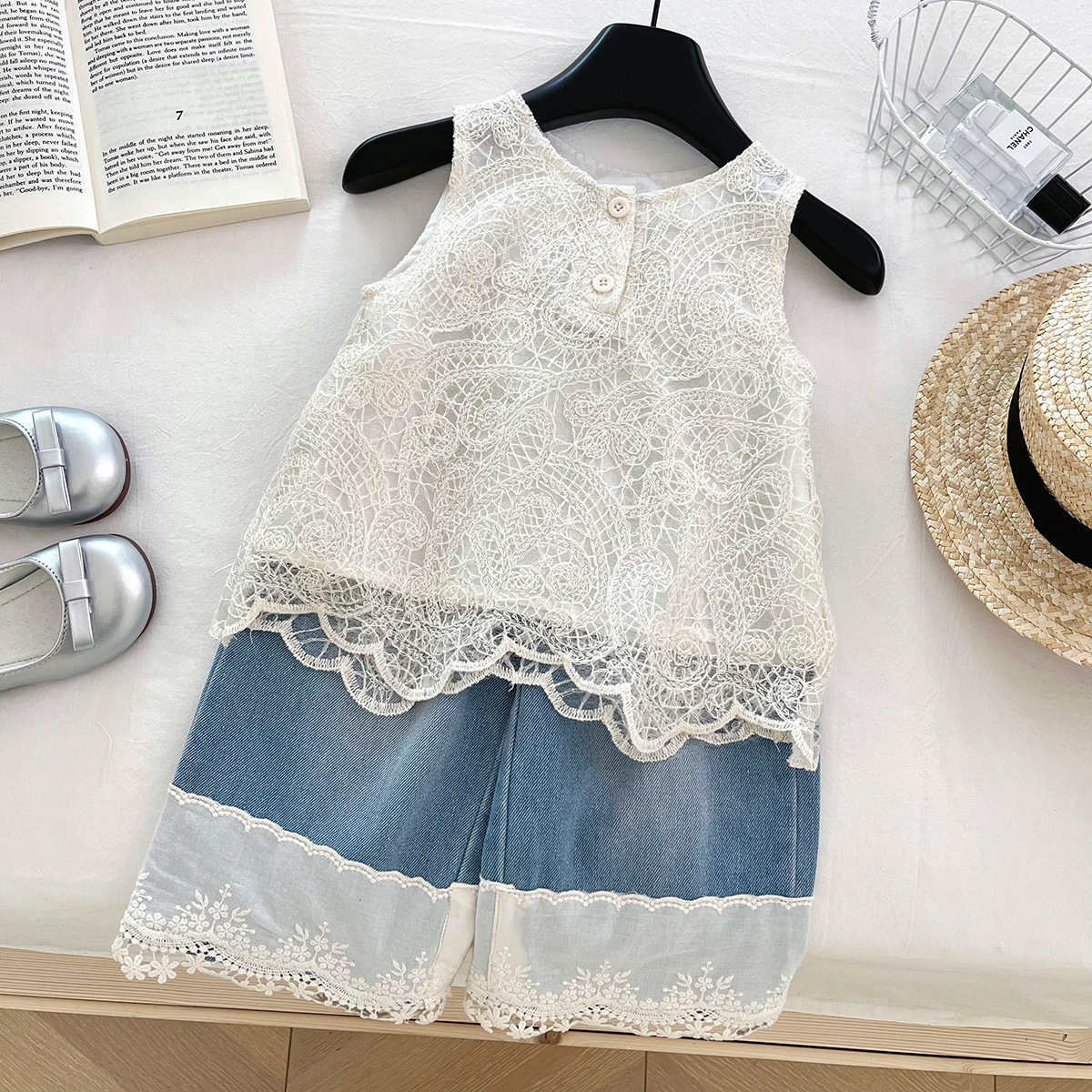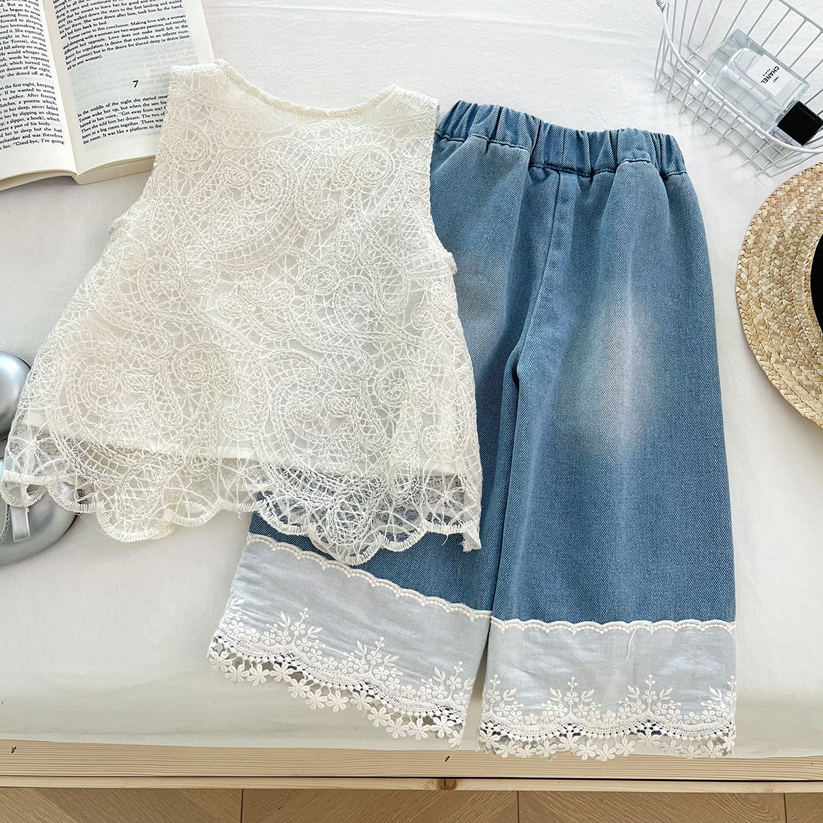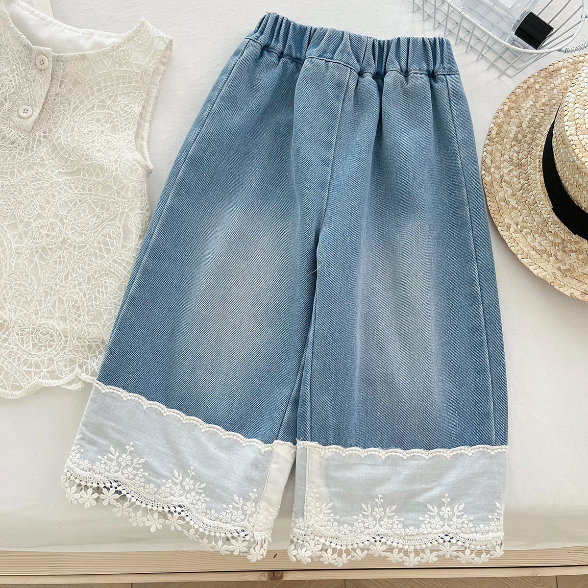 신상품 아동 한국어 버전 정장 2025 여름 소녀 유행 레이스 조끼 레이스 데님 와이드 팬츠 투피스 세트스토어 가기