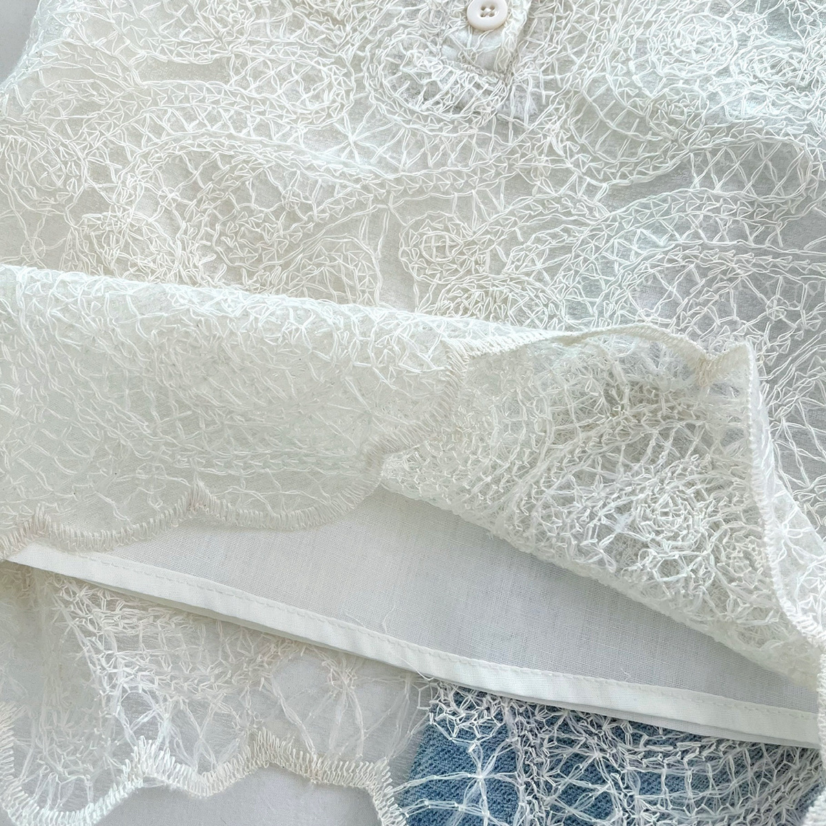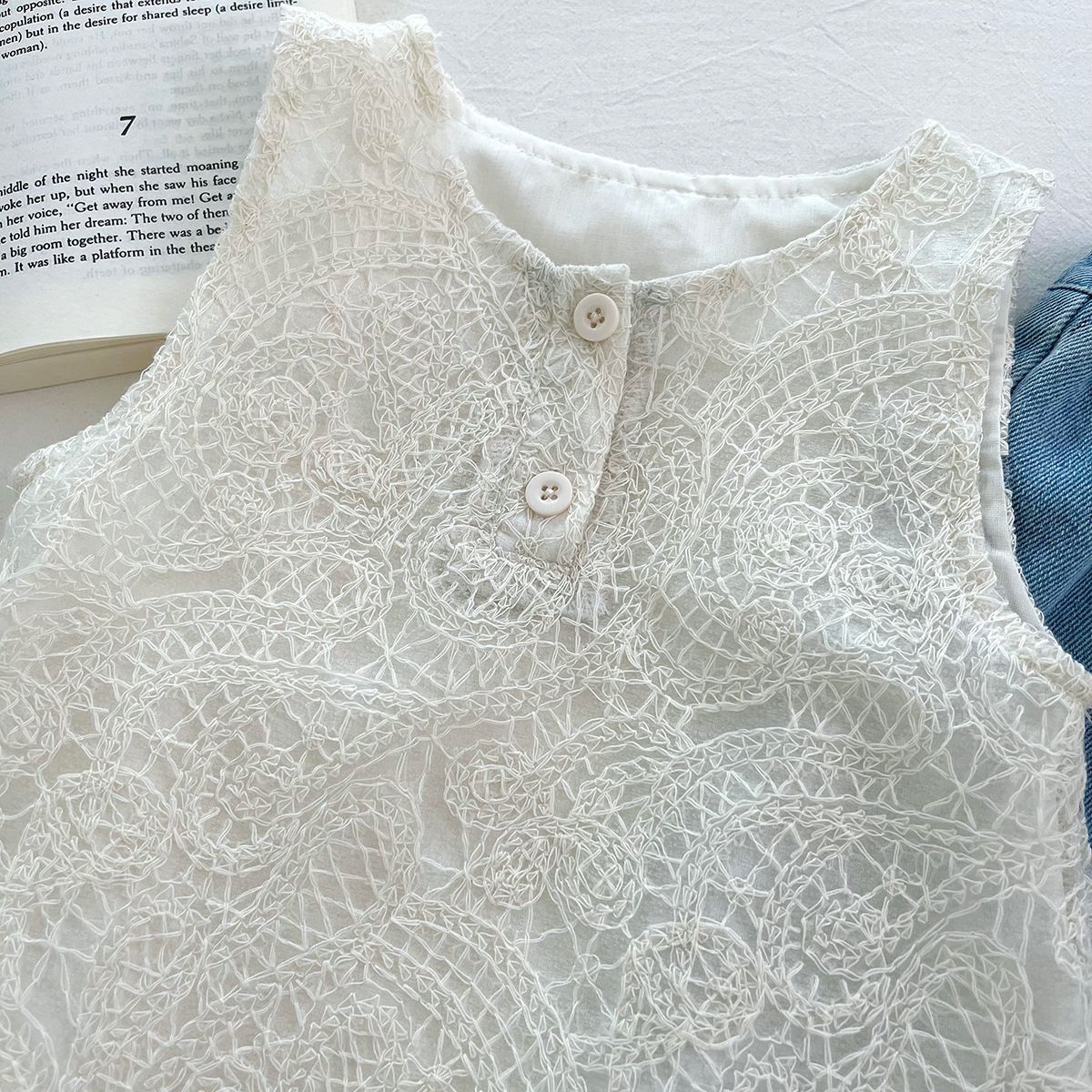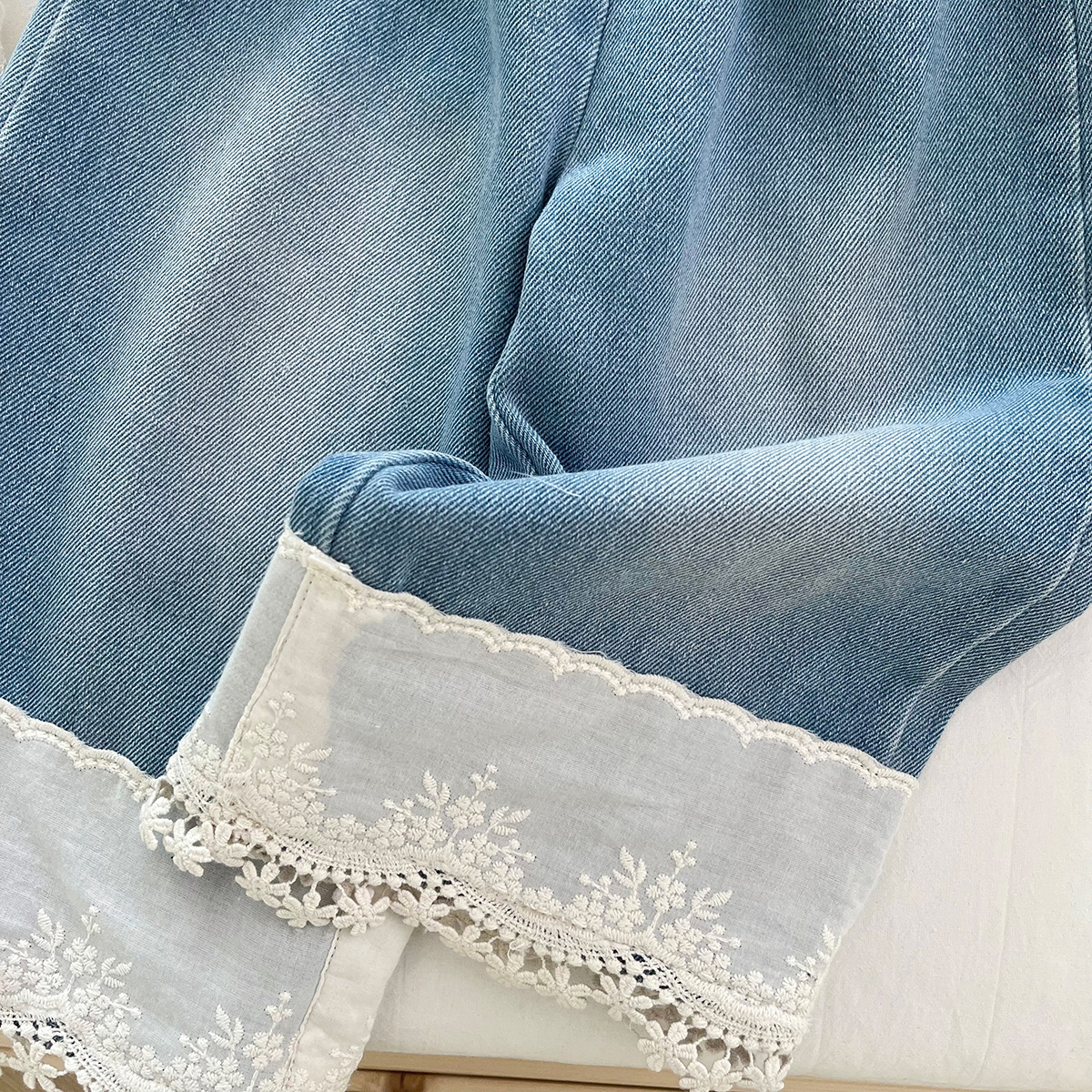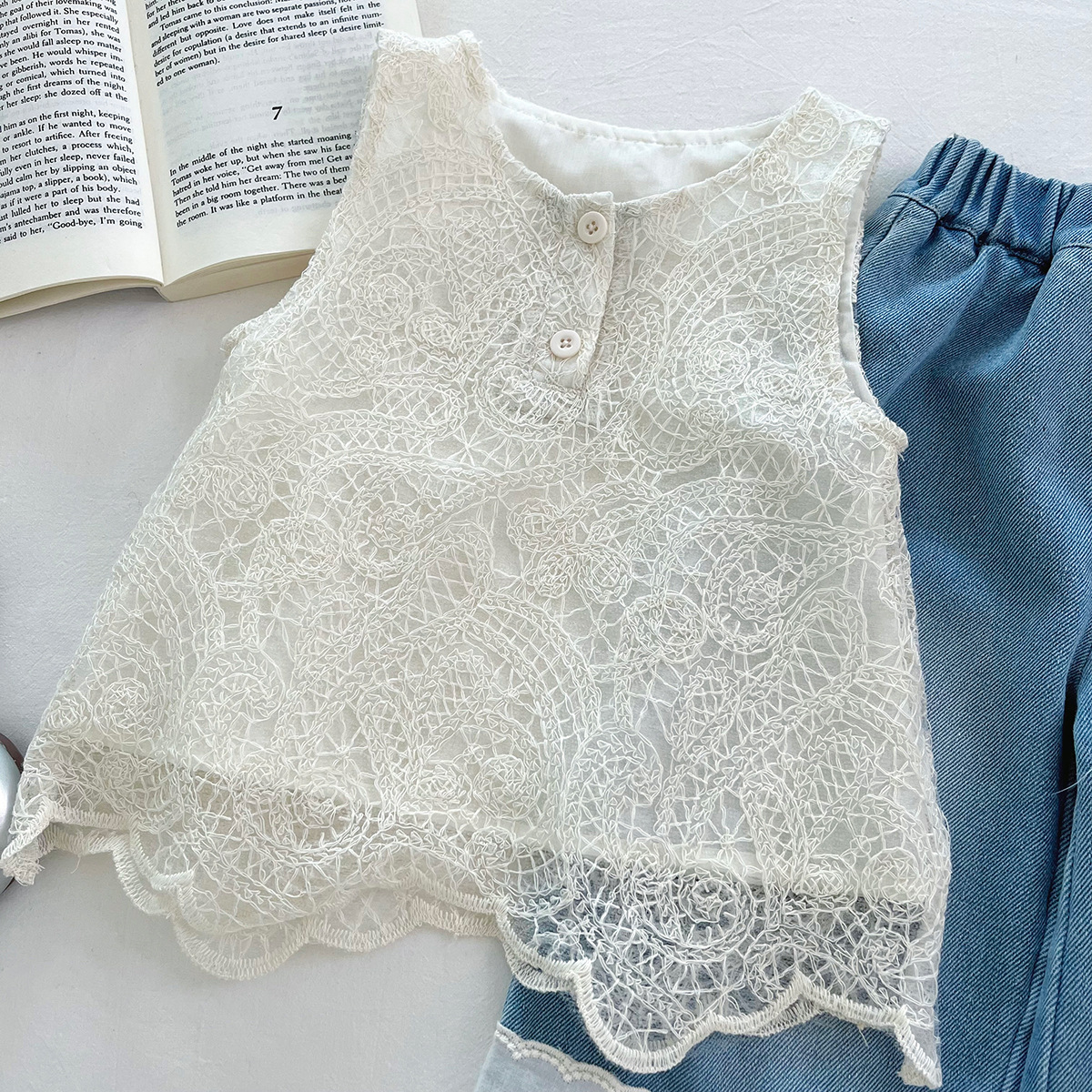 신상품 아동 한국어 버전 정장 2025 여름 소녀 유행 레이스 조끼 레이스 데님 와이드 팬츠 투피스 세트스토어 가기