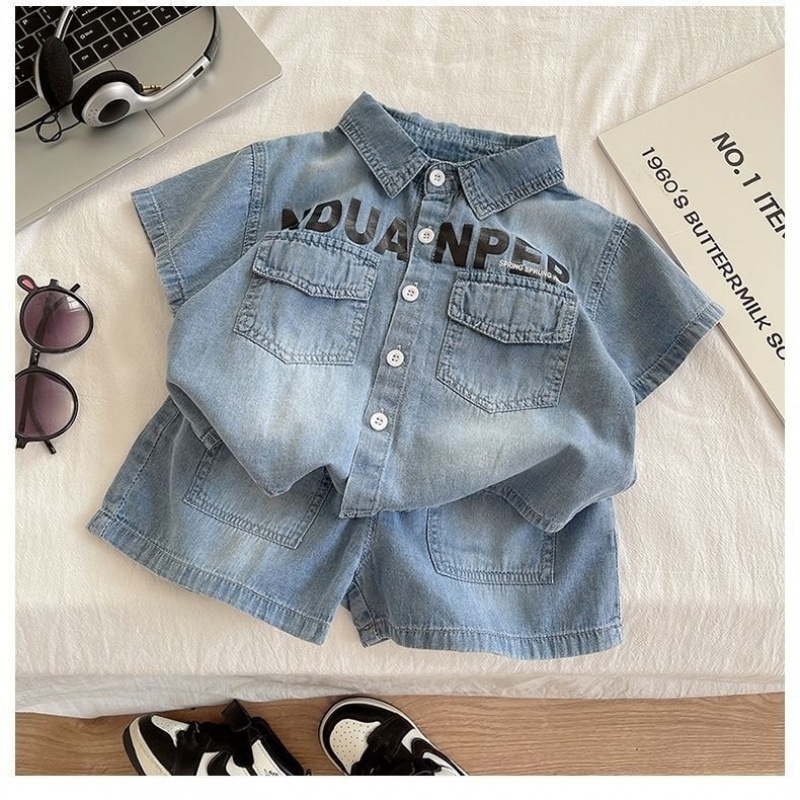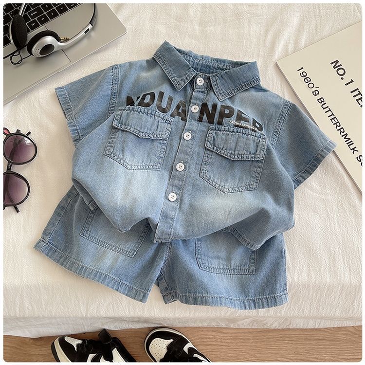 소년 여름 데님 정장 트렌디하고 멋진 어린이 반팔 셔츠 투피스 세트 2025 새로운 아기 여름 얇은 옷스토어 가기