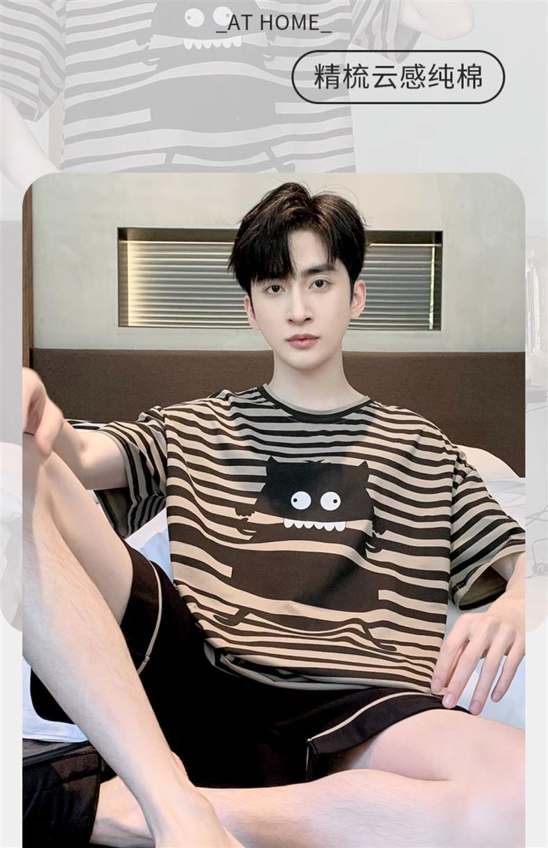 인기 있는 여름 남성 잠옷 순면 반팔 청소년 플러스 사이즈 여름 얇은 홈웨어 세트 외부 착용 가능스토어 가기