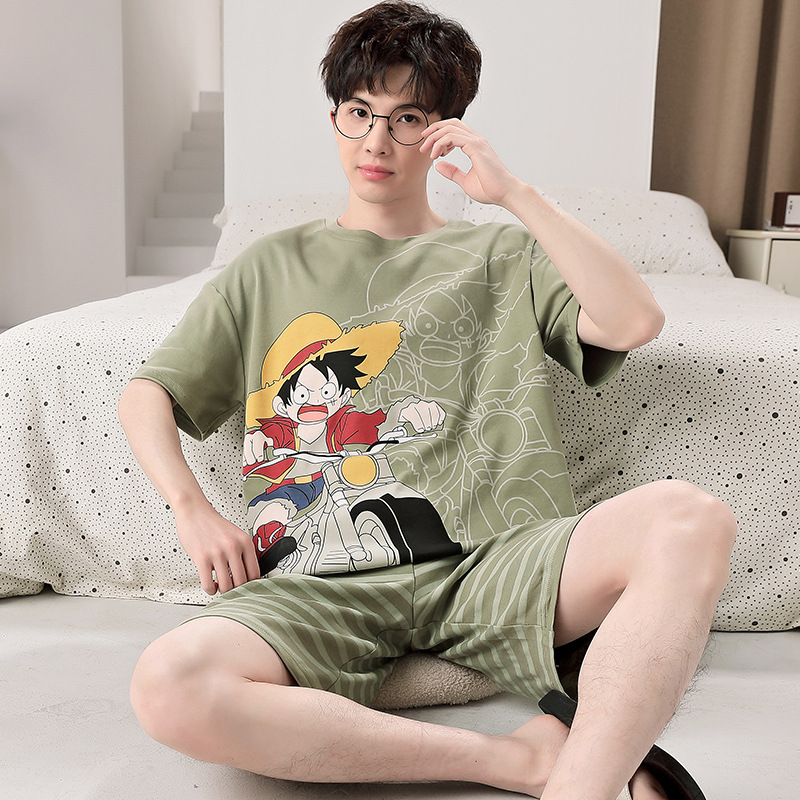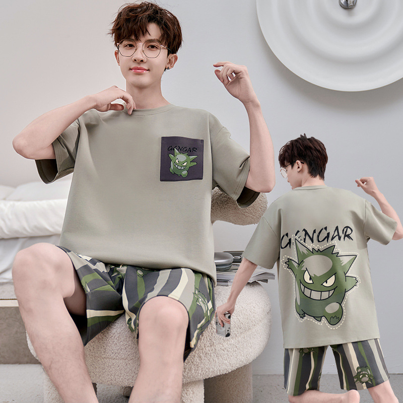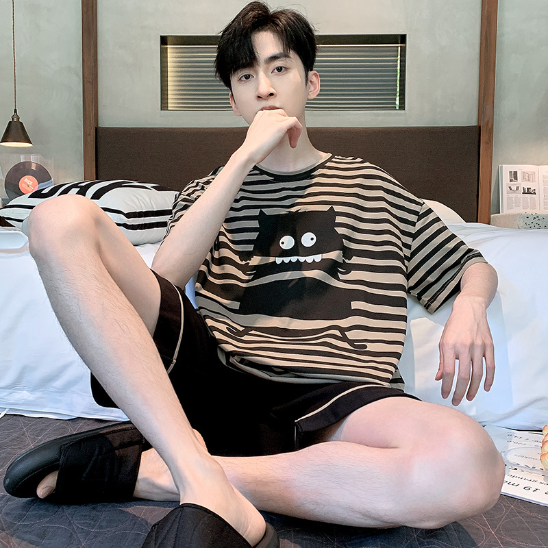 인기 있는 여름 남성 잠옷 순면 반팔 청소년 플러스 사이즈 여름 얇은 홈웨어 세트 외부 착용 가능