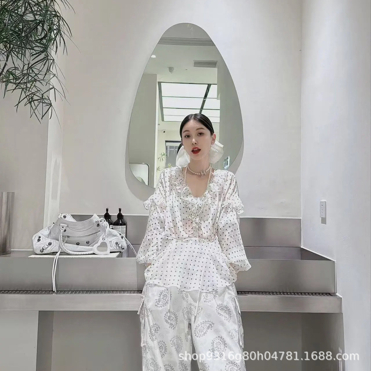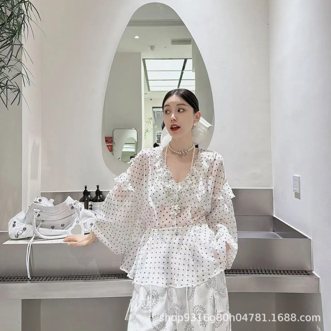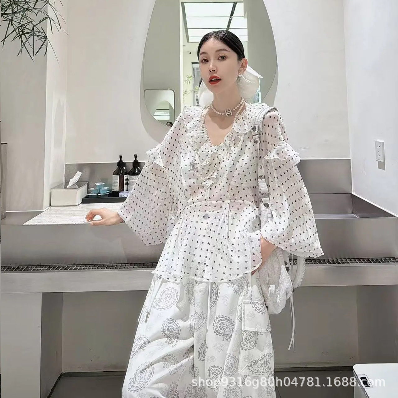 Nanyou 고급 버전 틈새 디자인 오리지널 브랜드 폴카 도트 프린트 러플 자외선 차단 셔츠 쉬폰 셔츠 투피스 세트