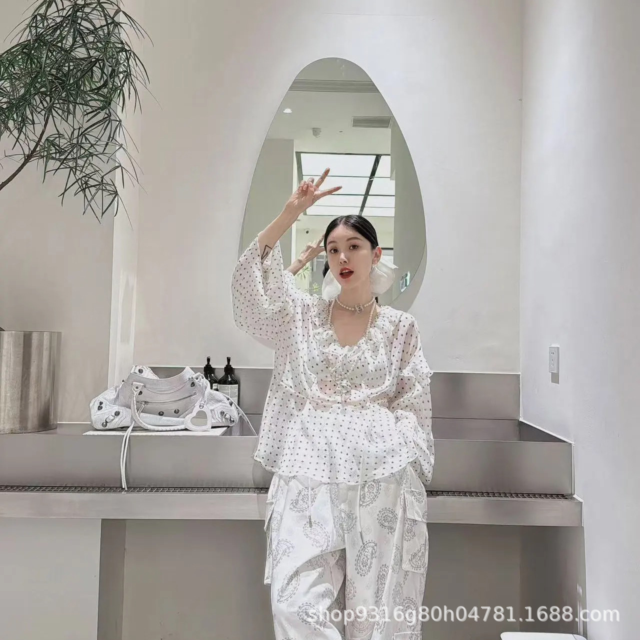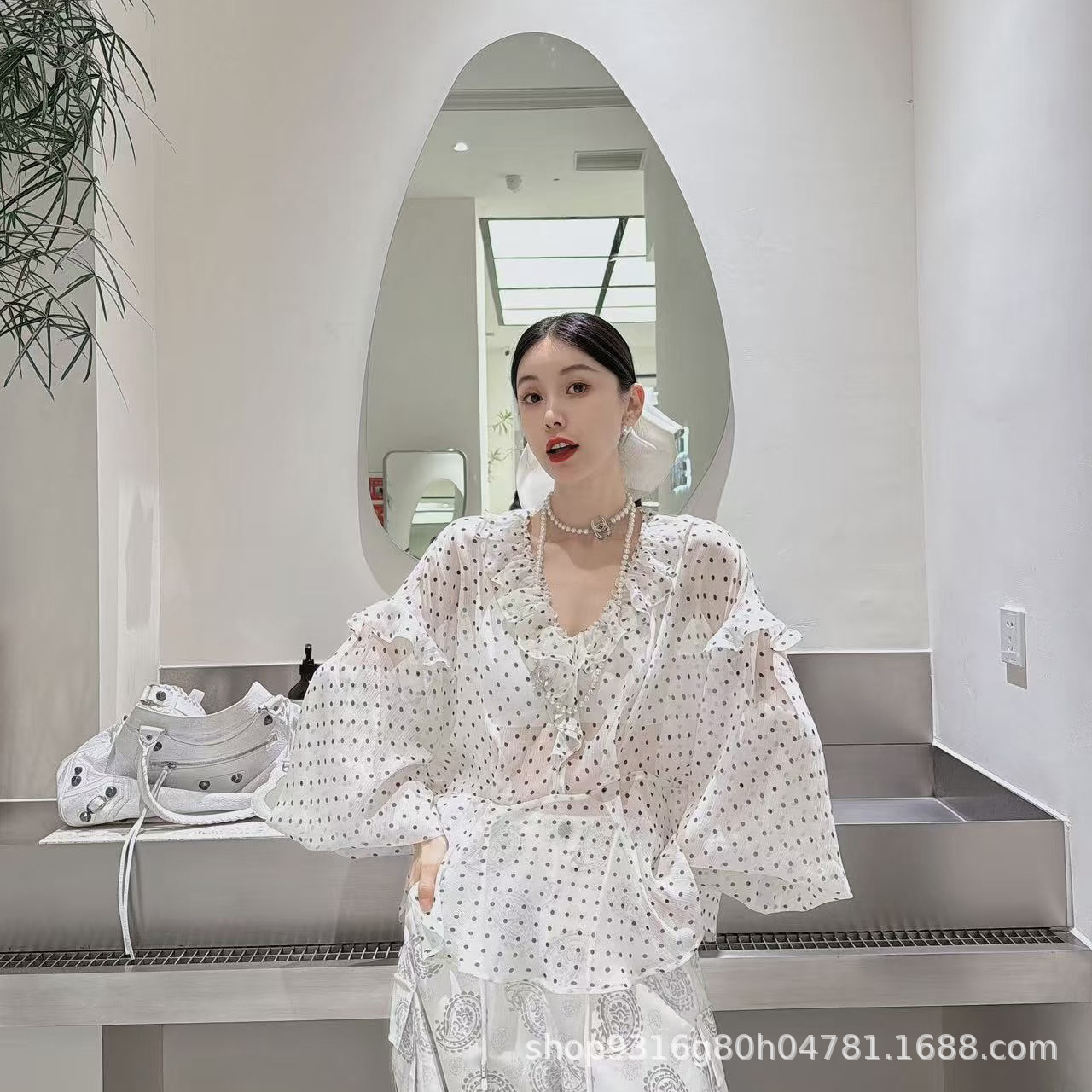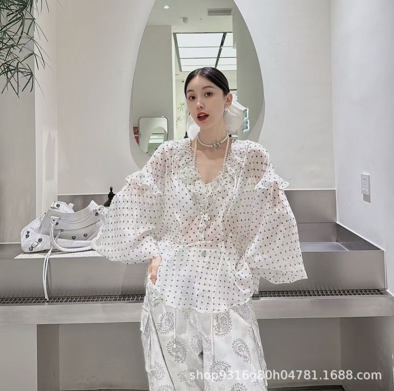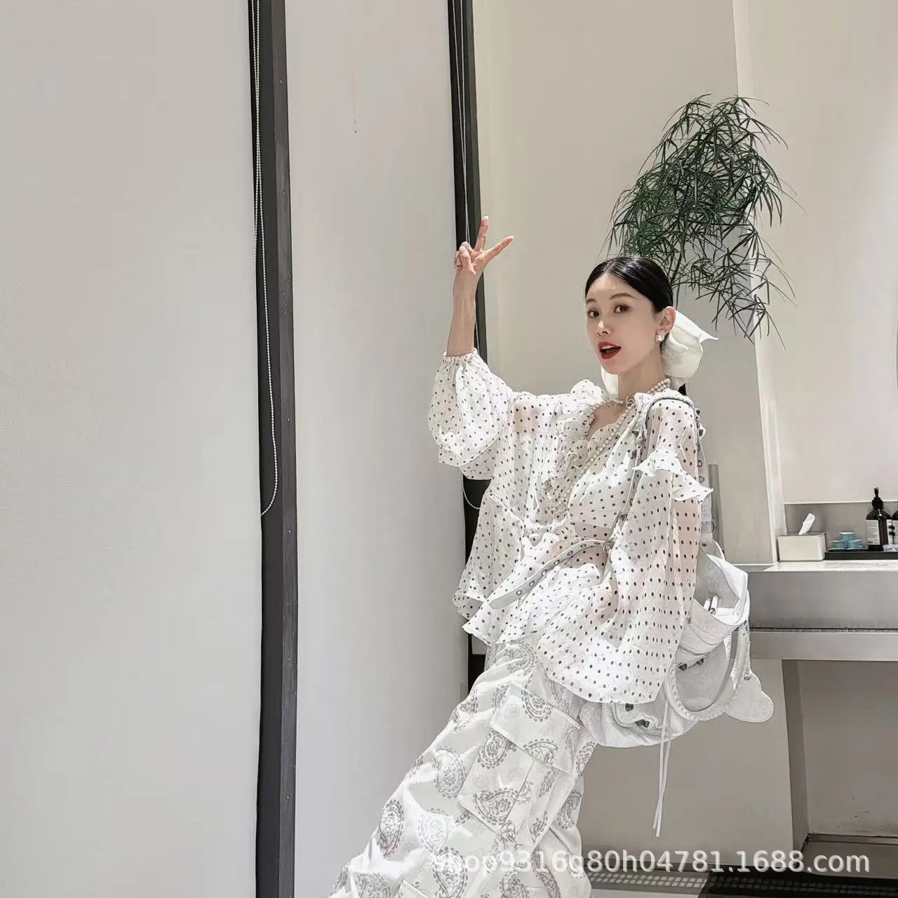 Nanyou 고급 버전 틈새 디자인 오리지널 브랜드 폴카 도트 프린트 러플 자외선 차단 셔츠 쉬폰 셔츠 투피스 세트