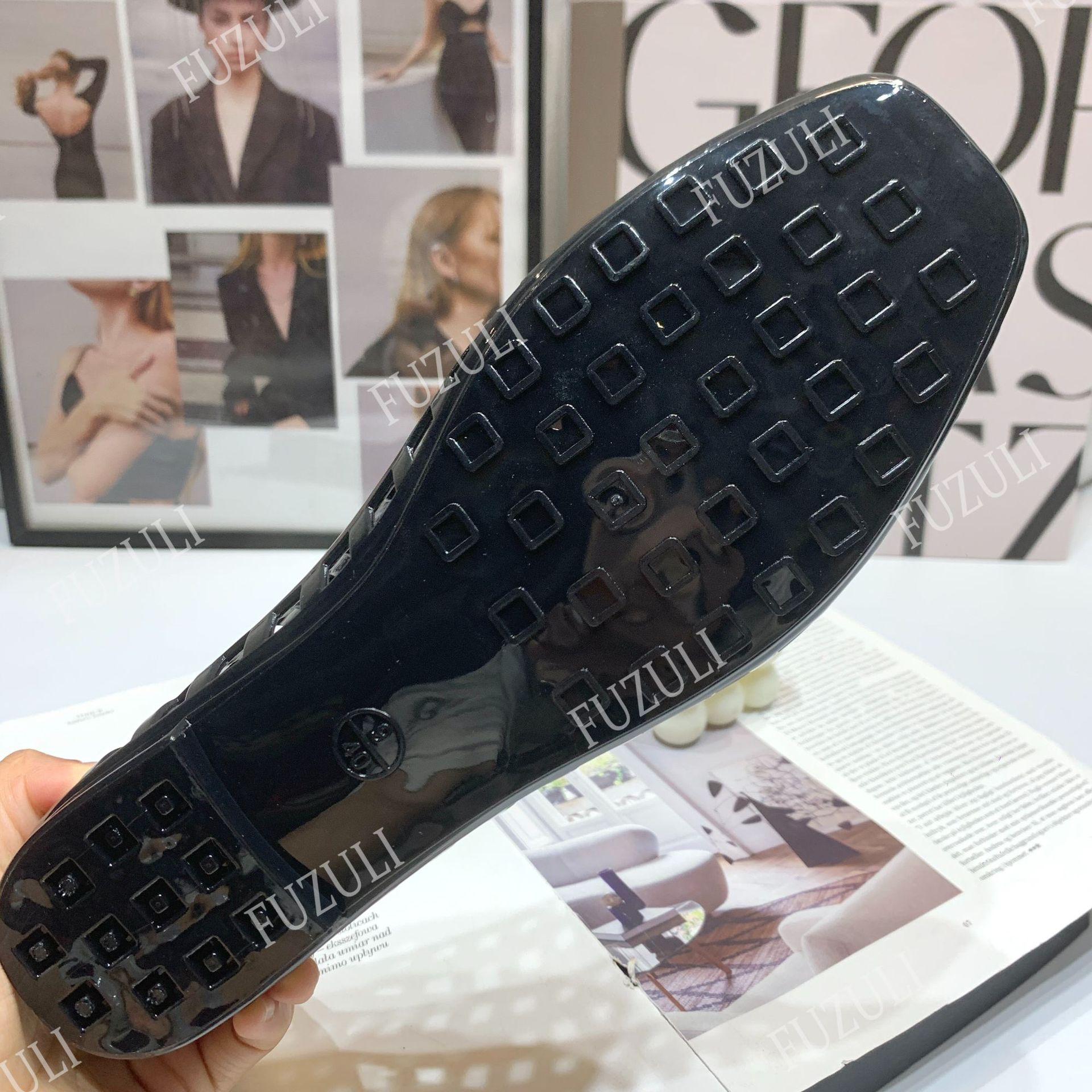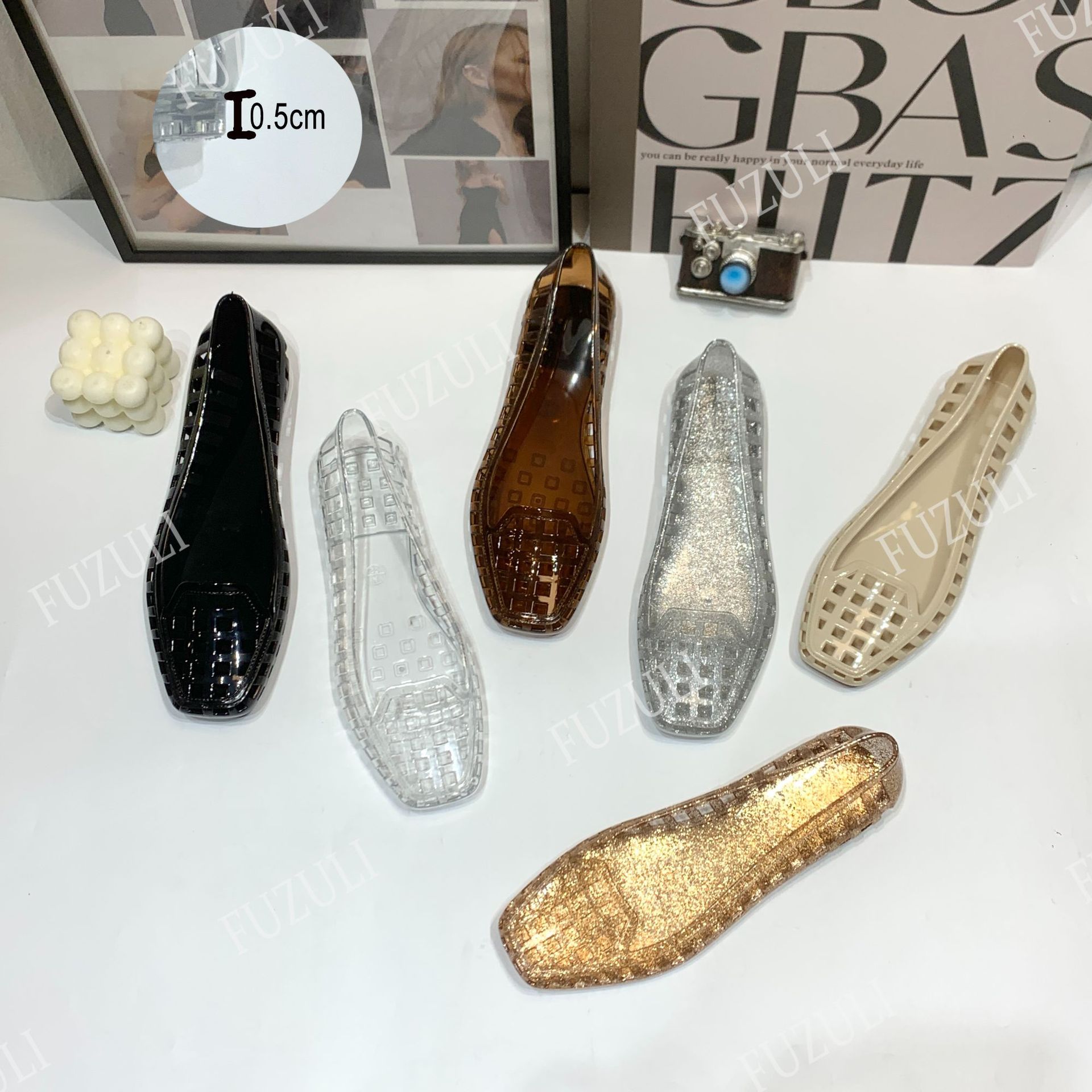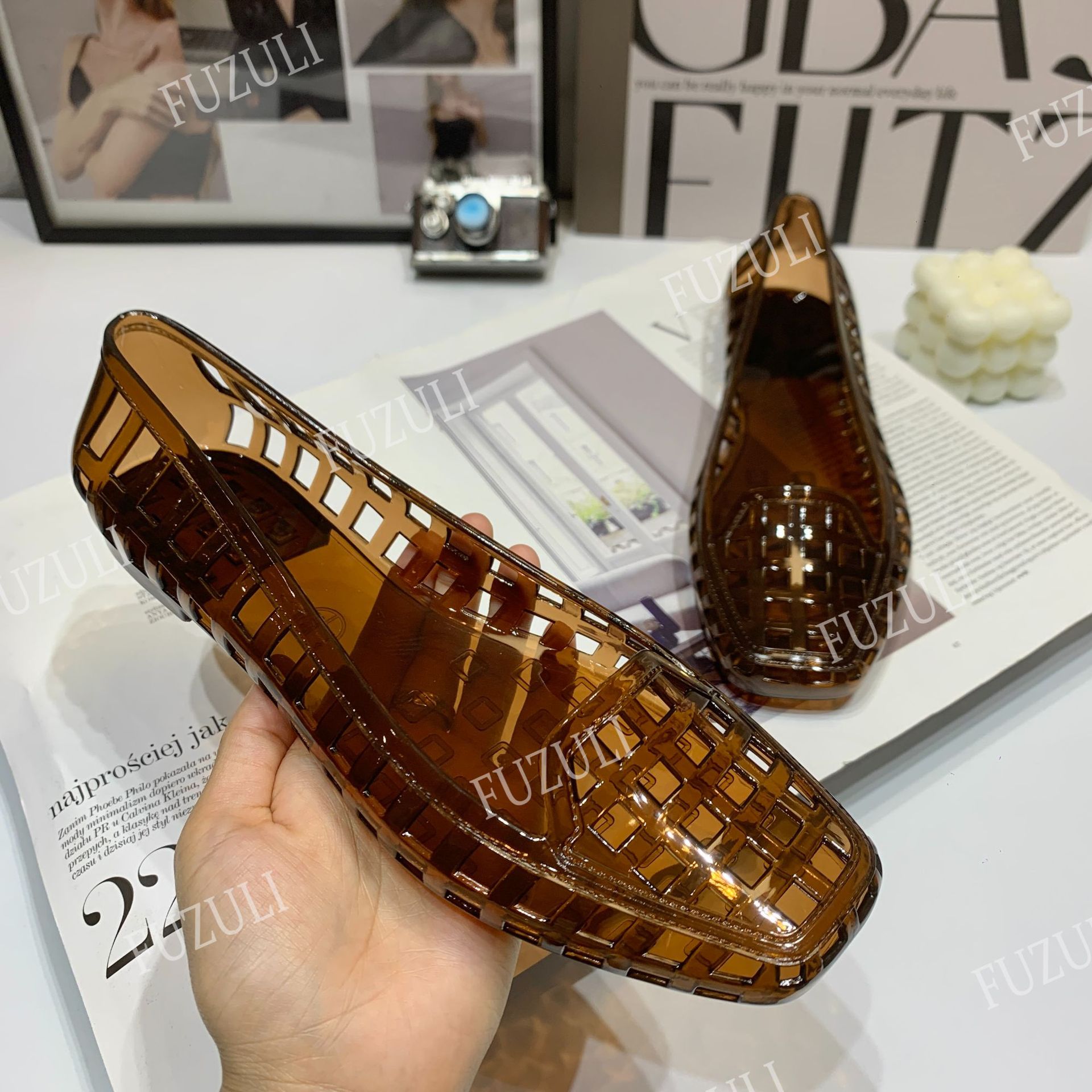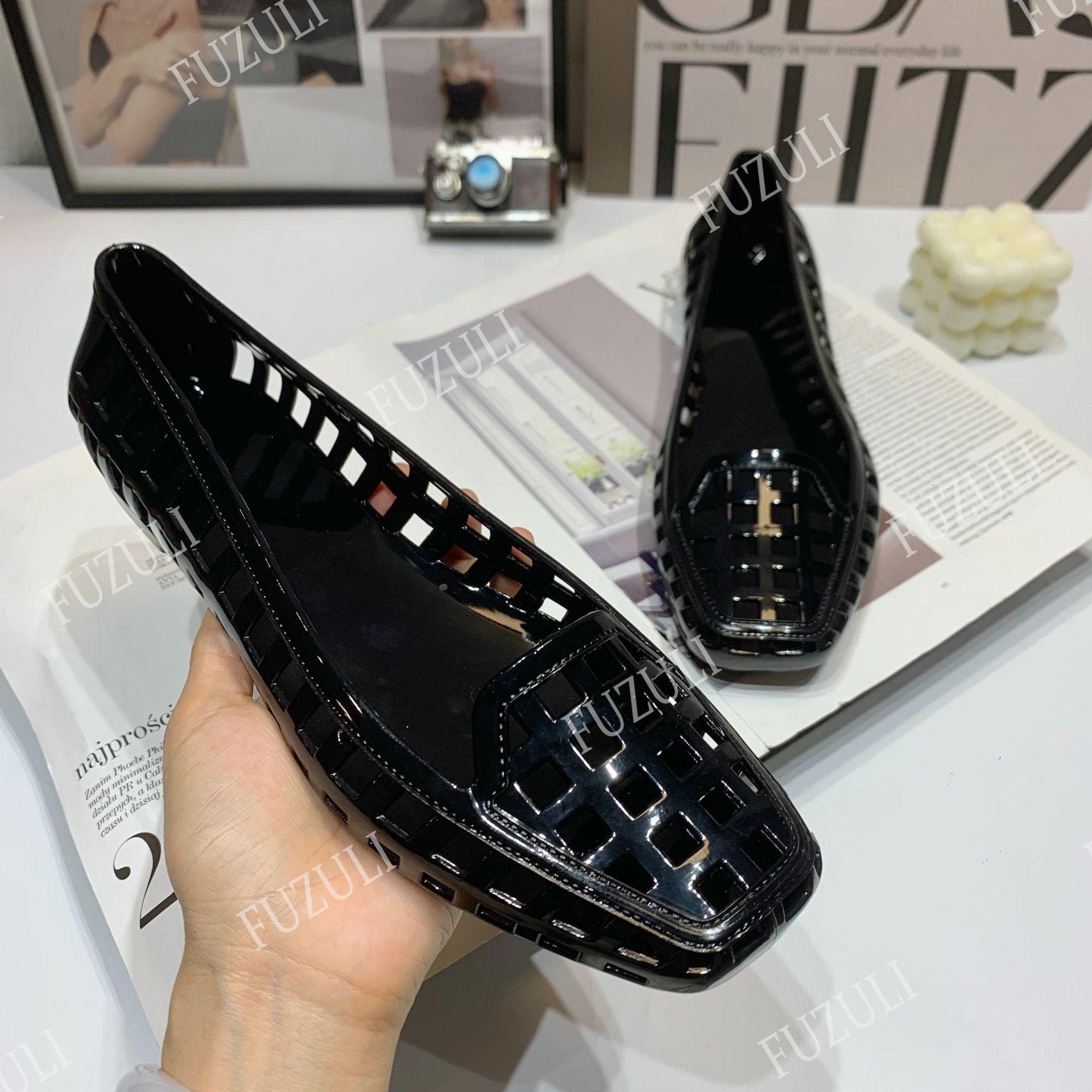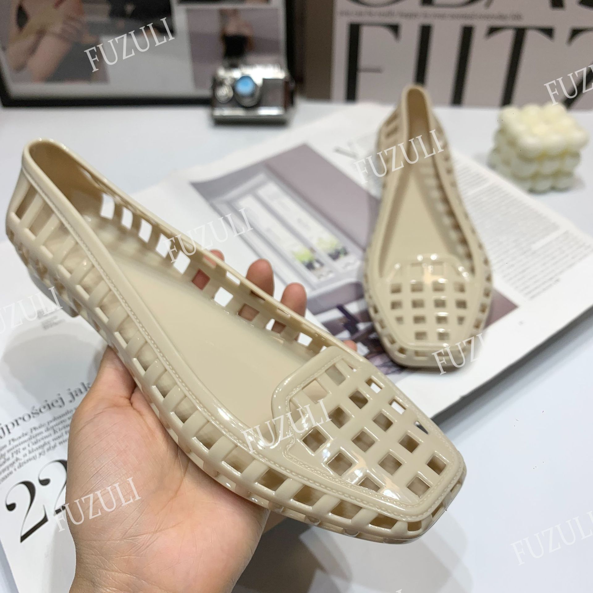여성을 위한 새로운 한국식 젤리 슈즈, 패셔너블한 펌프스, 중공 사각 발가락 플랫 슈즈, 투명한 게으른 캐주얼 슬립온 슈즈스토어 가기