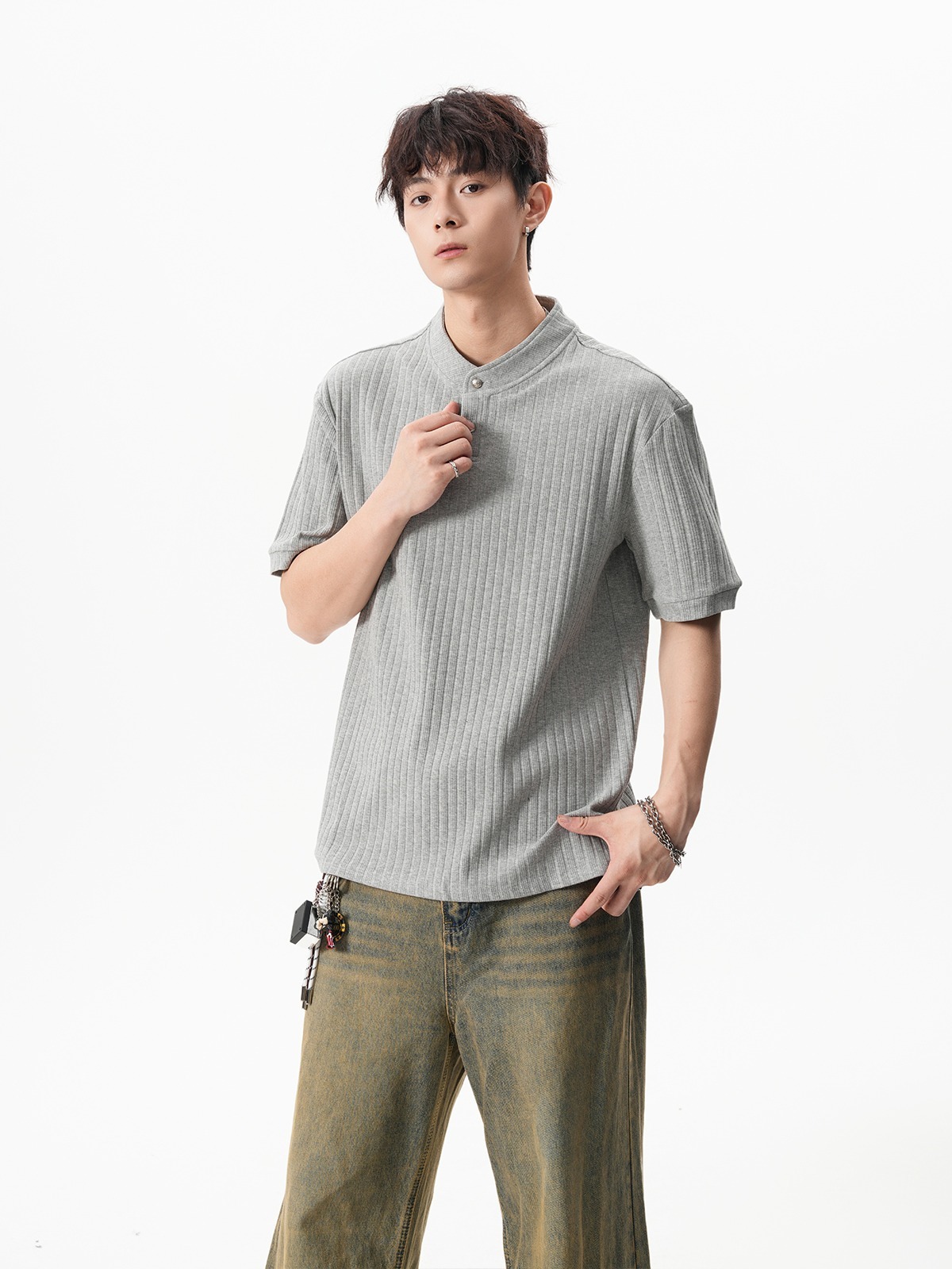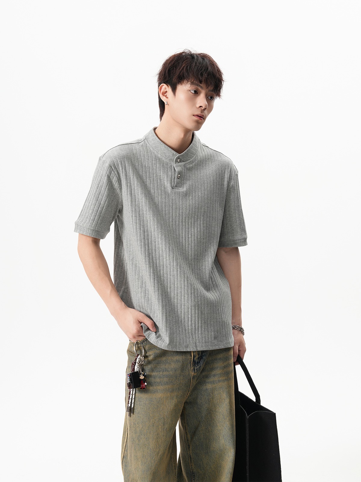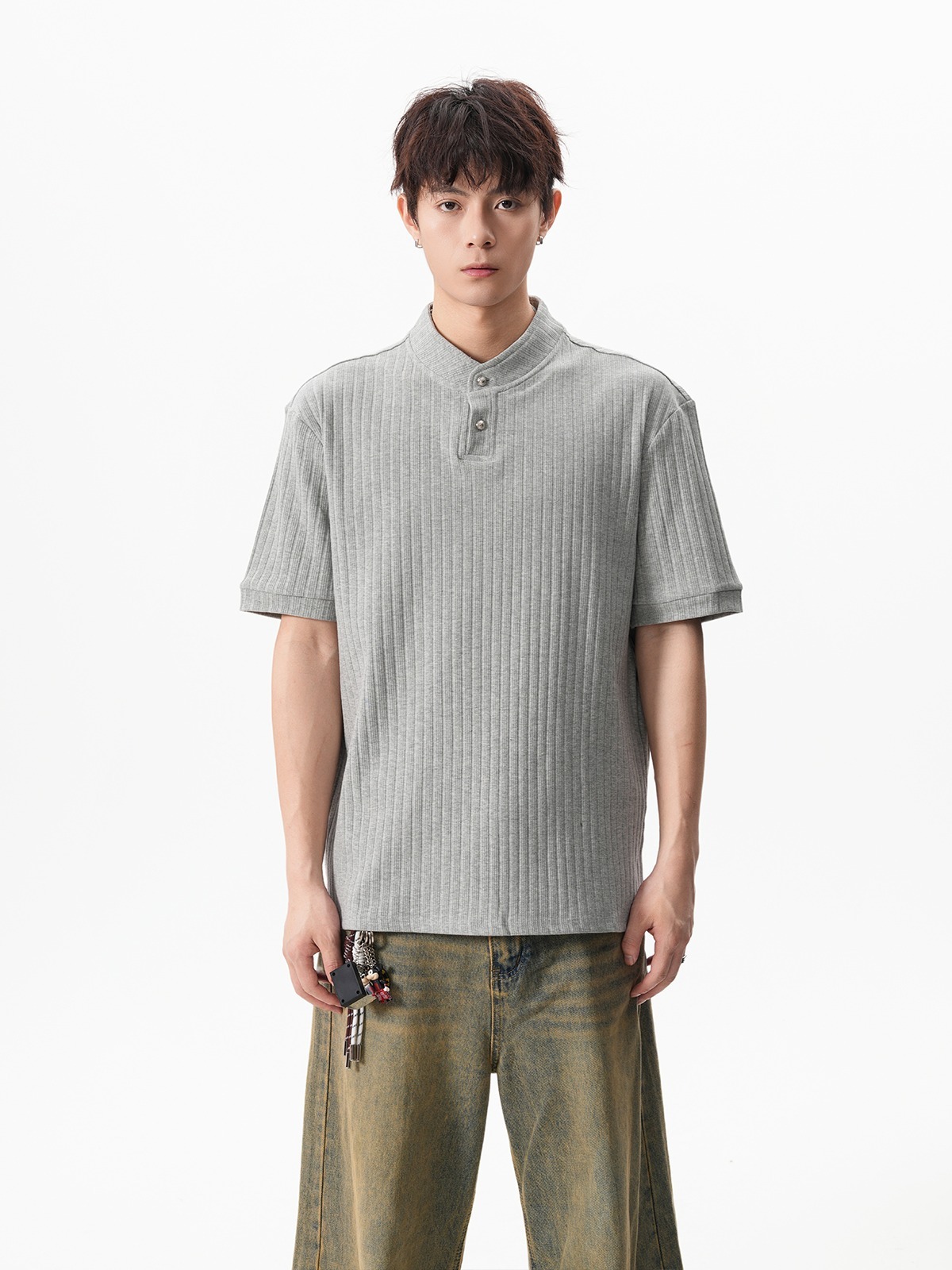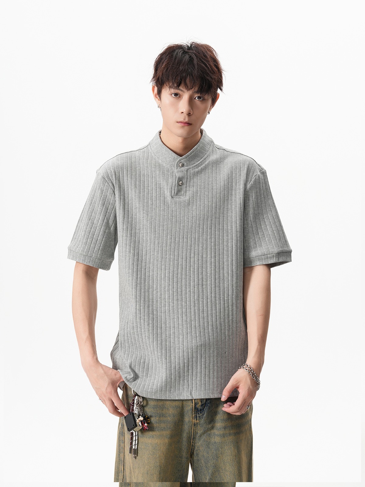 그레이 헨리넥 니트 반팔 남성 여름 올드 머니 스타일 질감 오른쪽 어깨 티셔츠 클린핏 5부 소매