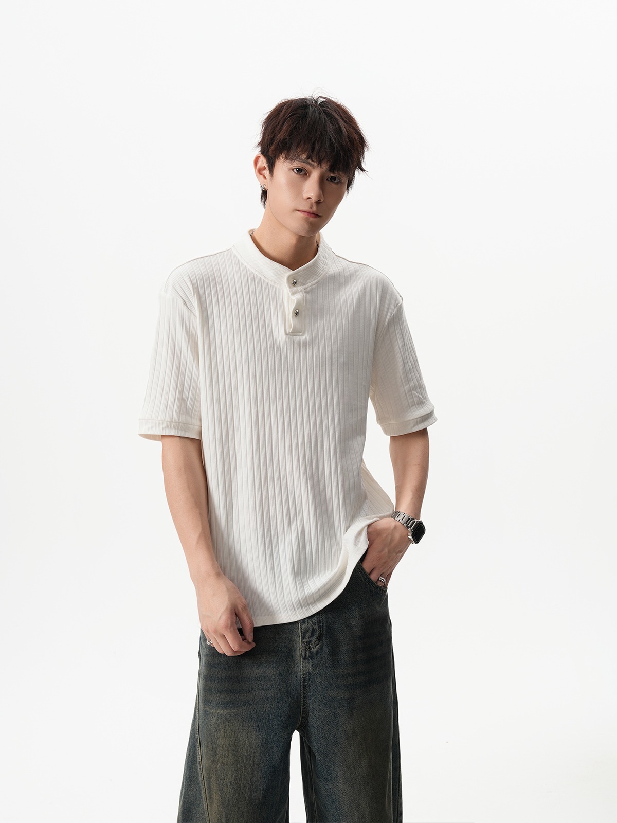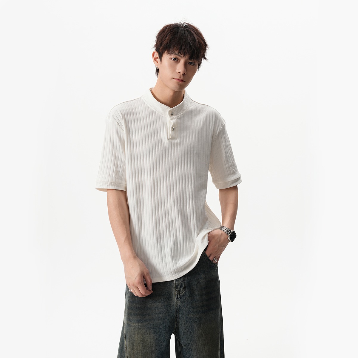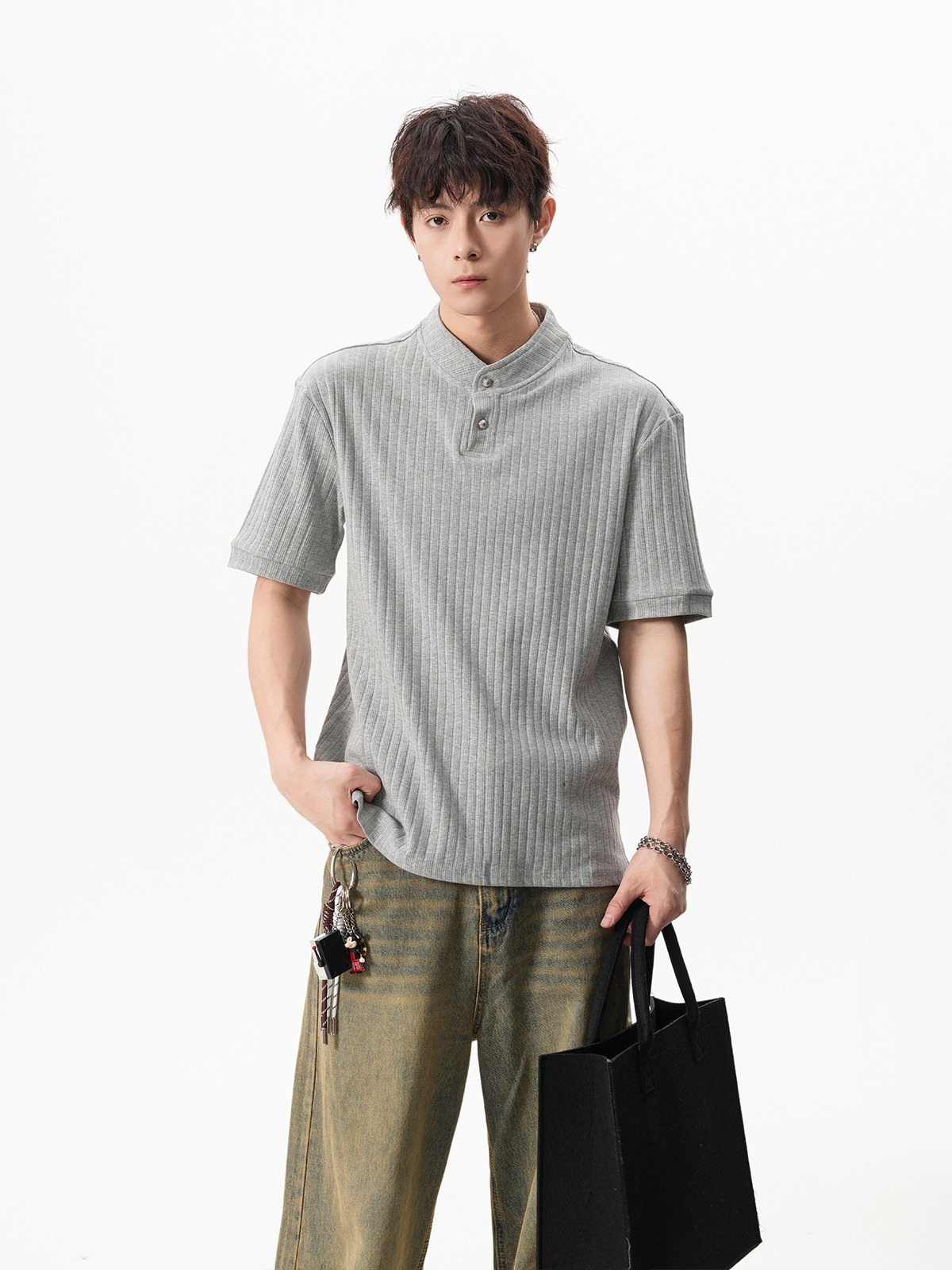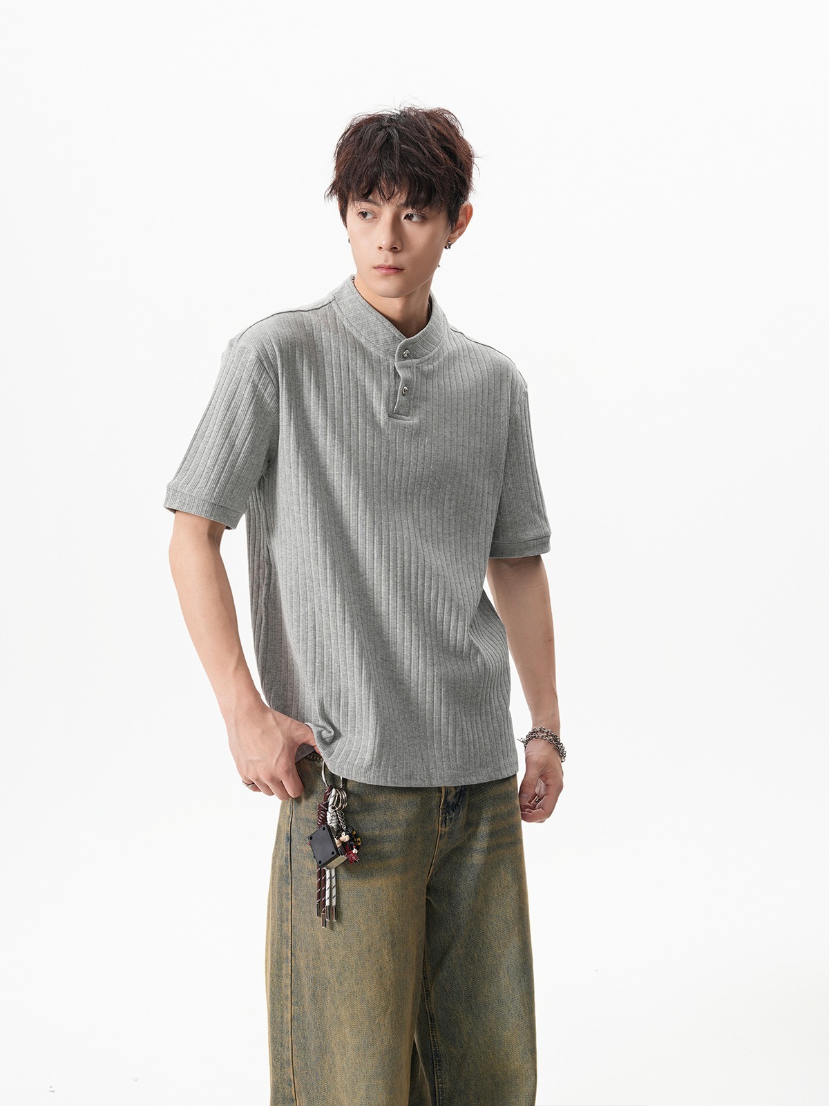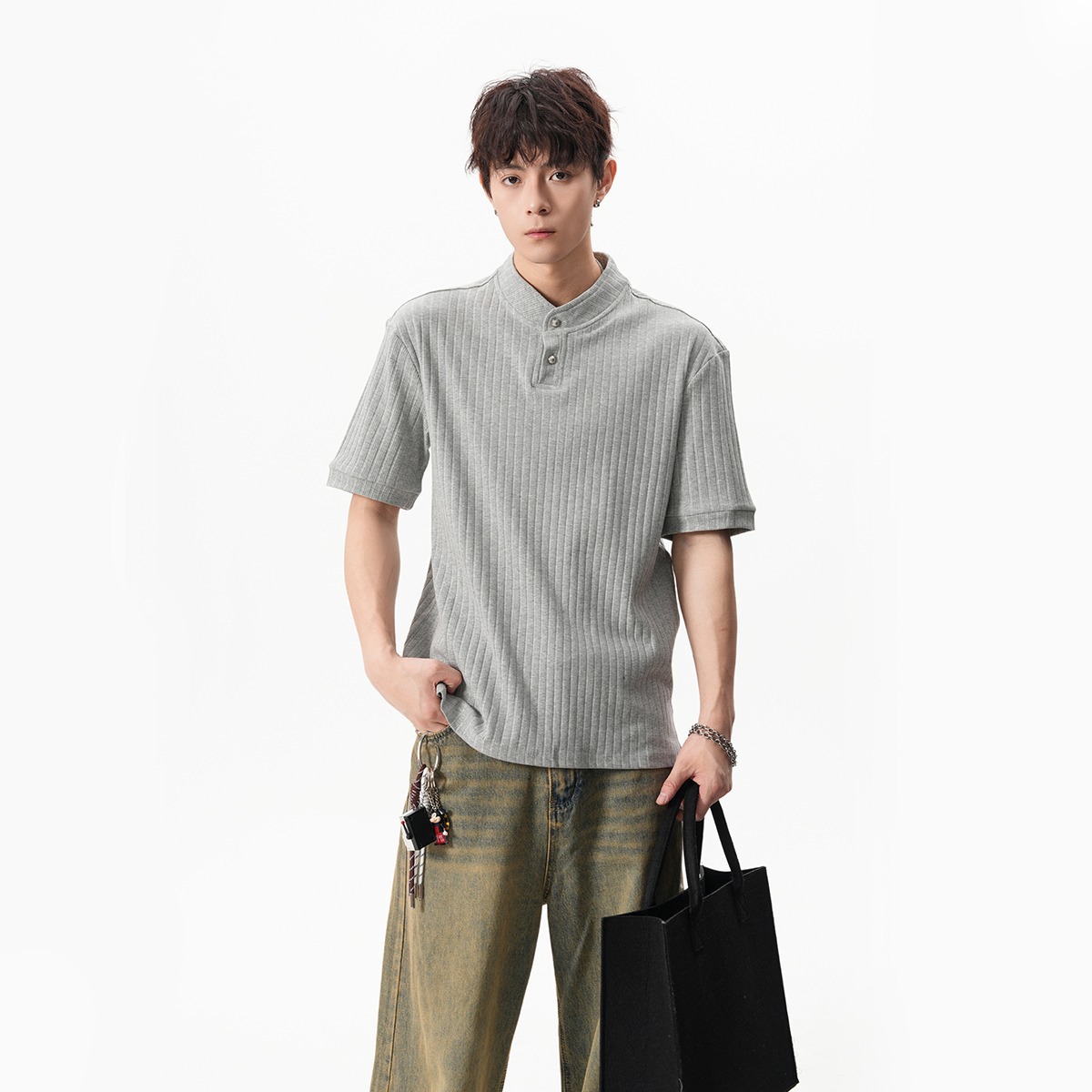 그레이 헨리넥 니트 반팔 남성 여름 올드 머니 스타일 질감 오른쪽 어깨 티셔츠 클린핏 5부 소매