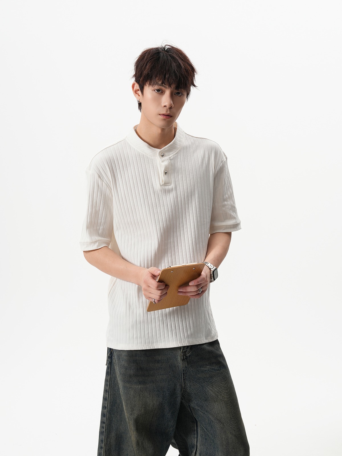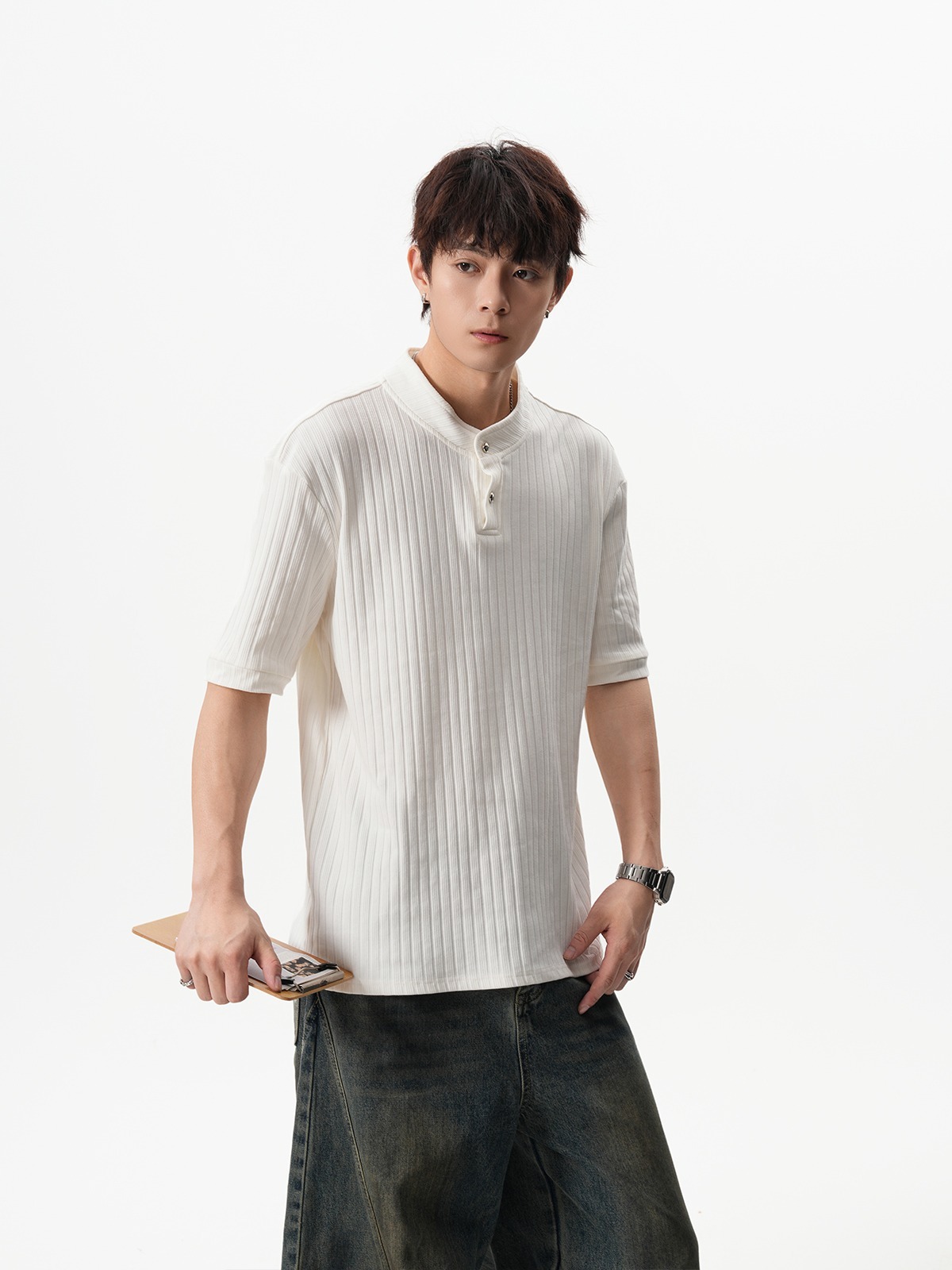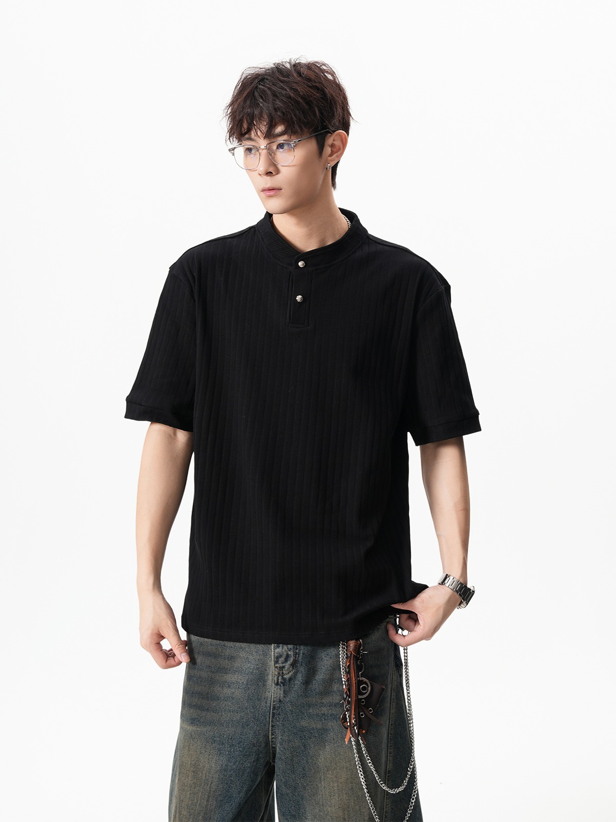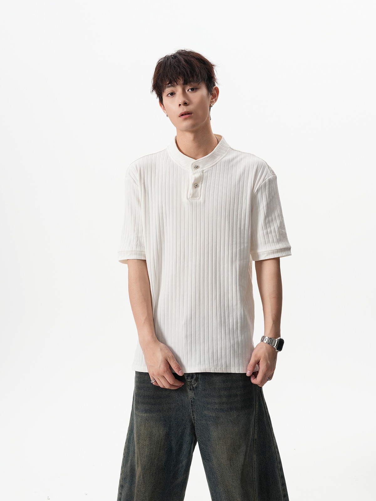 그레이 헨리넥 니트 반팔 남성 여름 올드 머니 스타일 질감 오른쪽 어깨 티셔츠 클린핏 5부 소매
