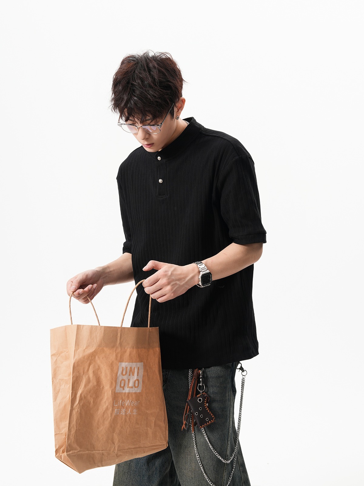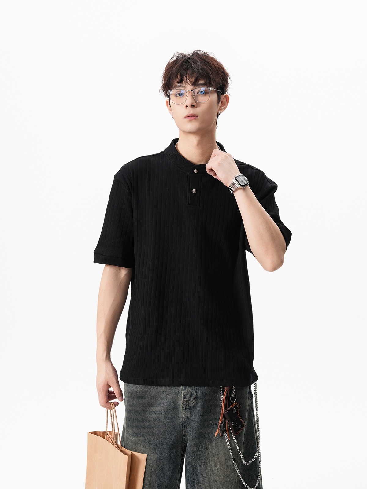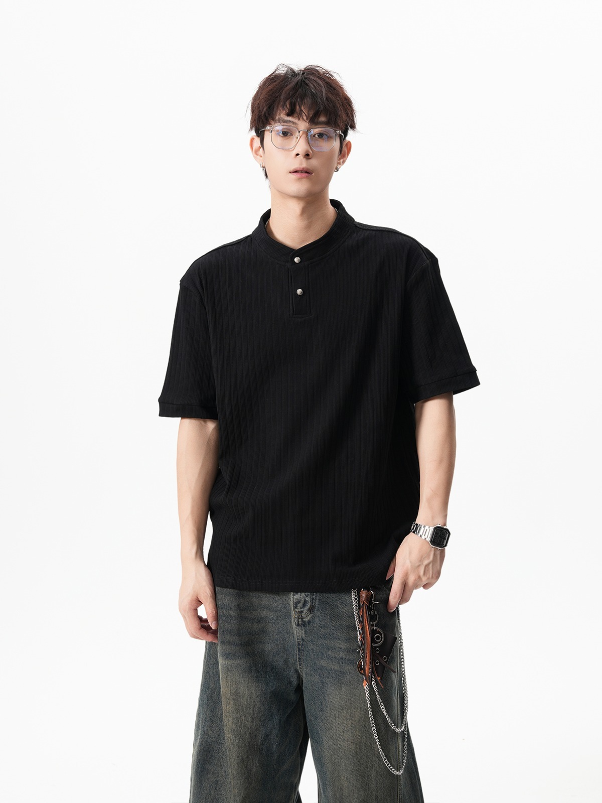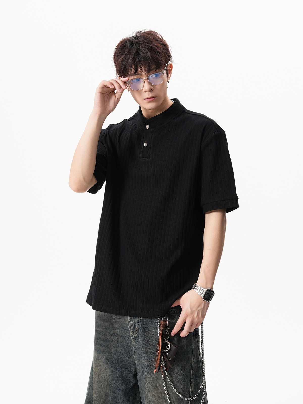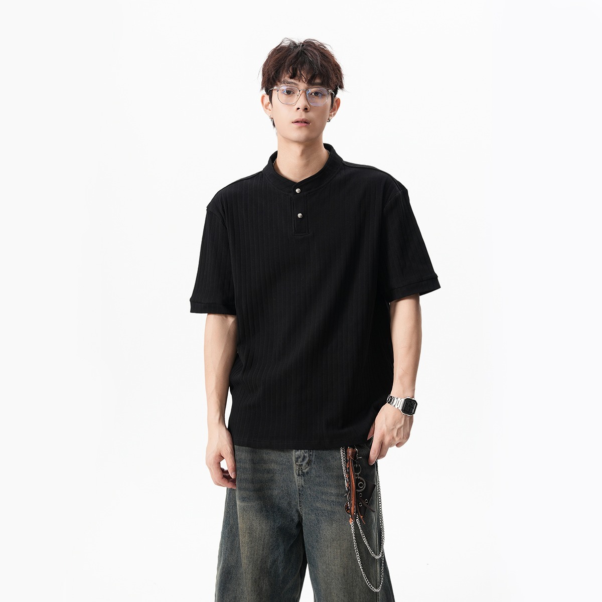 그레이 헨리넥 니트 반팔 남성 여름 올드 머니 스타일 질감 오른쪽 어깨 티셔츠 클린핏 5부 소매