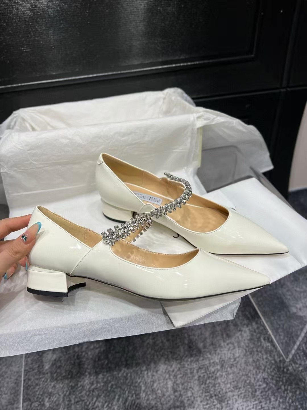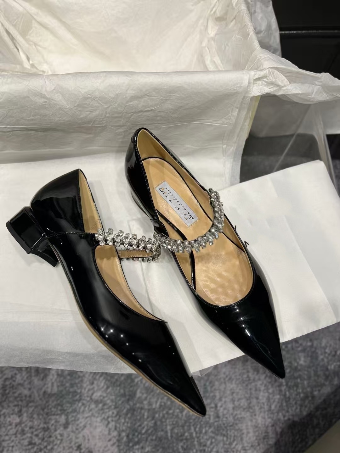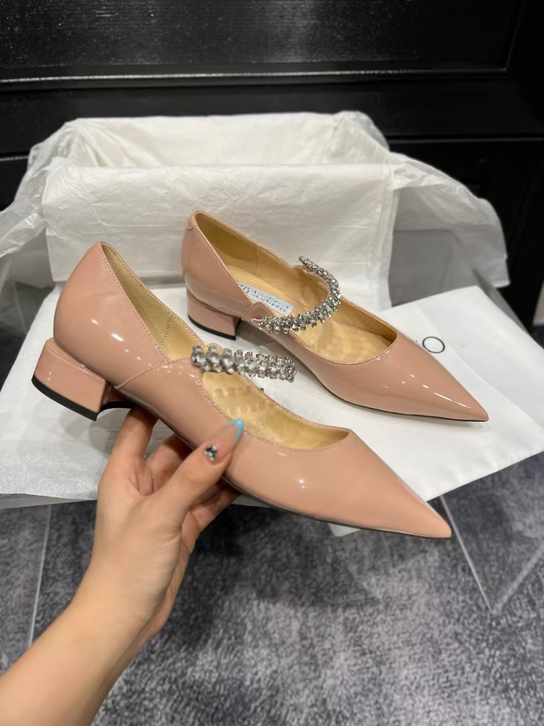 2024 유럽과 미국의 새로운 스타일의 패셔너블하고 편안하며 다재다능한 여성용 라인스톤 페이턴트 가죽 솔리드 컬러 포인티드 토 페이스트 블록 힐 슈즈스토어 가기