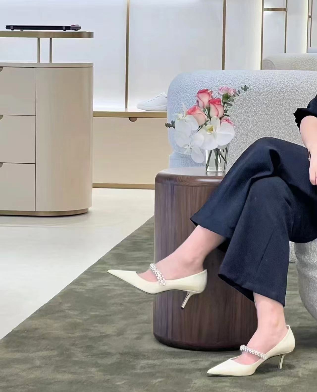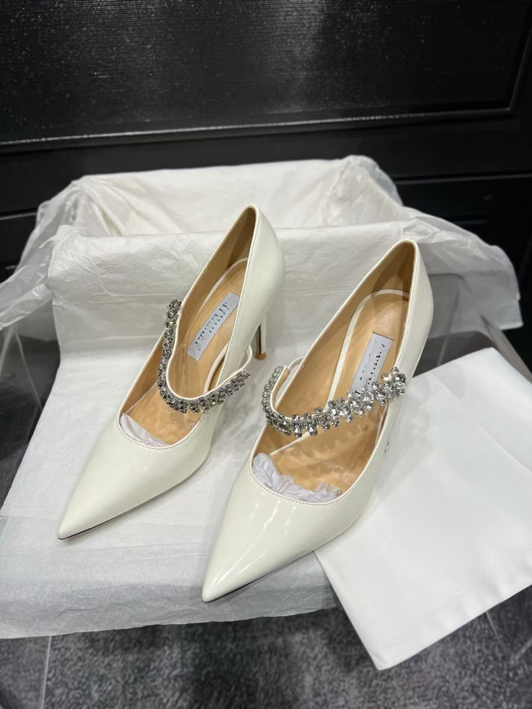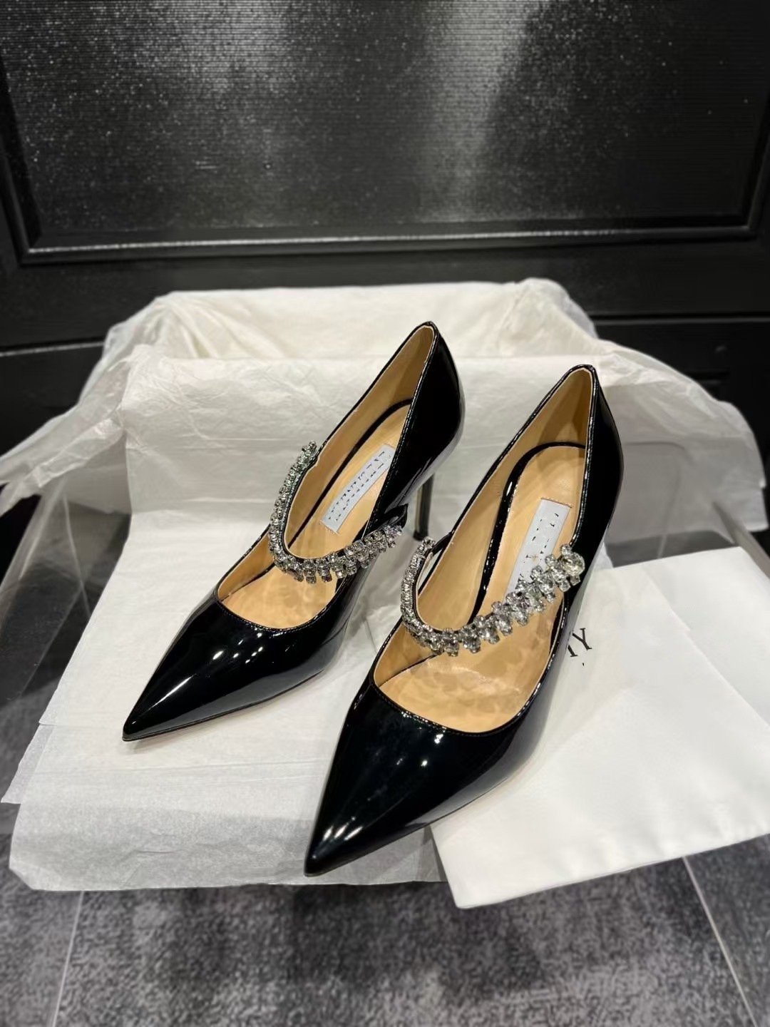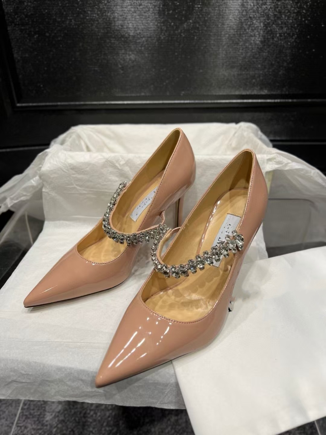 2024 유럽과 미국의 새로운 스타일의 패셔너블하고 편안하며 다재다능한 여성용 라인스톤 페이턴트 가죽 솔리드 컬러 포인티드 토 페이스트 블록 힐 슈즈스토어 가기