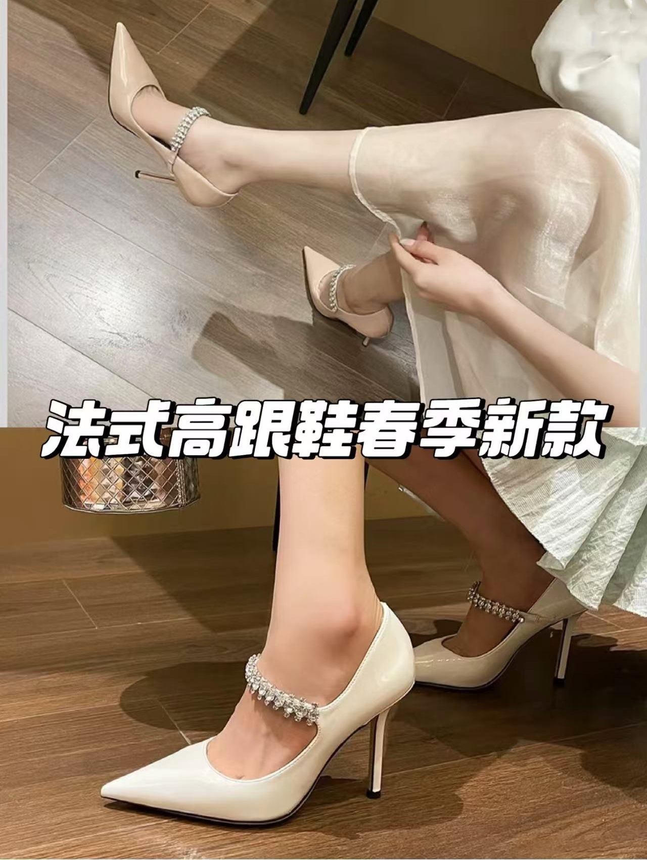 2024 유럽과 미국의 새로운 스타일의 패셔너블하고 편안하며 다재다능한 여성용 라인스톤 페이턴트 가죽 솔리드 컬러 포인티드 토 페이스트 블록 힐 슈즈