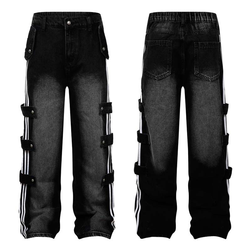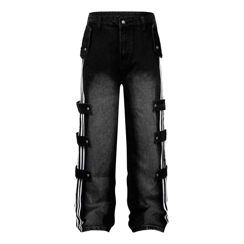 아메리칸 스트리트 트렌디 워싱 스트랩 스트라이프 디자인 남녀공용 스트레이트 청바지 트렌디 브랜드 루즈 캐주얼 와이드 팬츠