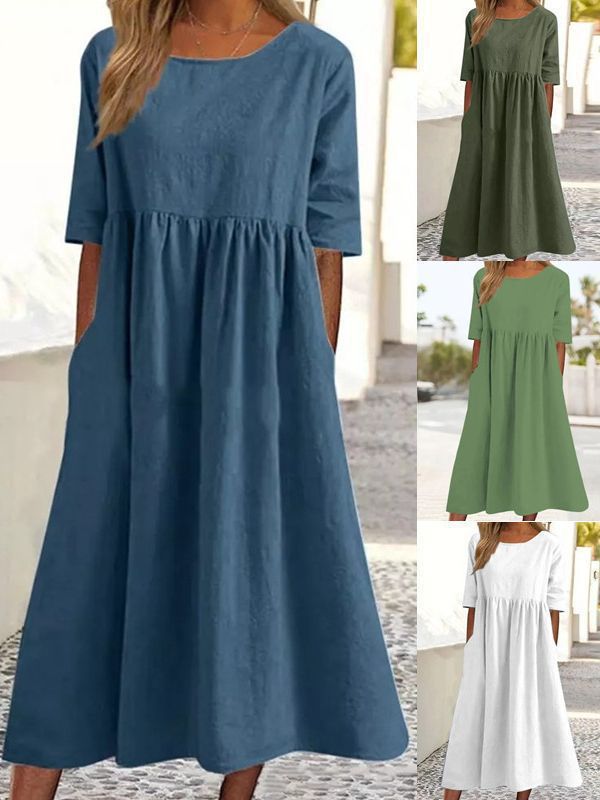 2025 여름 아마존 독립 스테이션 신상 코튼 린넨 캐주얼 반소매 포켓 플리츠 루즈 라운드 넥 드레스
