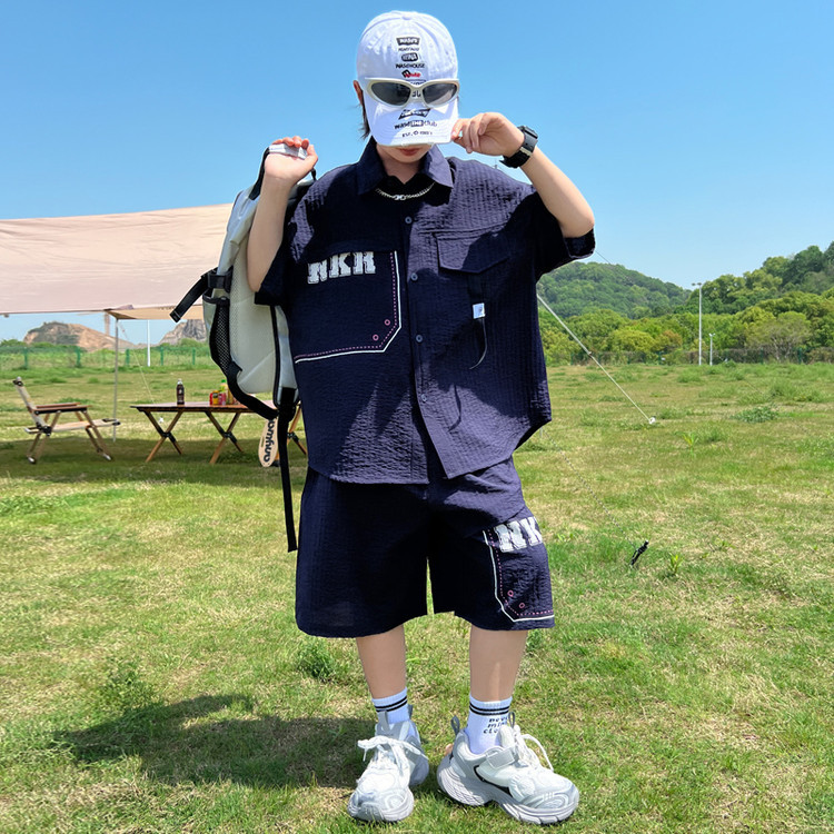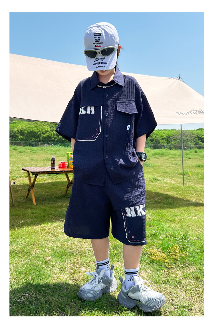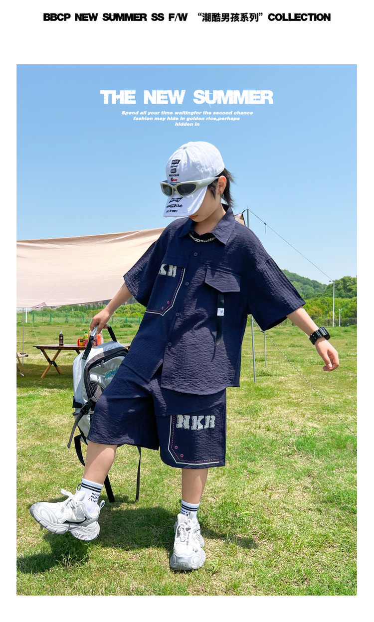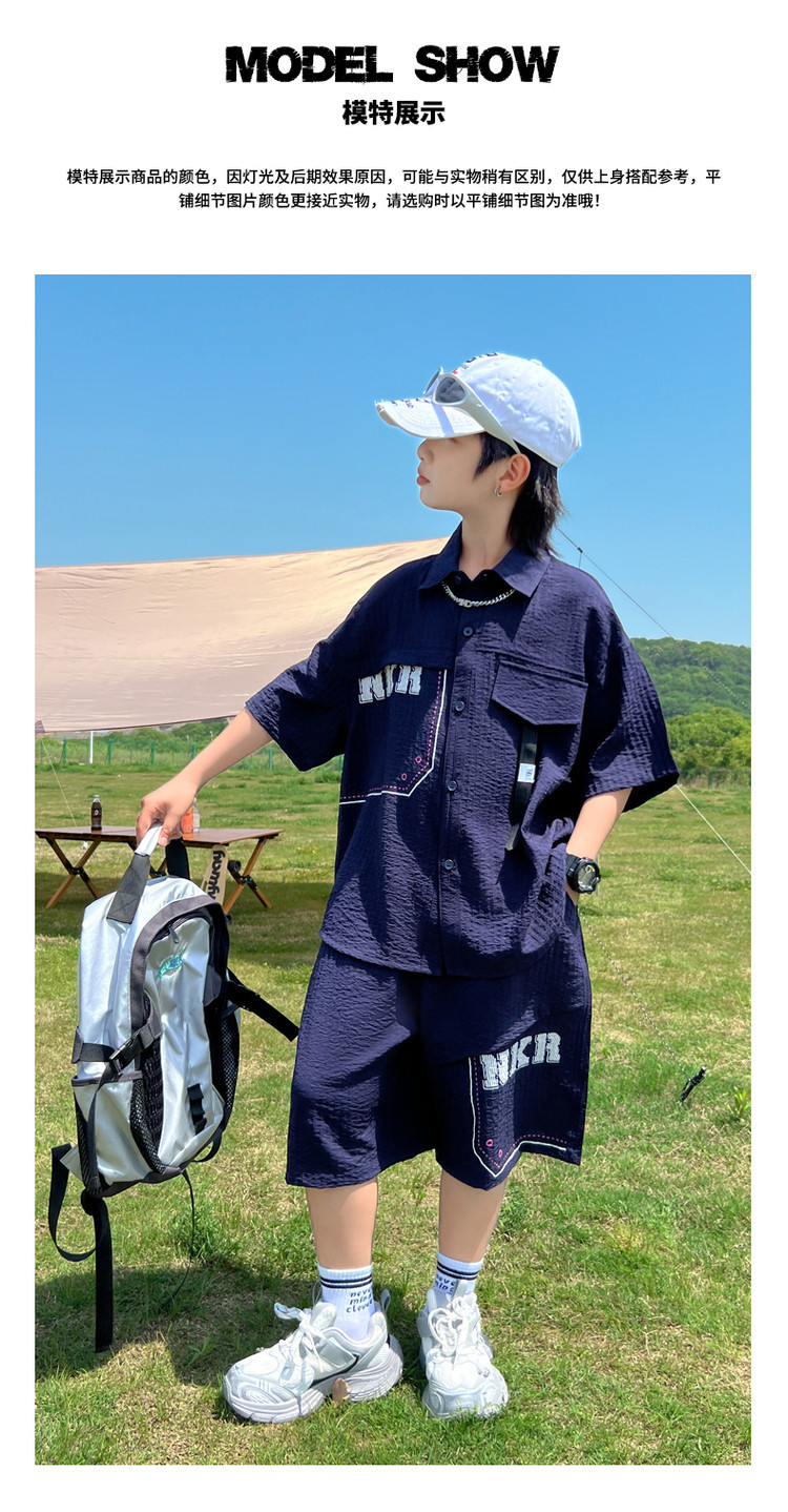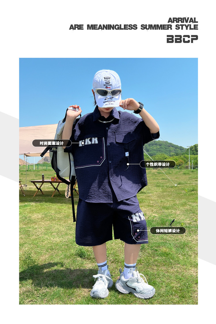 소년 반팔 셔츠 정장 여름 한국 스타일 큰 어린이 패션 작업복 스타일 캐주얼 루즈 소년 투피스 세트 Dropshipping