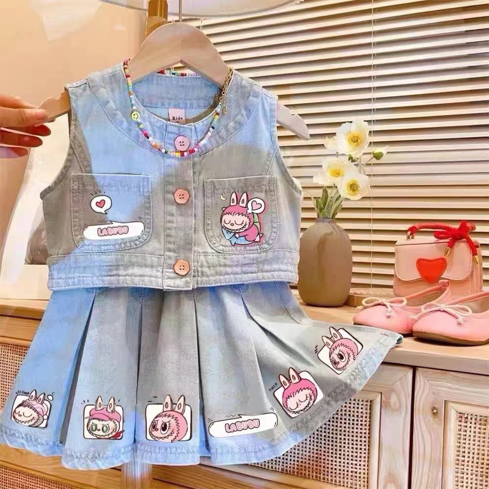 만화 패턴 소녀 정장 2025 여름 새로운 어린이 유행 조끼 스커트 투피스 세트 아기 유행스토어 가기
