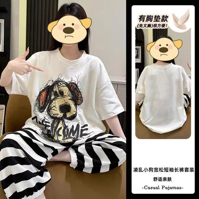 여성용 가슴 패드가있는 잠옷 여름 얇은 구름면 한국어 버전 만화 대형 반팔 바지 소녀 정장 홈웨어스토어 가기
