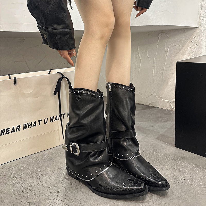 여성용 뾰족한 웨스턴 카우보이 부츠, 두꺼운 굽, 2025년 신형 니치 V자형 나이트 부츠, 대형 리벳 미드 튜브 팬츠 부츠스토어 가기
