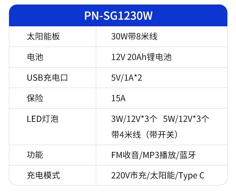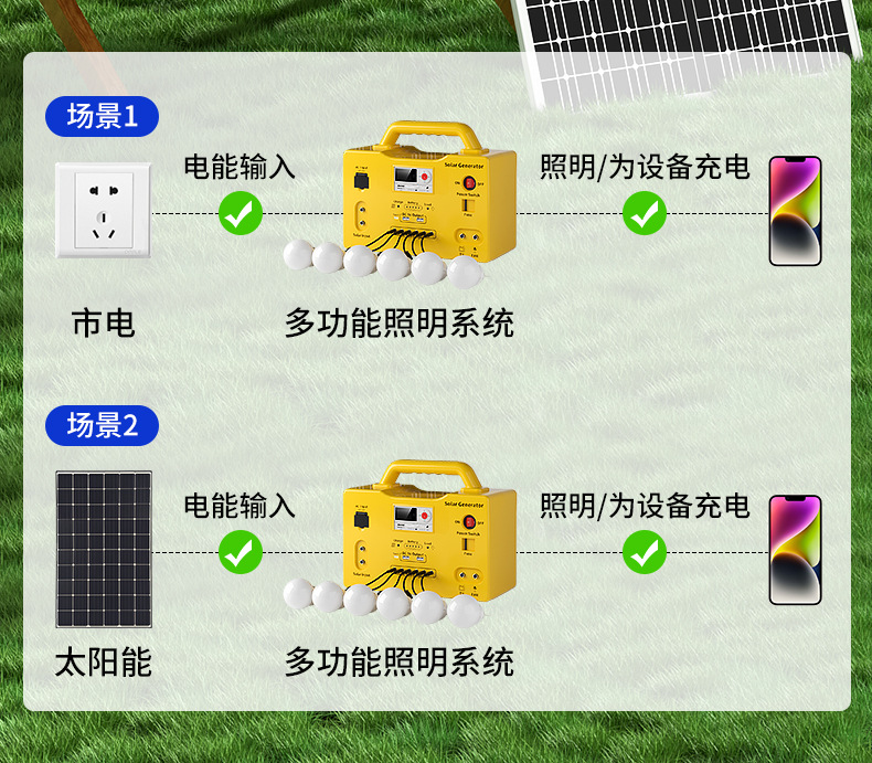 • 12V20Ah 휴대용 전원 공급 장치 + 30W(태양광 패널) + 전구 6개